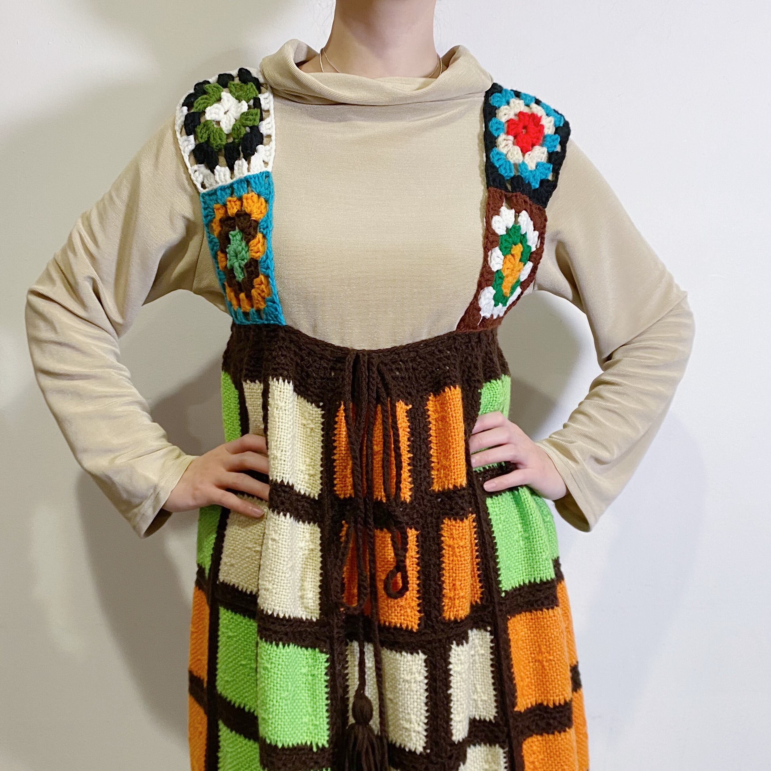 ブラウンベースにオレンジやグリーンの色合わせが可愛い、70年代のグラニーニットワンピースです。