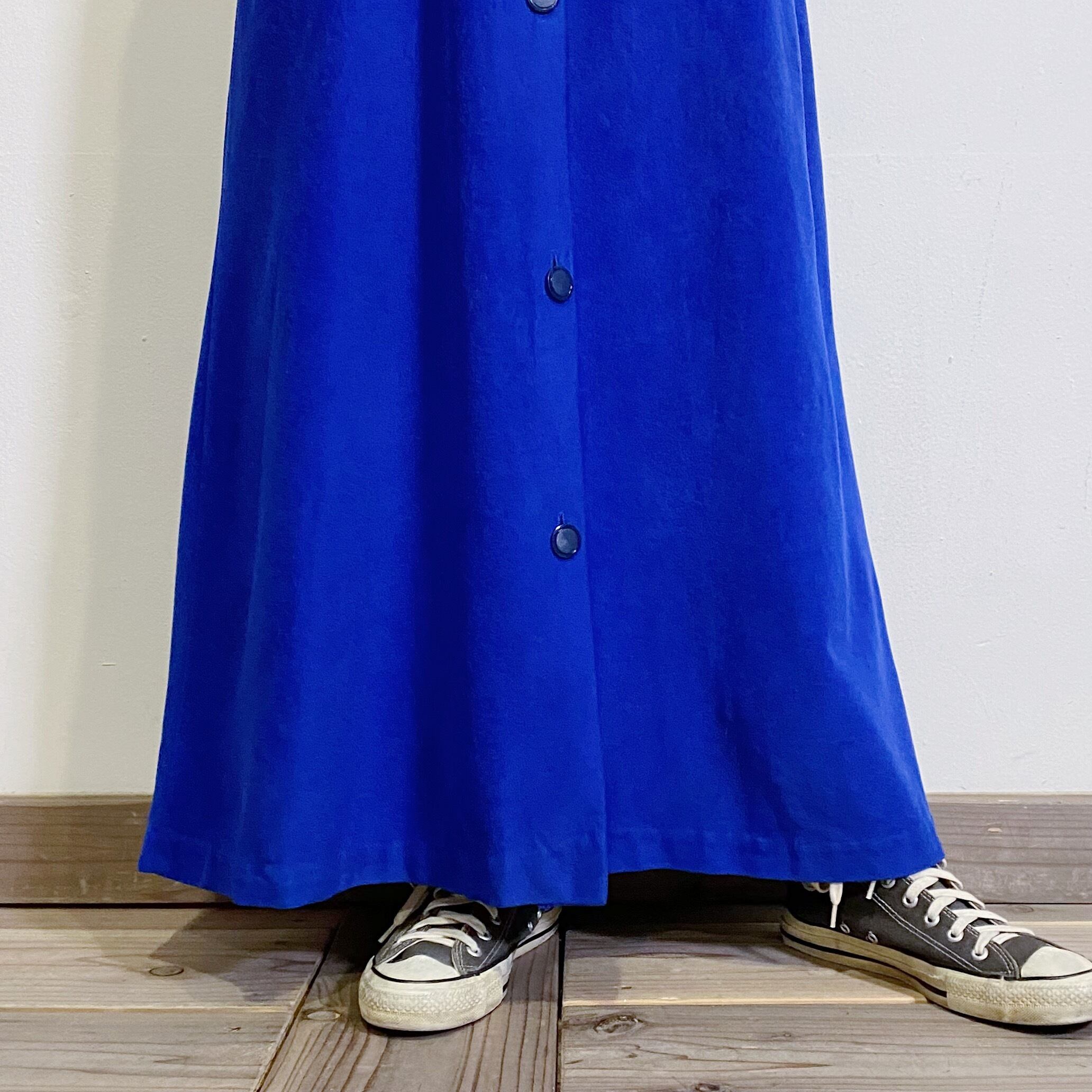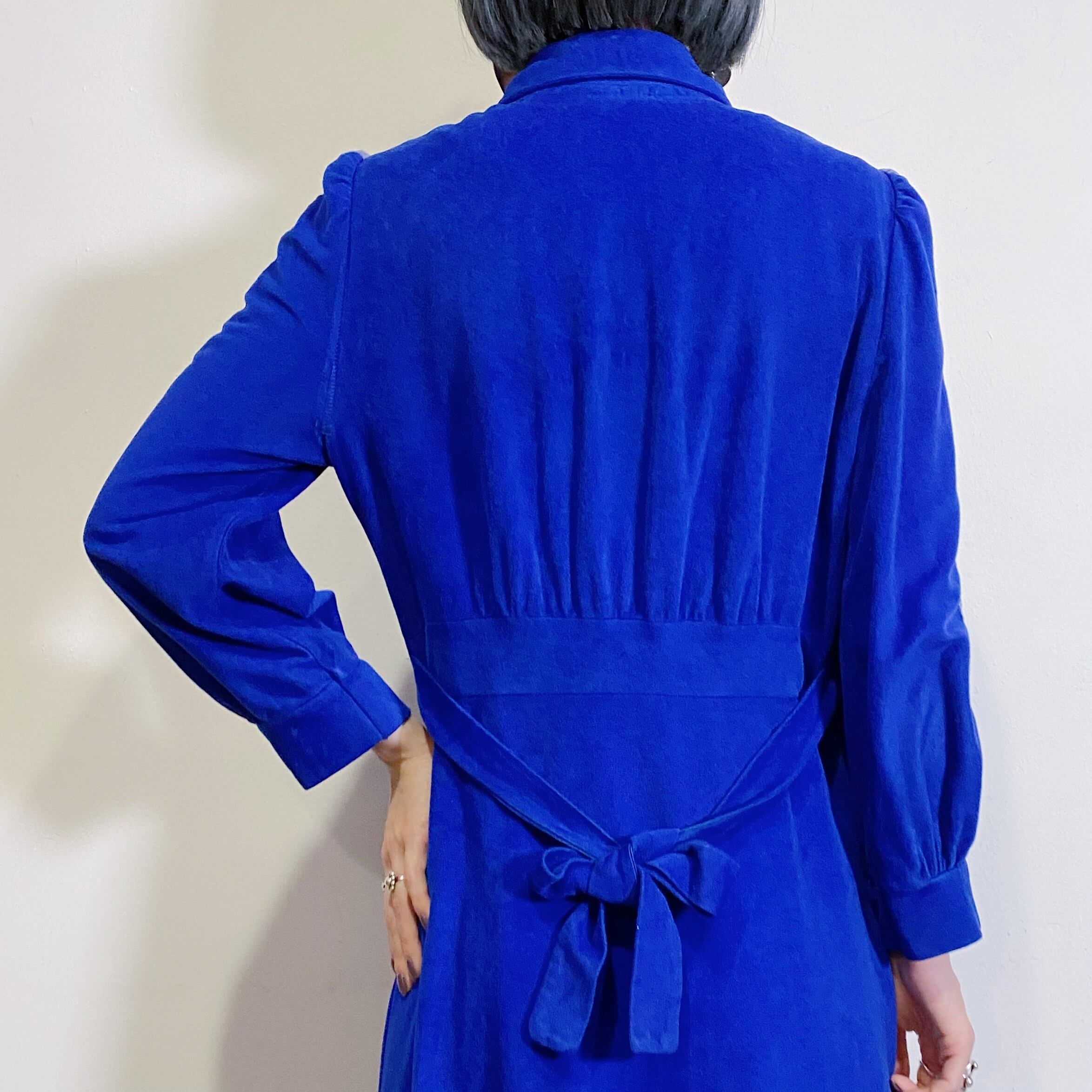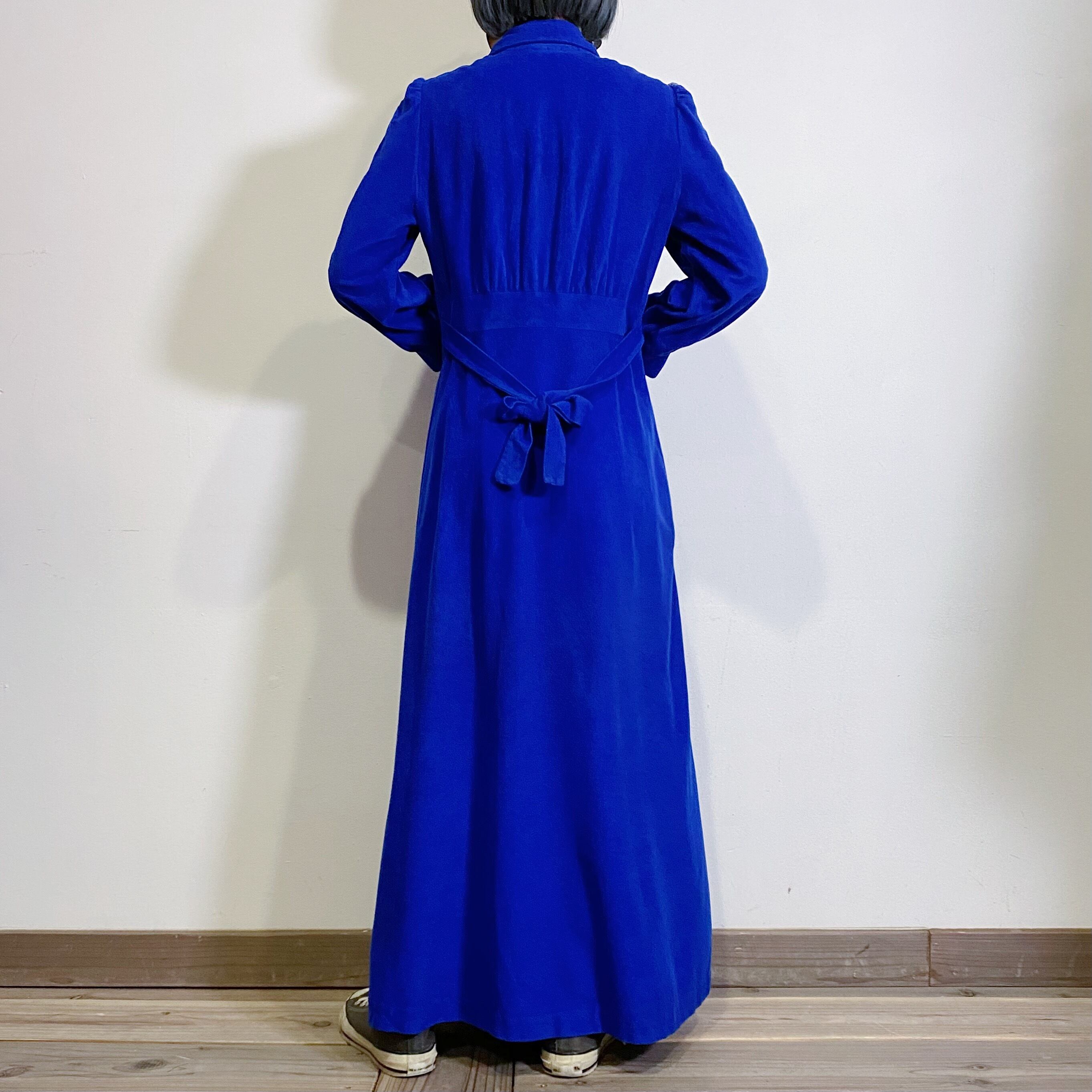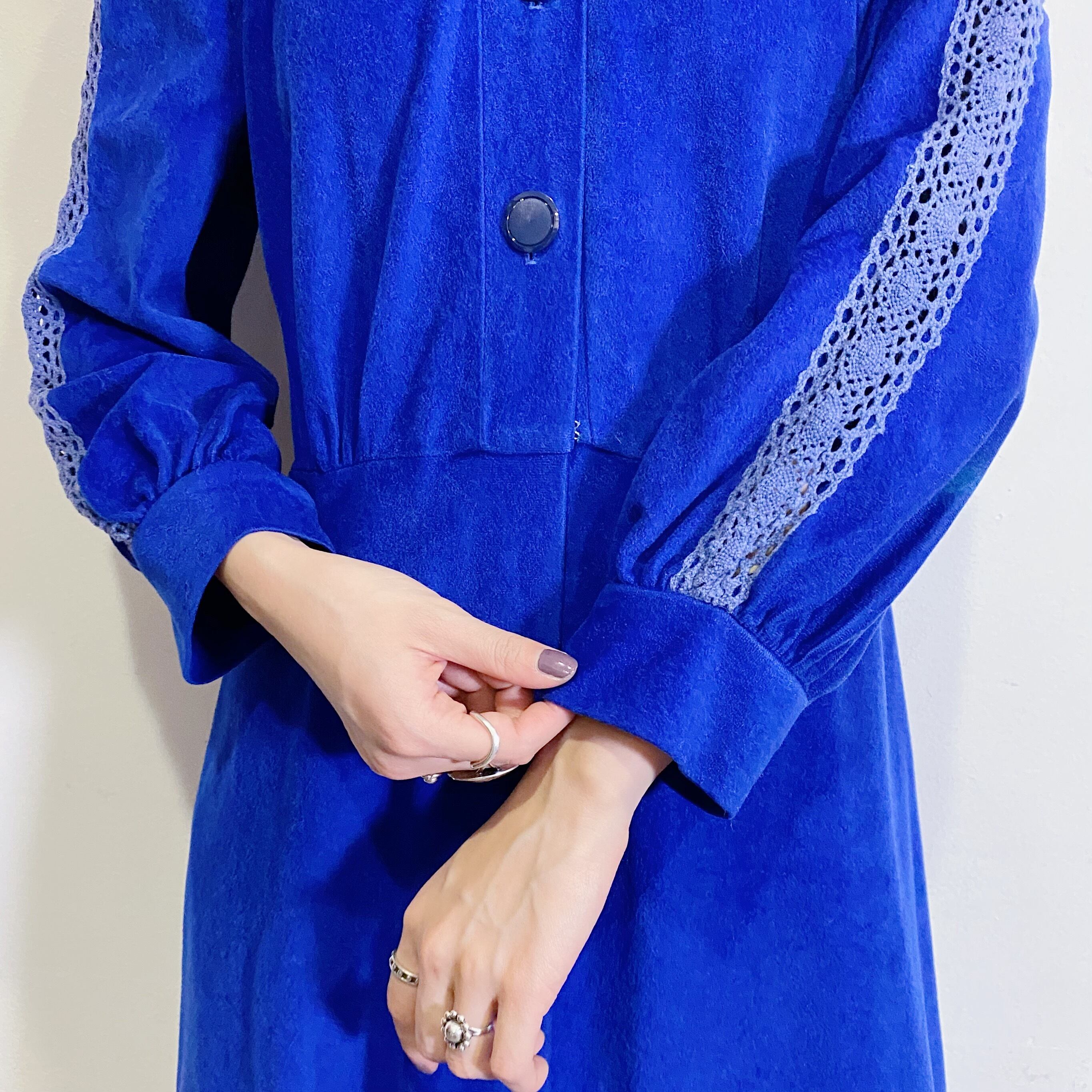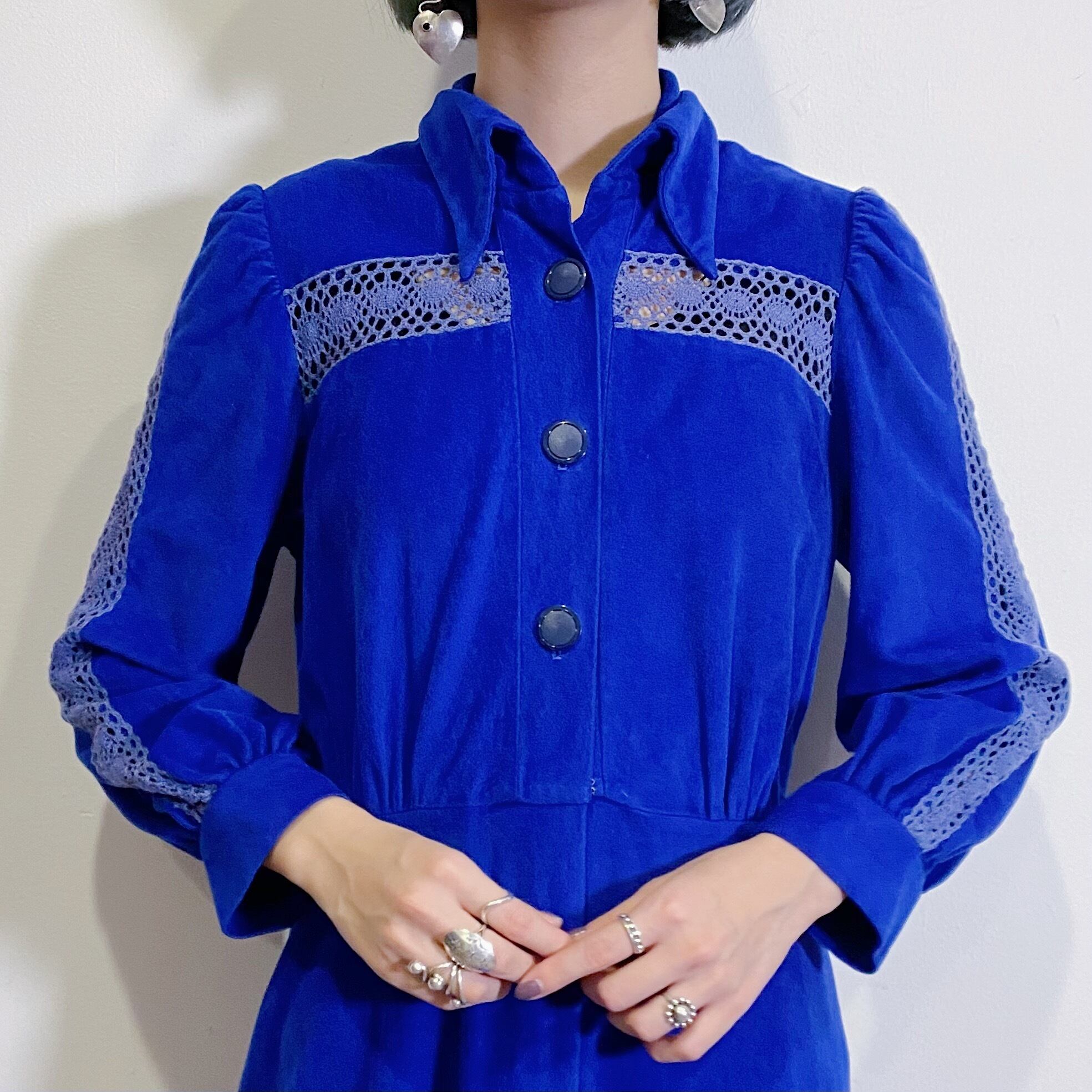 鮮やかなブルーベースに、首元とお袖のレースが可愛い70年代のシャツワンピースです。
