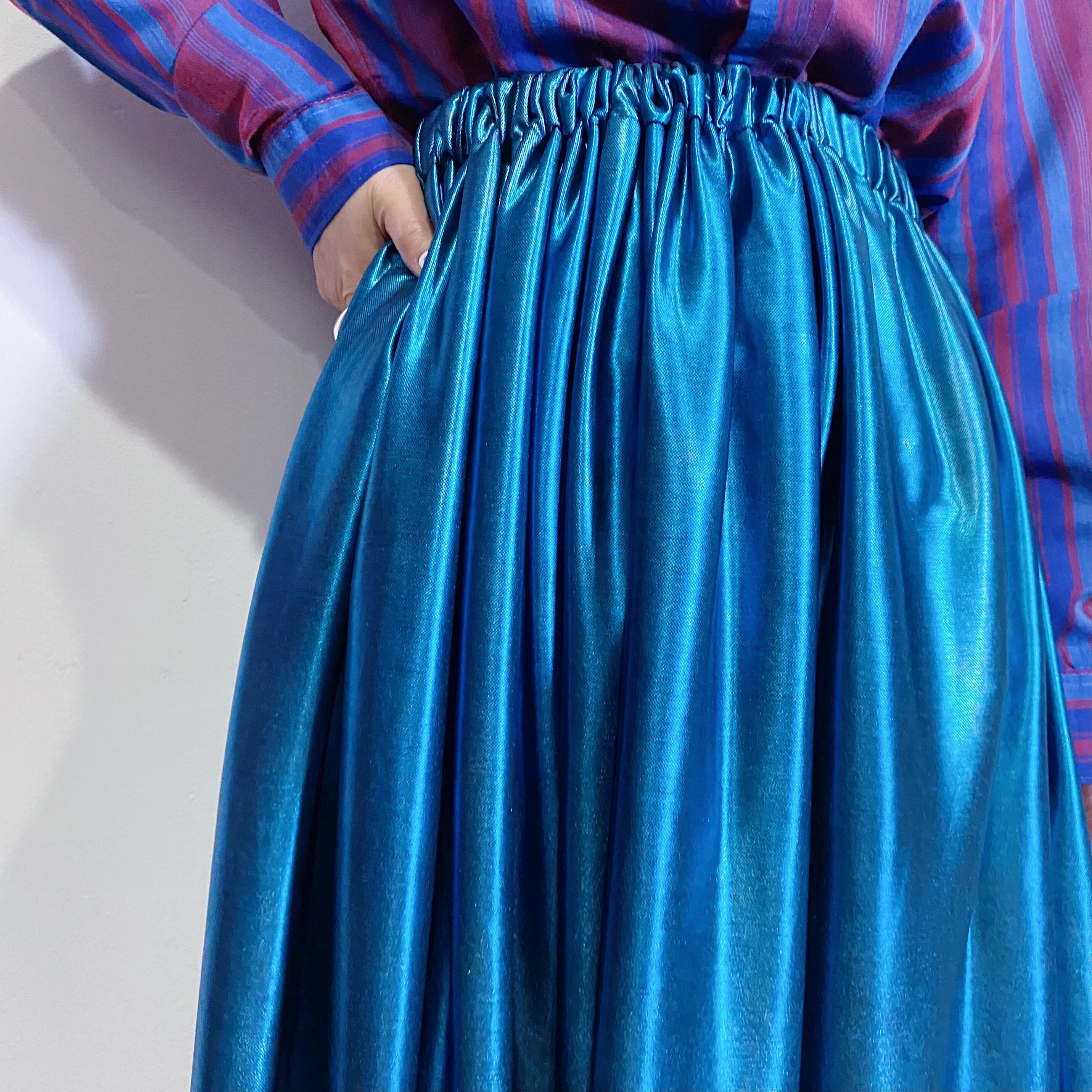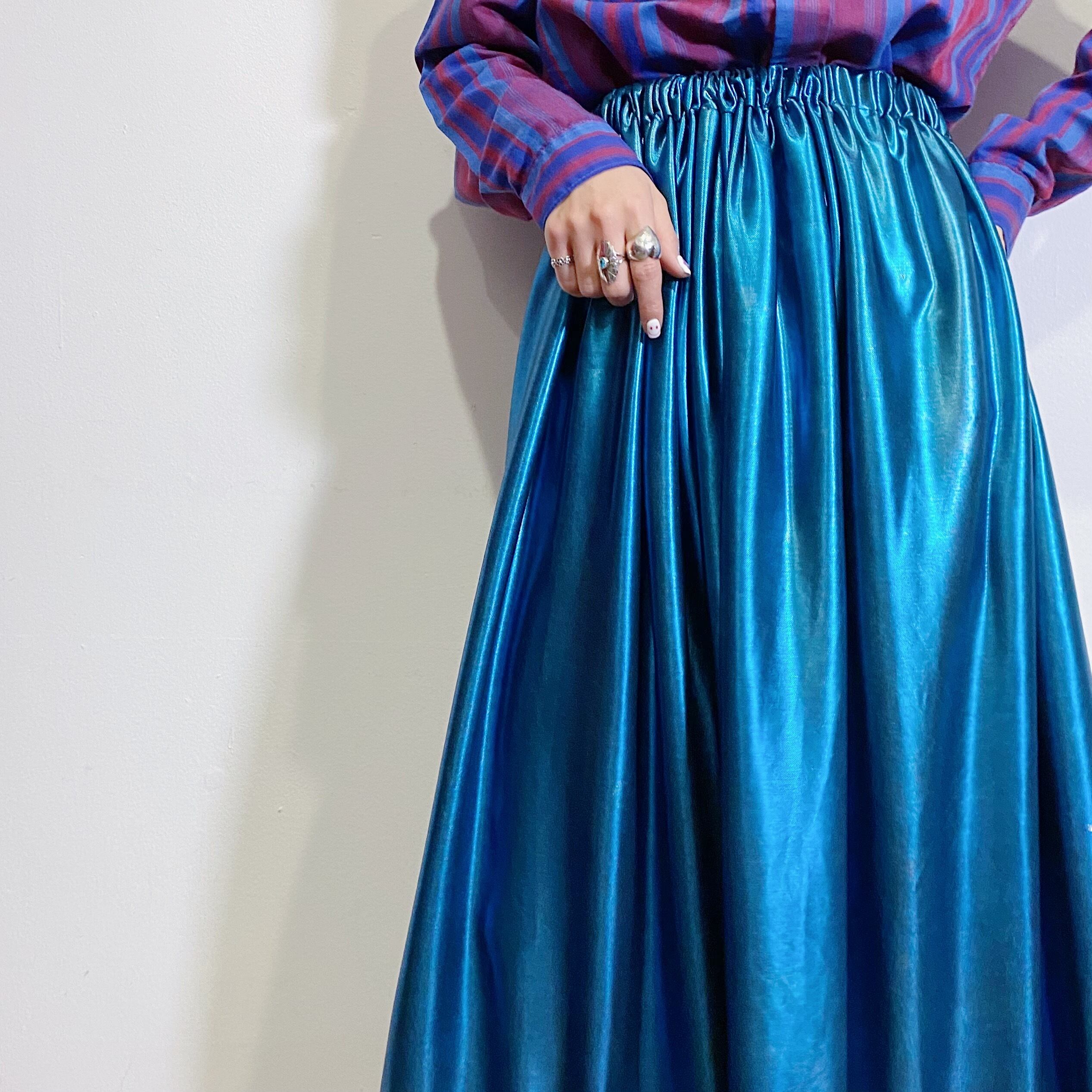 お菓子の包み紙のような光沢感と裾のフリンジがとびきりキュートなスカートです。