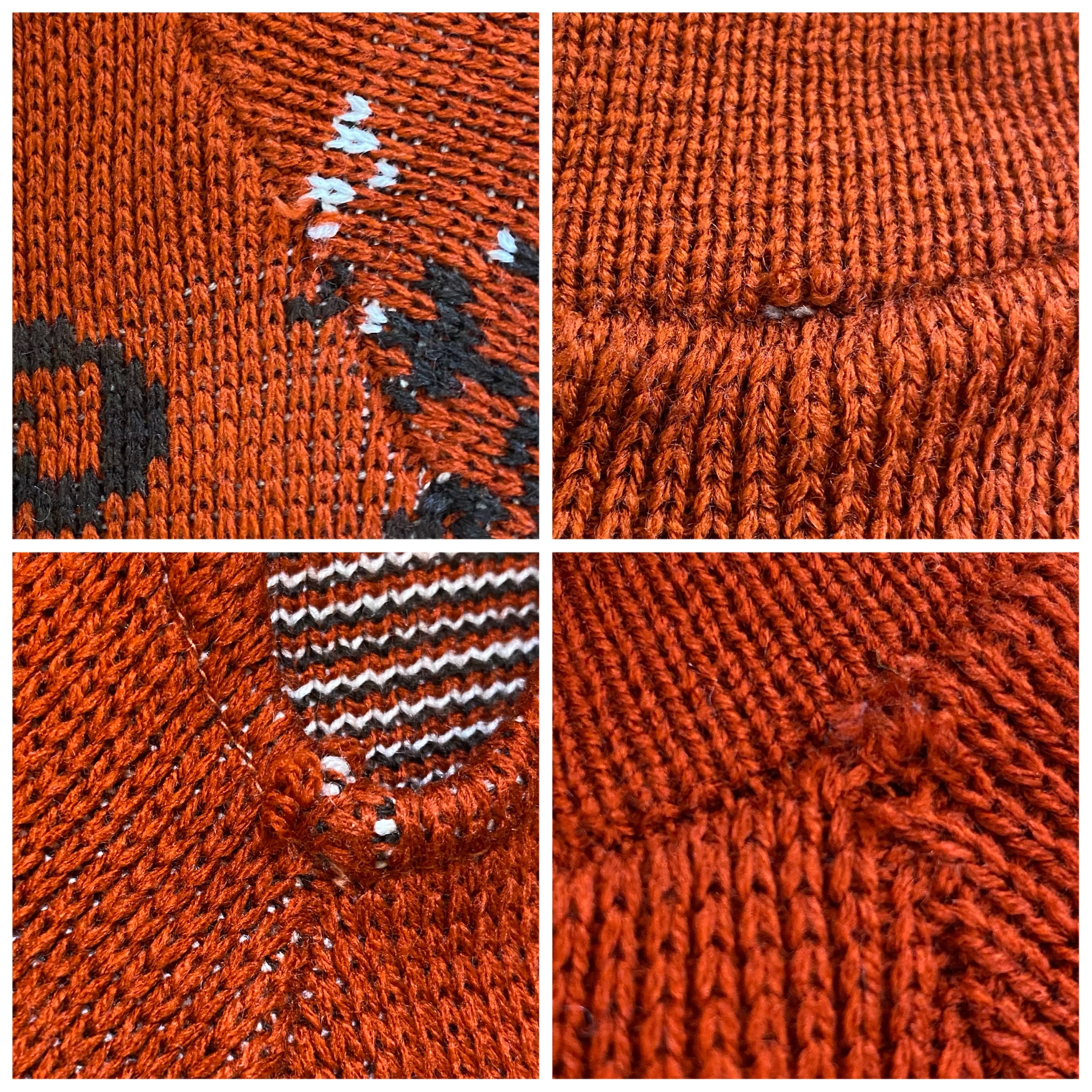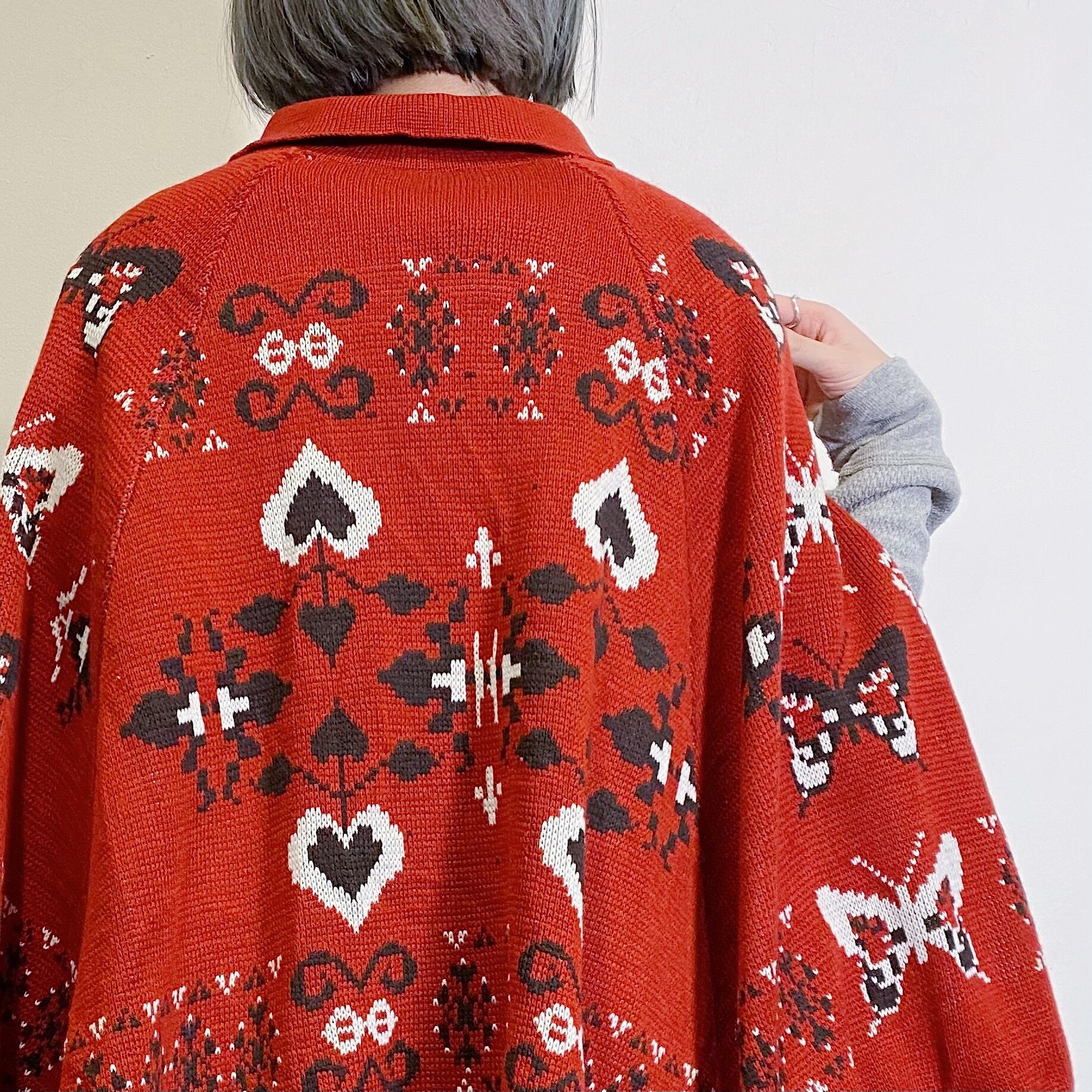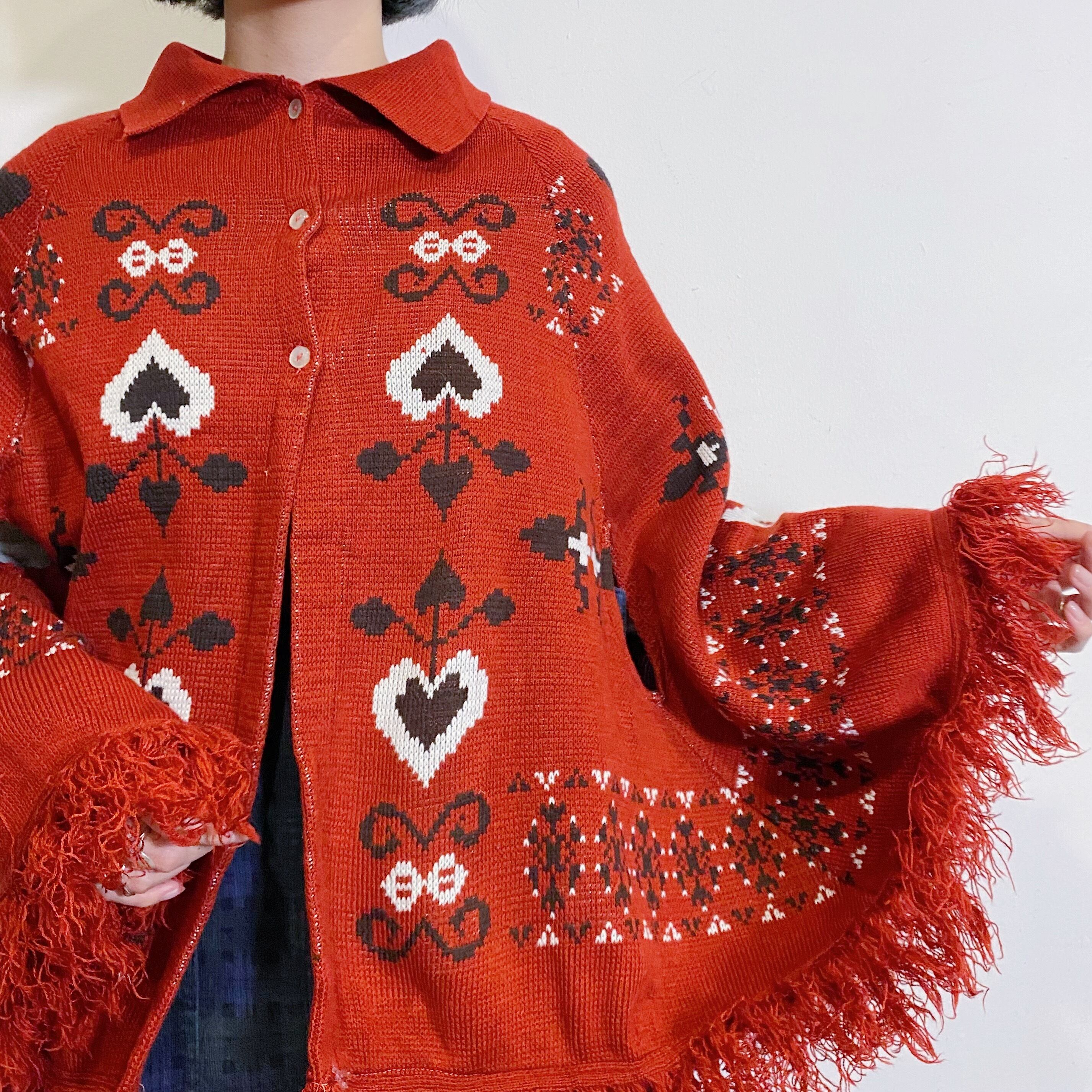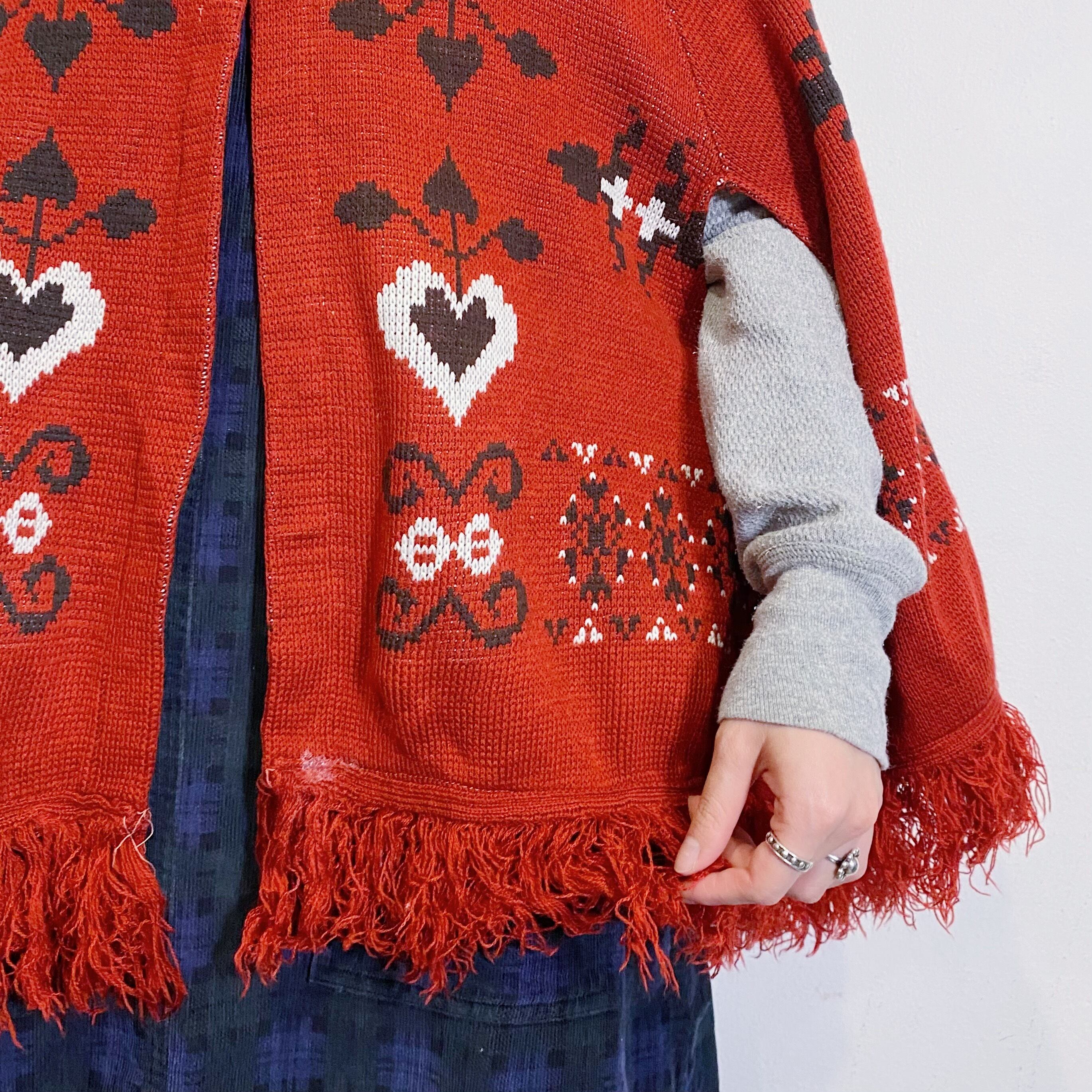 お花や蝶々のモチーフ、裾のフリンジが可愛い70年代のニットポンチョです。