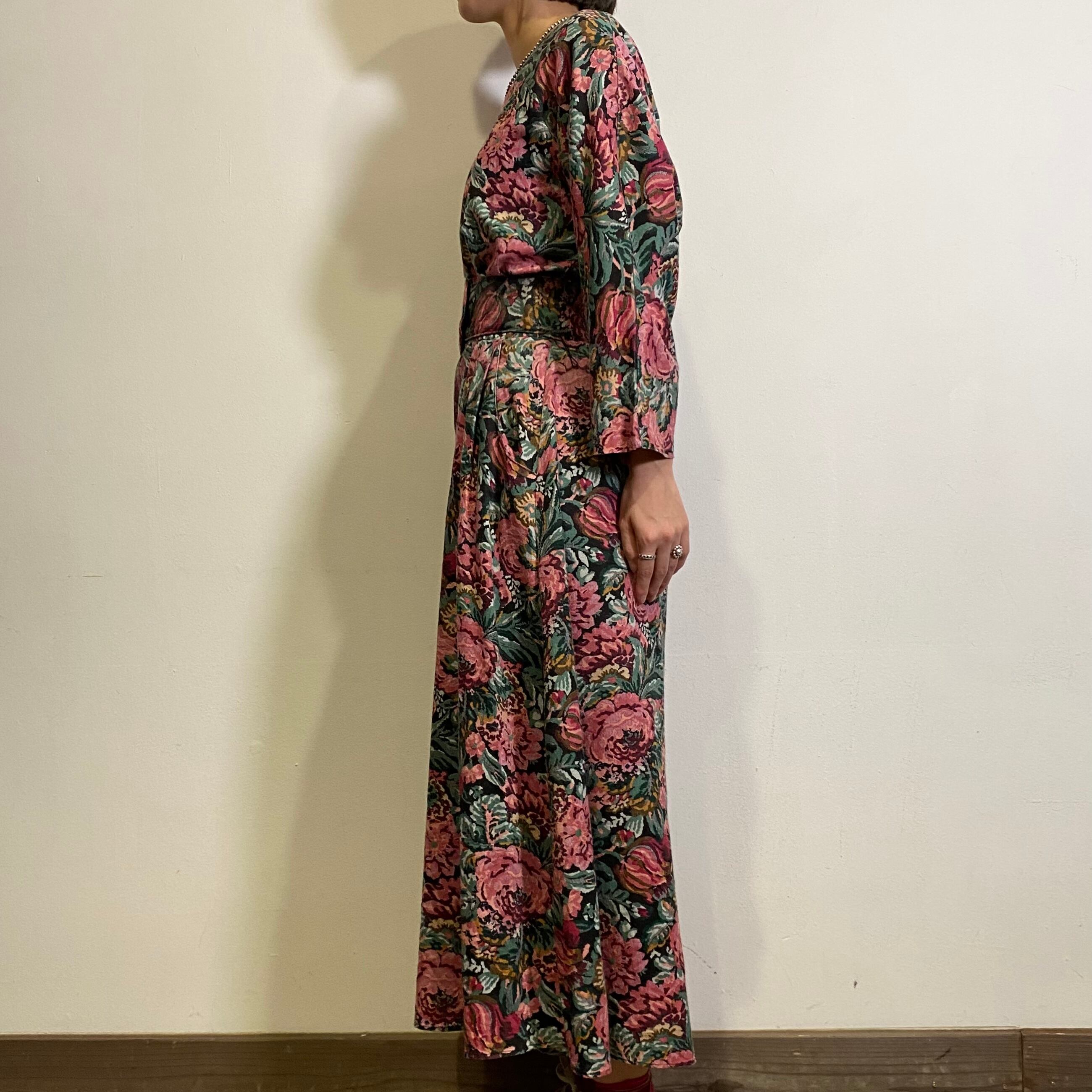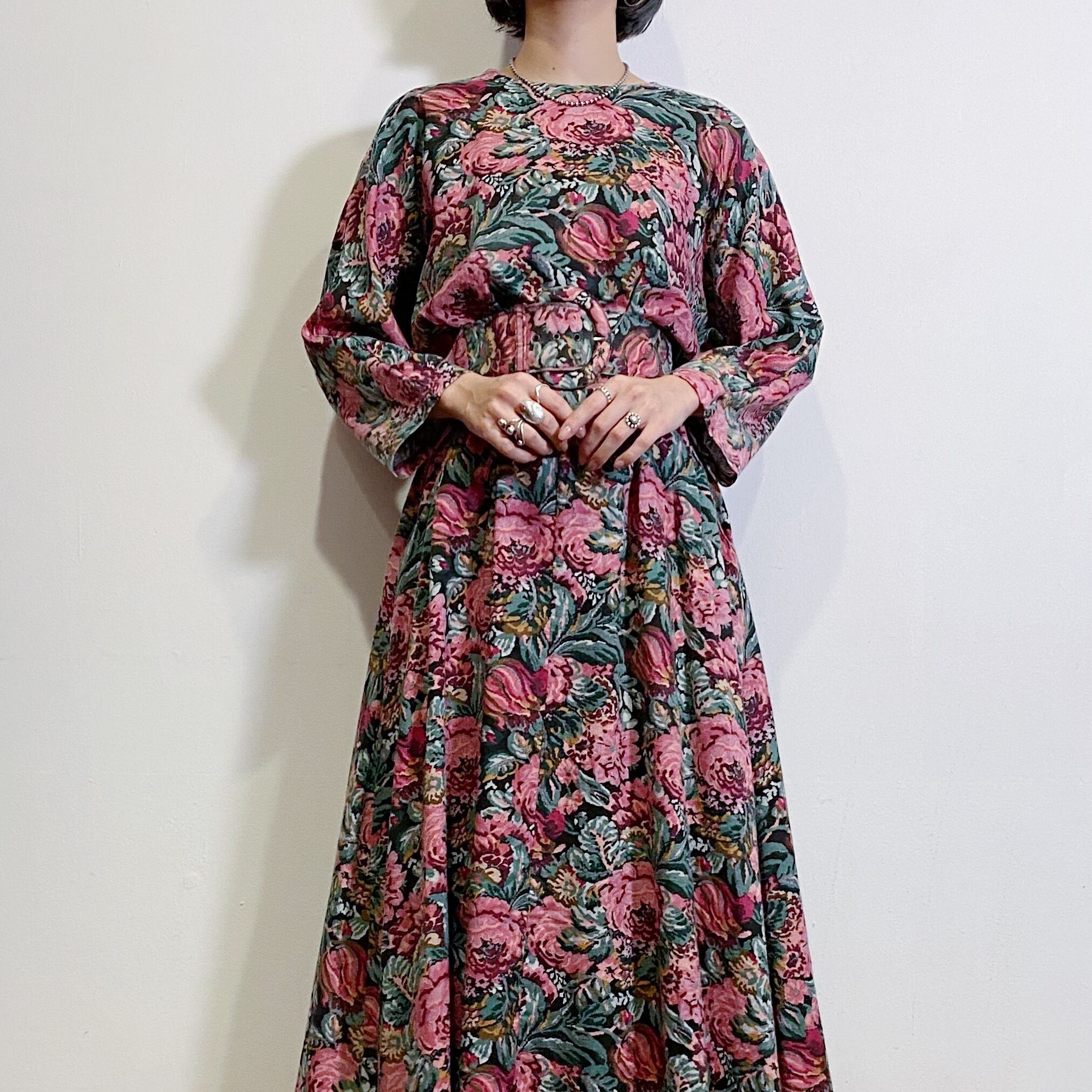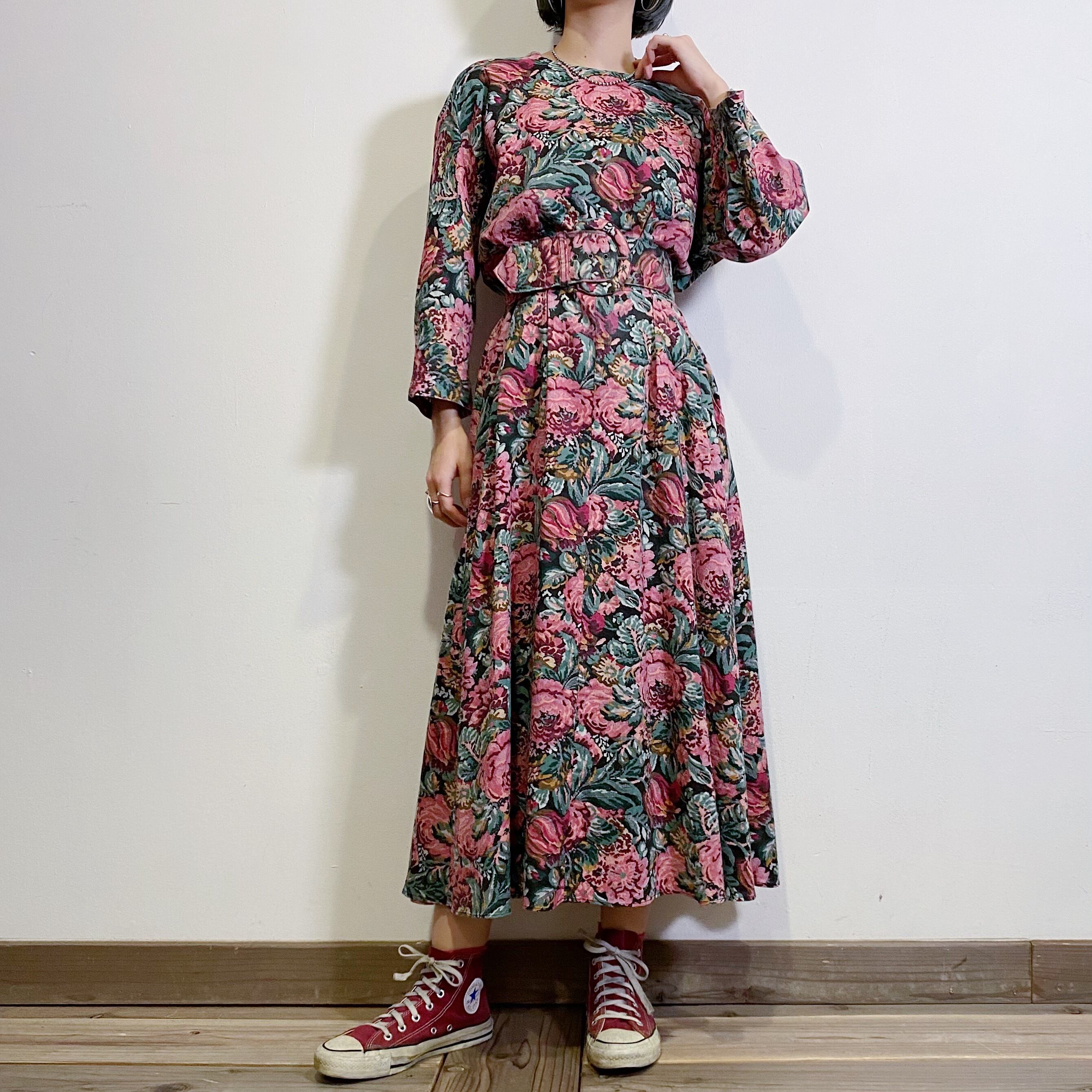 ドルマンスリーブにピンクの大きな花柄が可愛い、80年代のワンピースです。