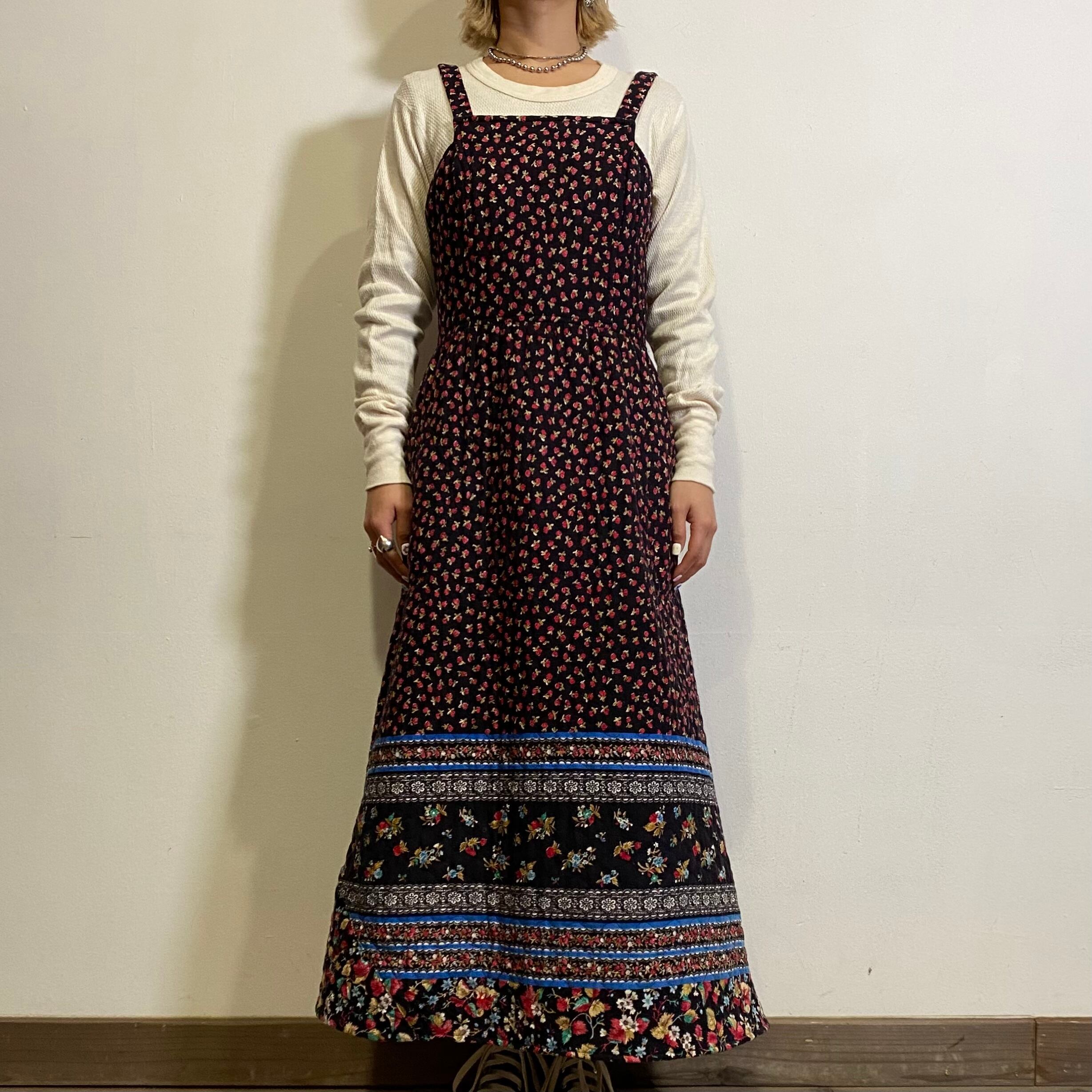 ブラックベースに花柄が可愛い、70年代のキルティングキャミワンピースです。