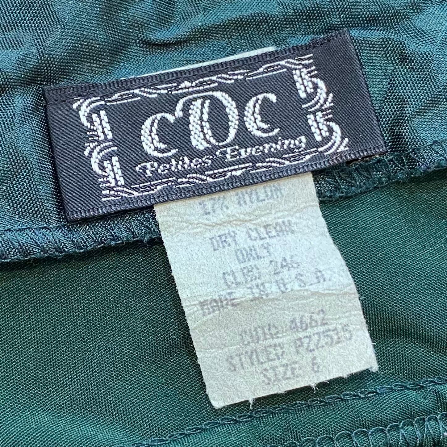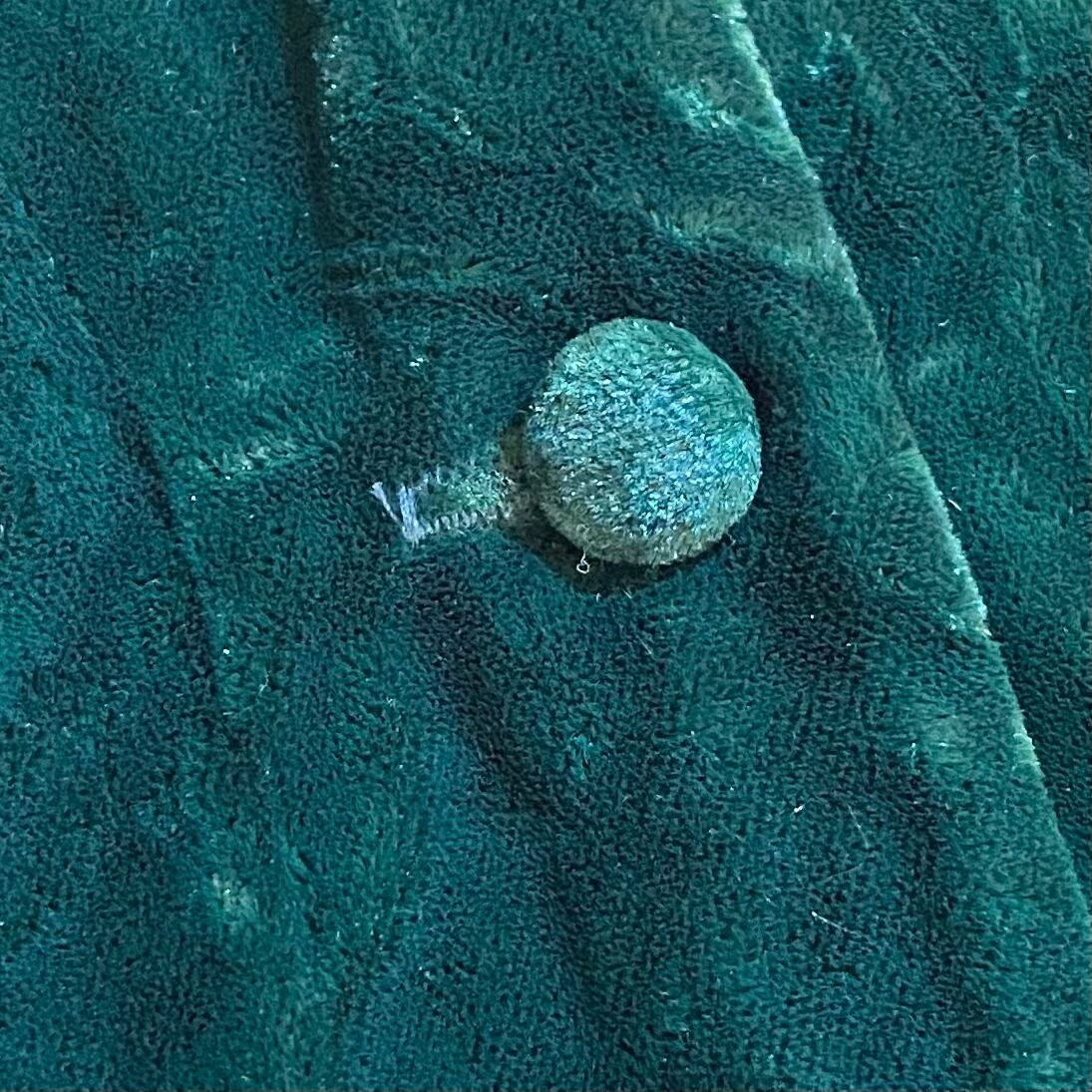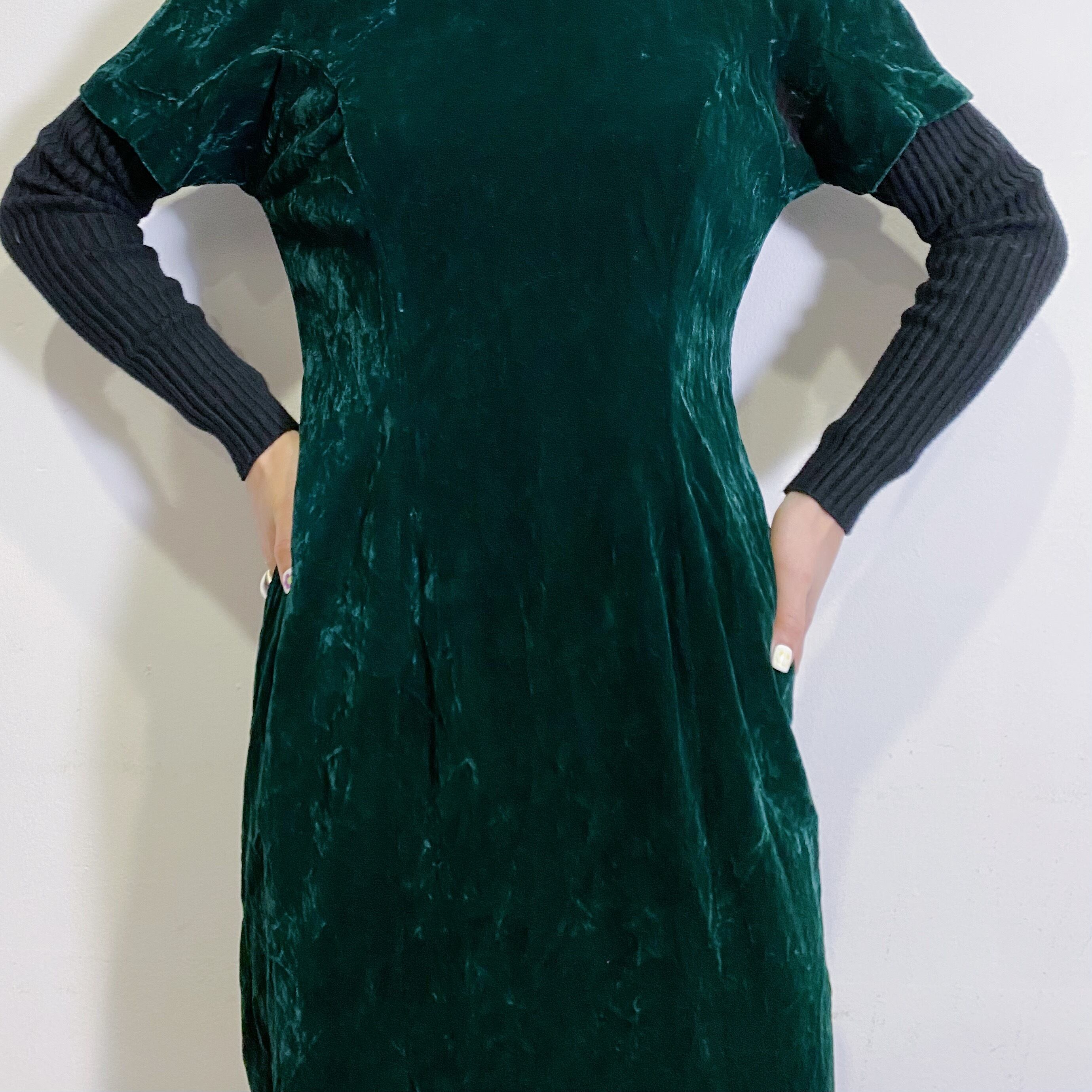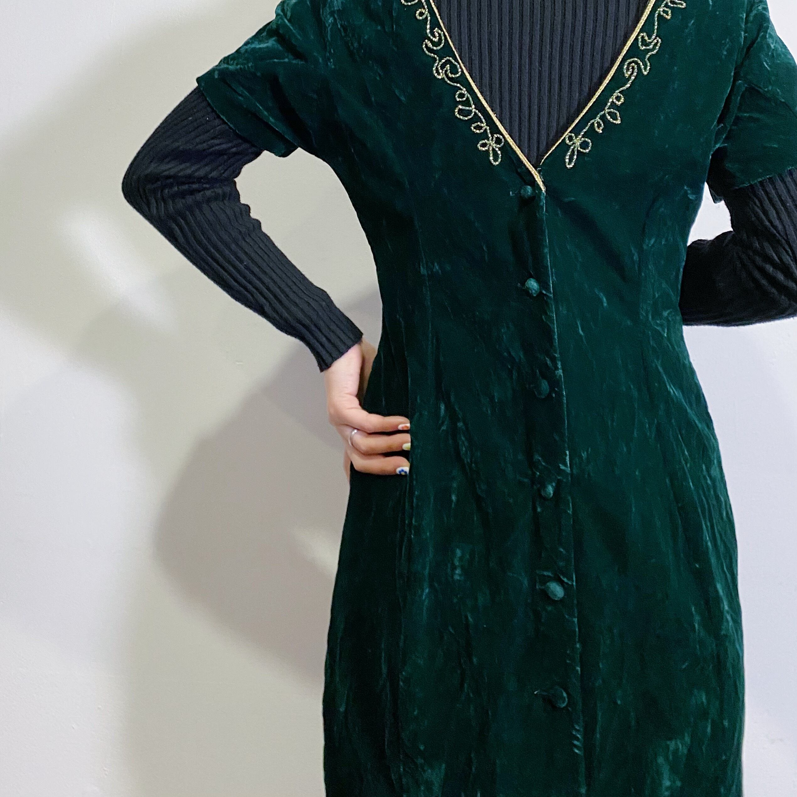 深めのグリーンに首回りにあしらわれたゴールドの紐の装飾が可愛い、80年代のベロアワンピースです。