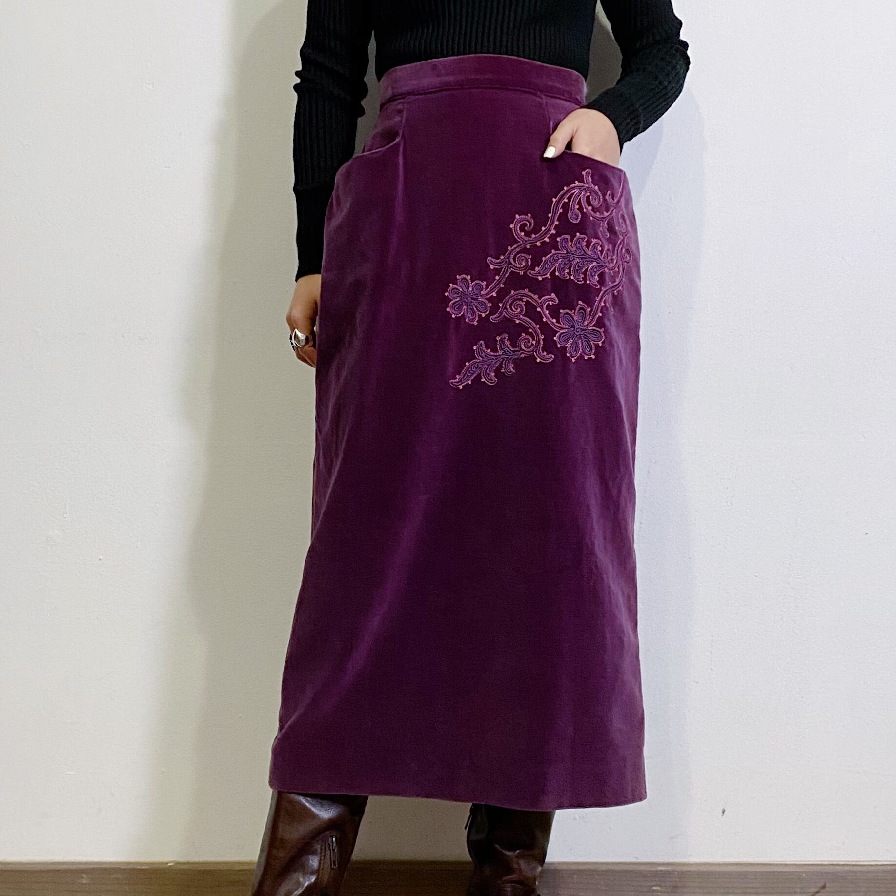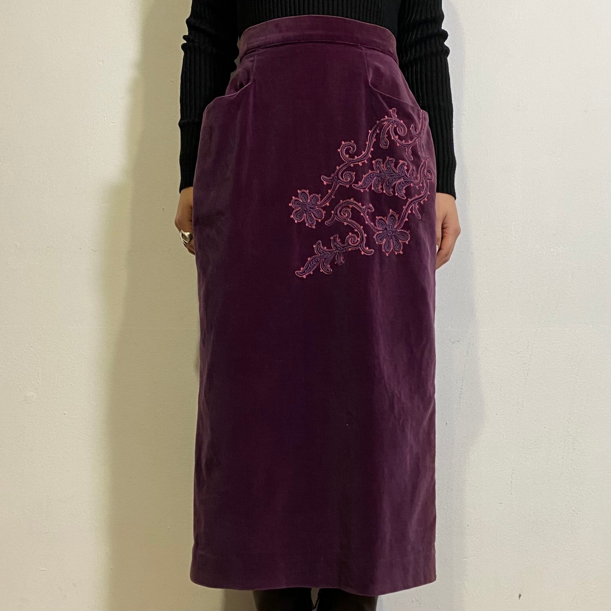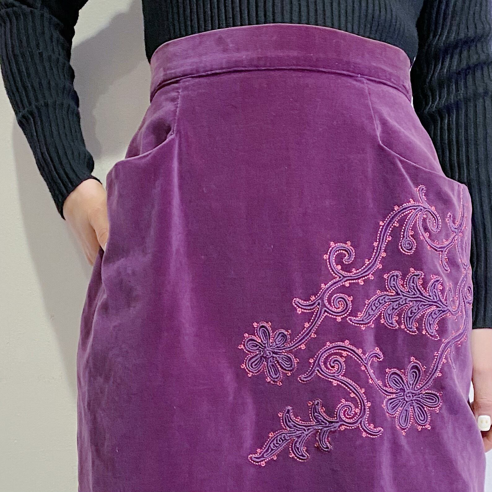 こっくりパープルにお花の装飾が素敵な、50年代頃のベロアスカートです。