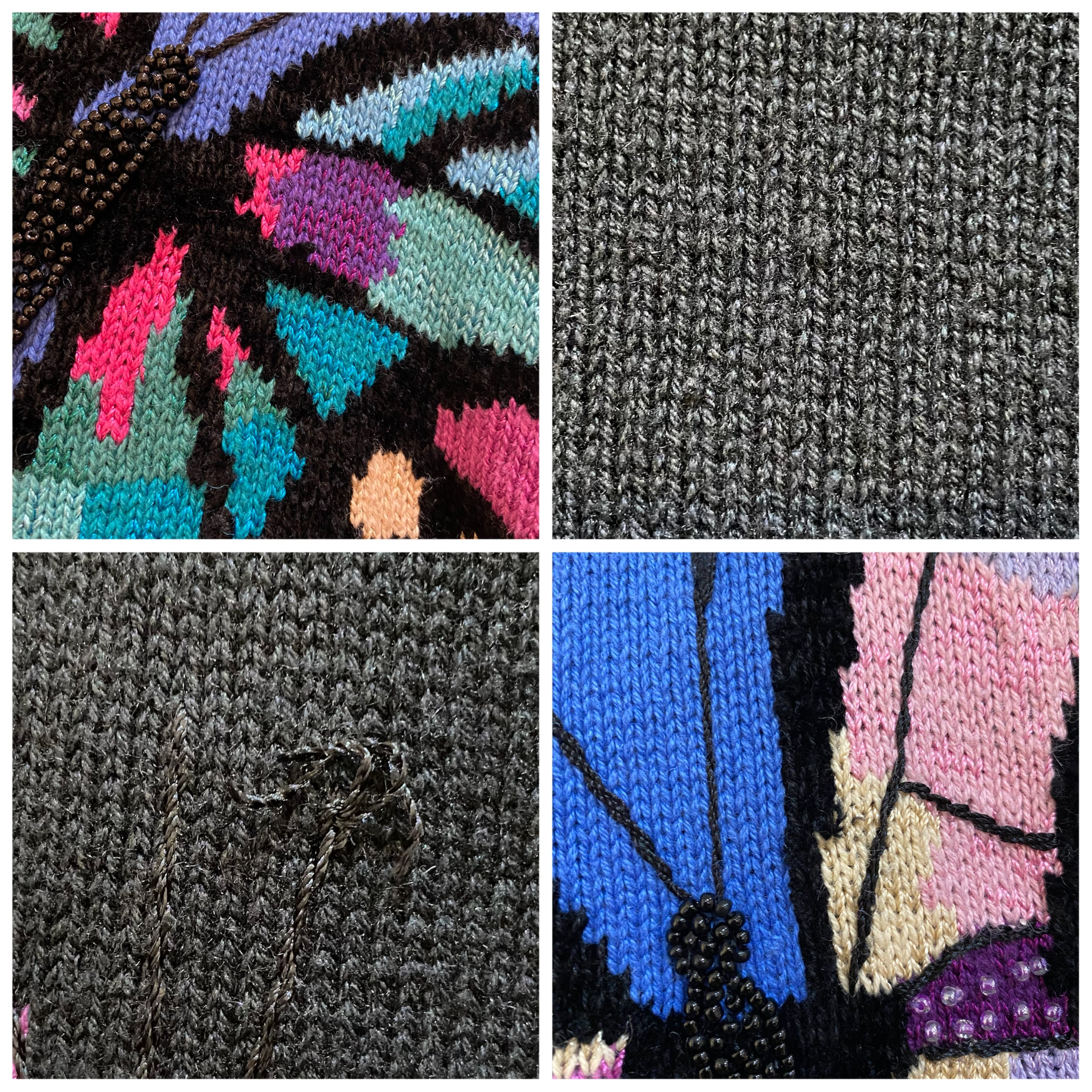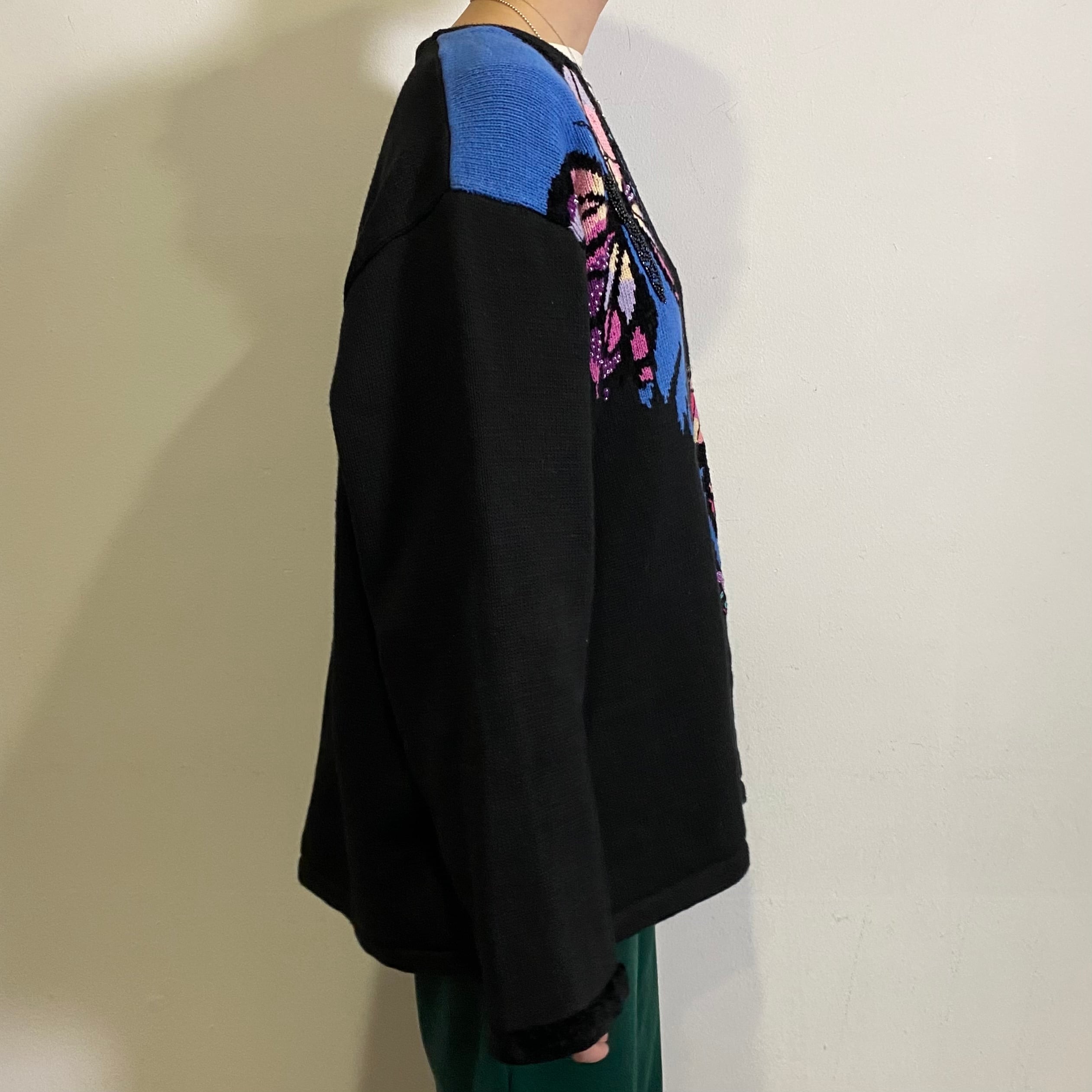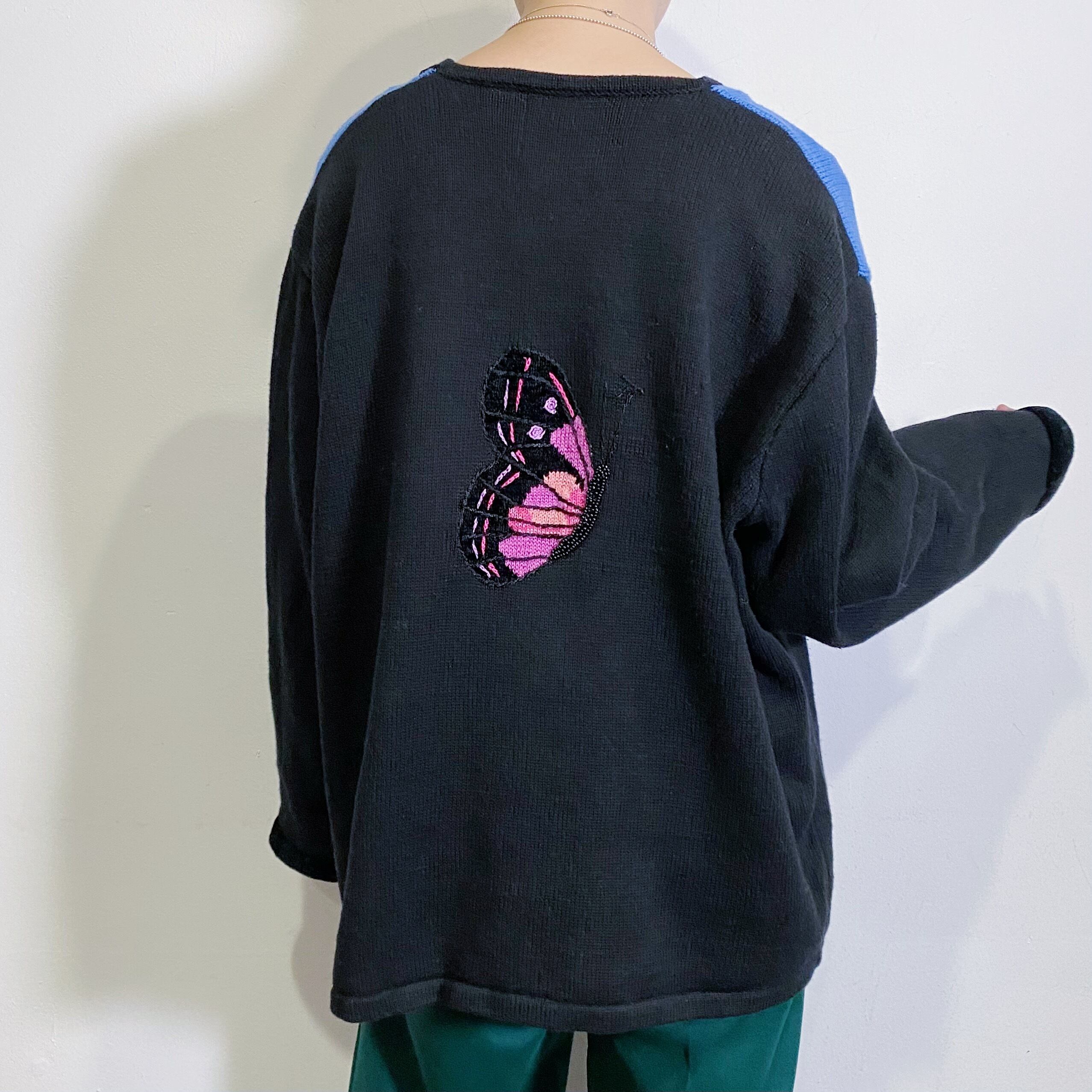 80s black butterfly motif cotton knit cardigan