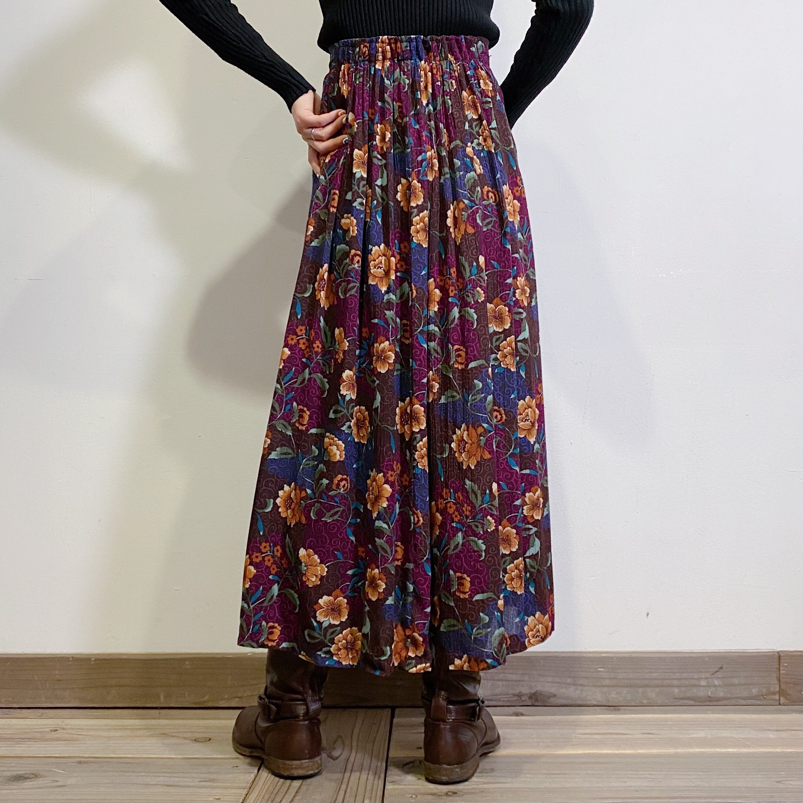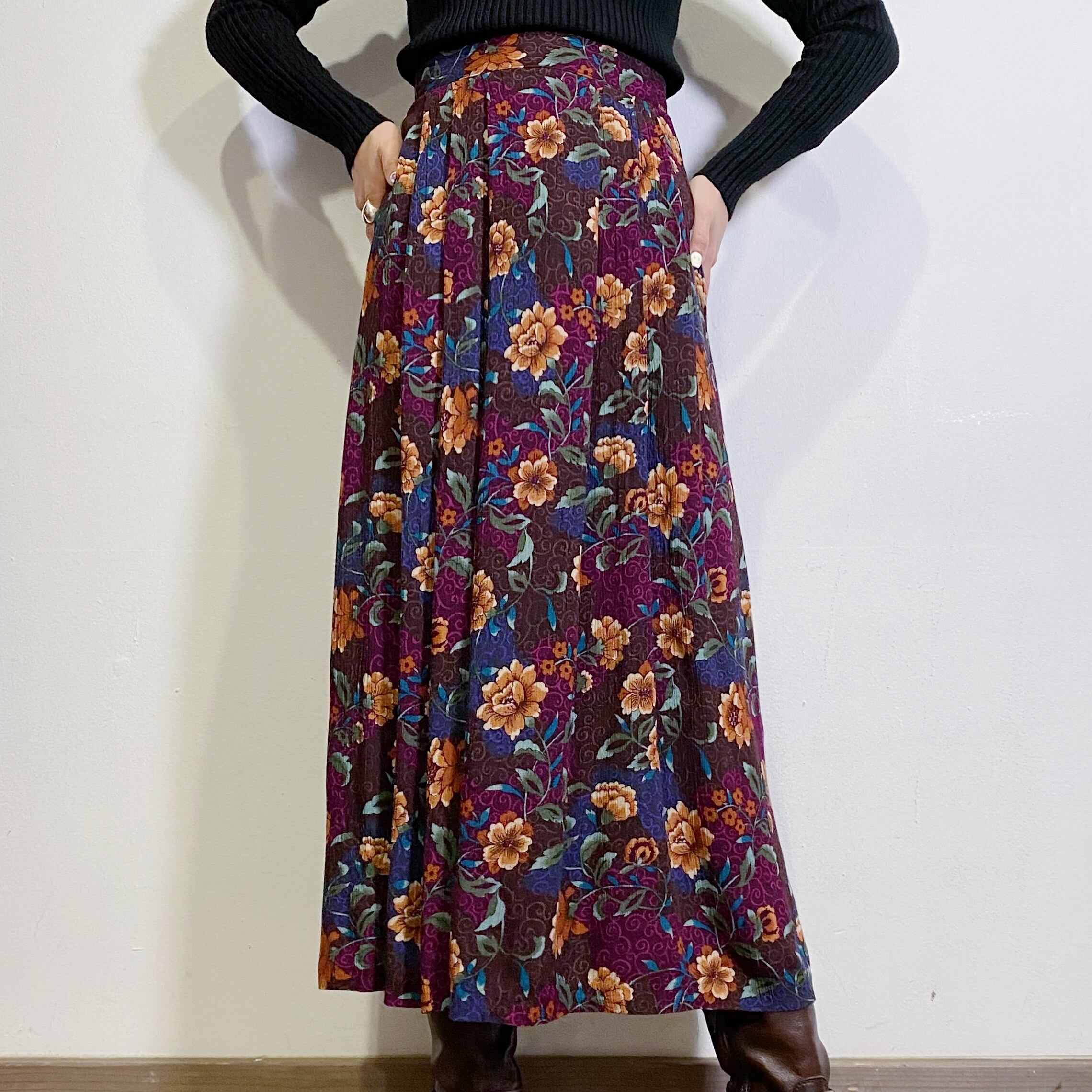 ブラウンベースにオレンジやパープルのお花がかわいい、90年代のロングスカートです。