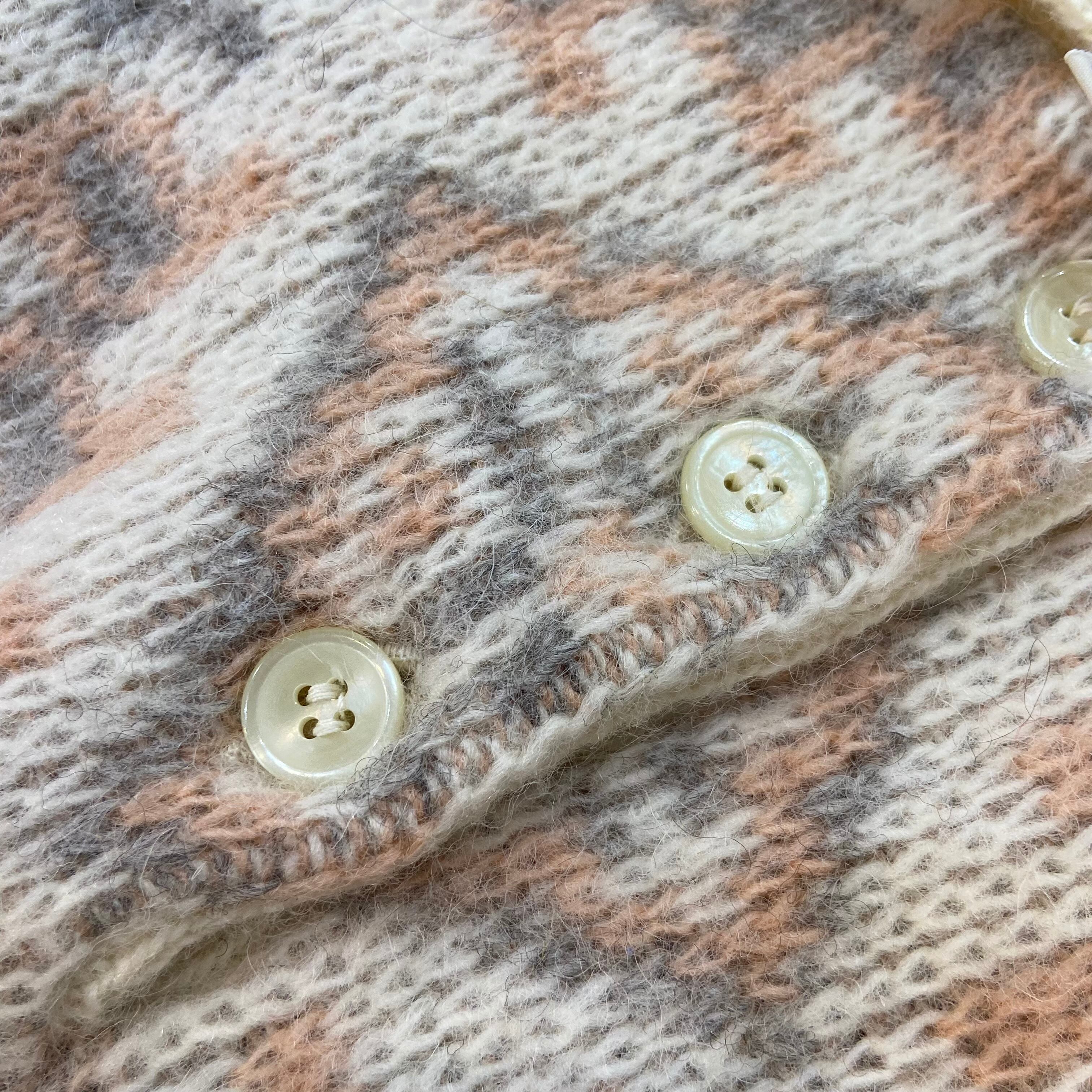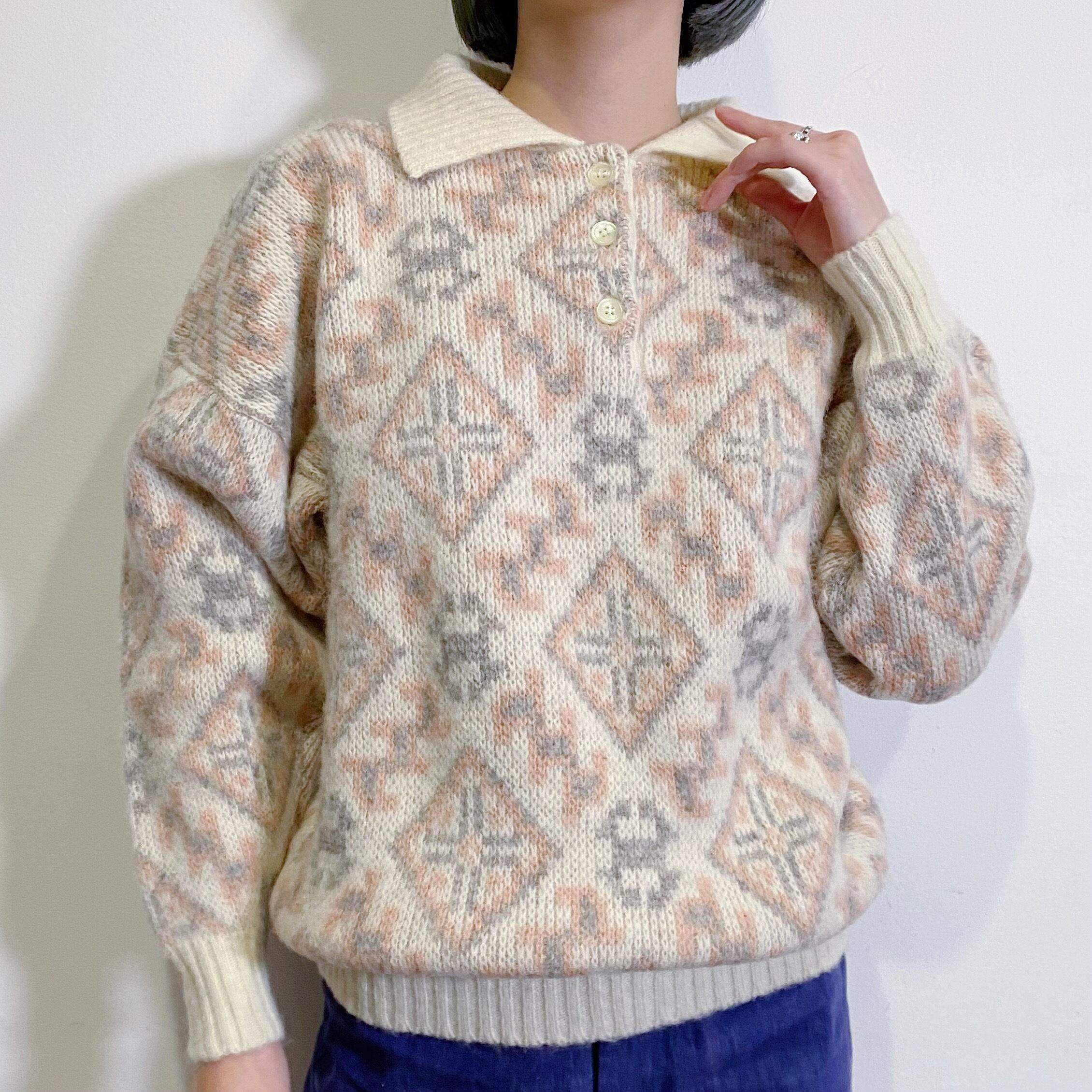 ホワイトカラーに淡いピンクやグレーのやわらかな模様がかわいい、アイスランド製のウールニットセーターです。