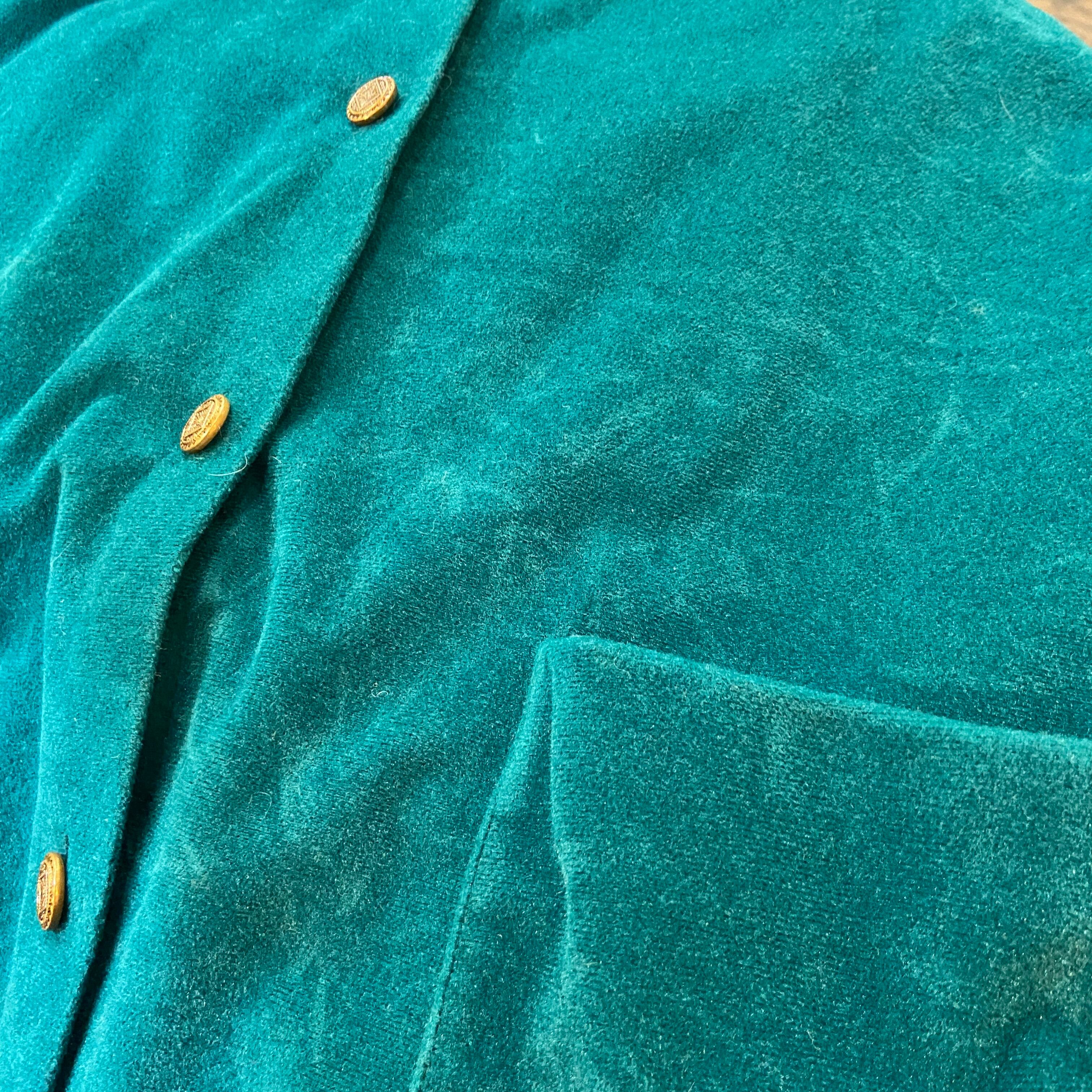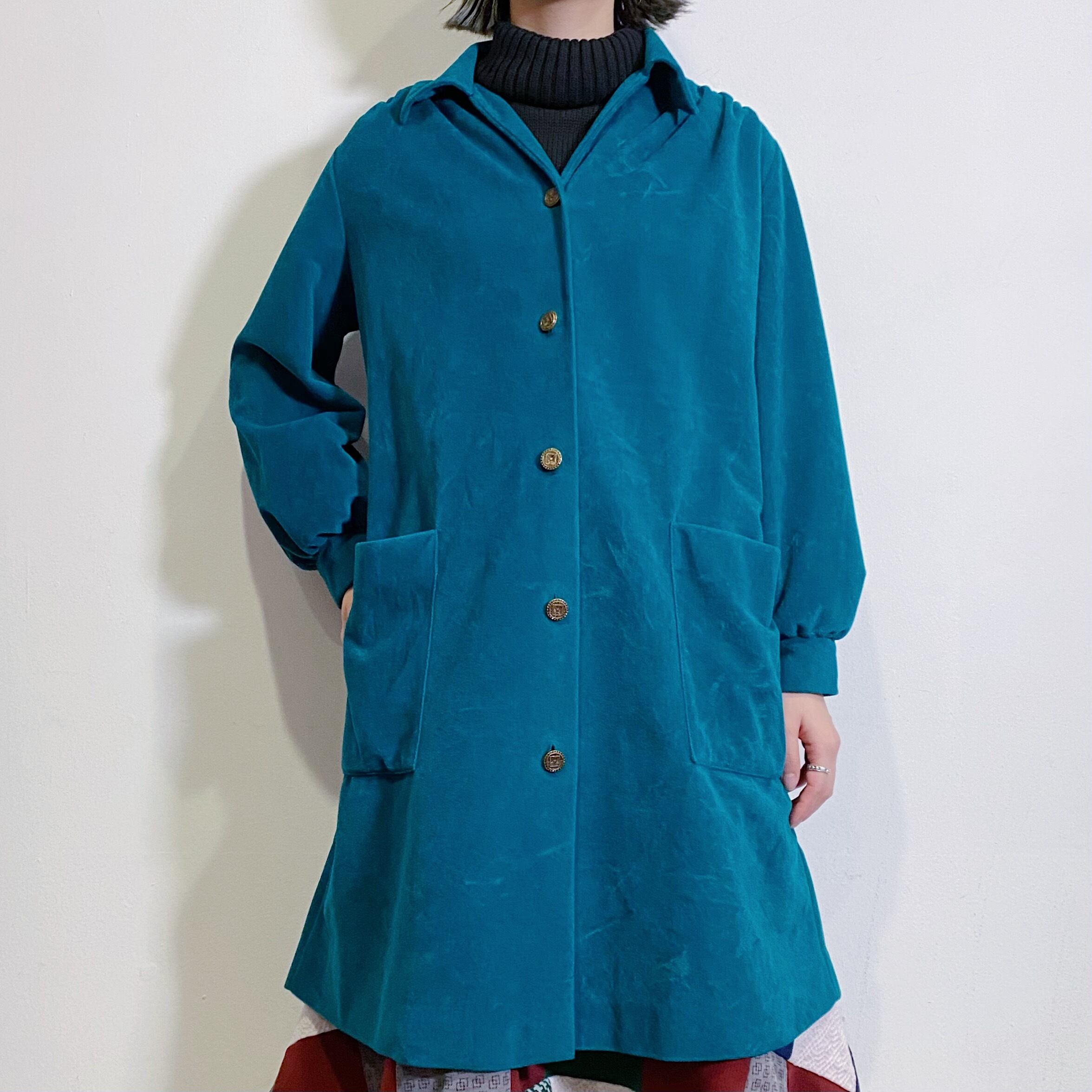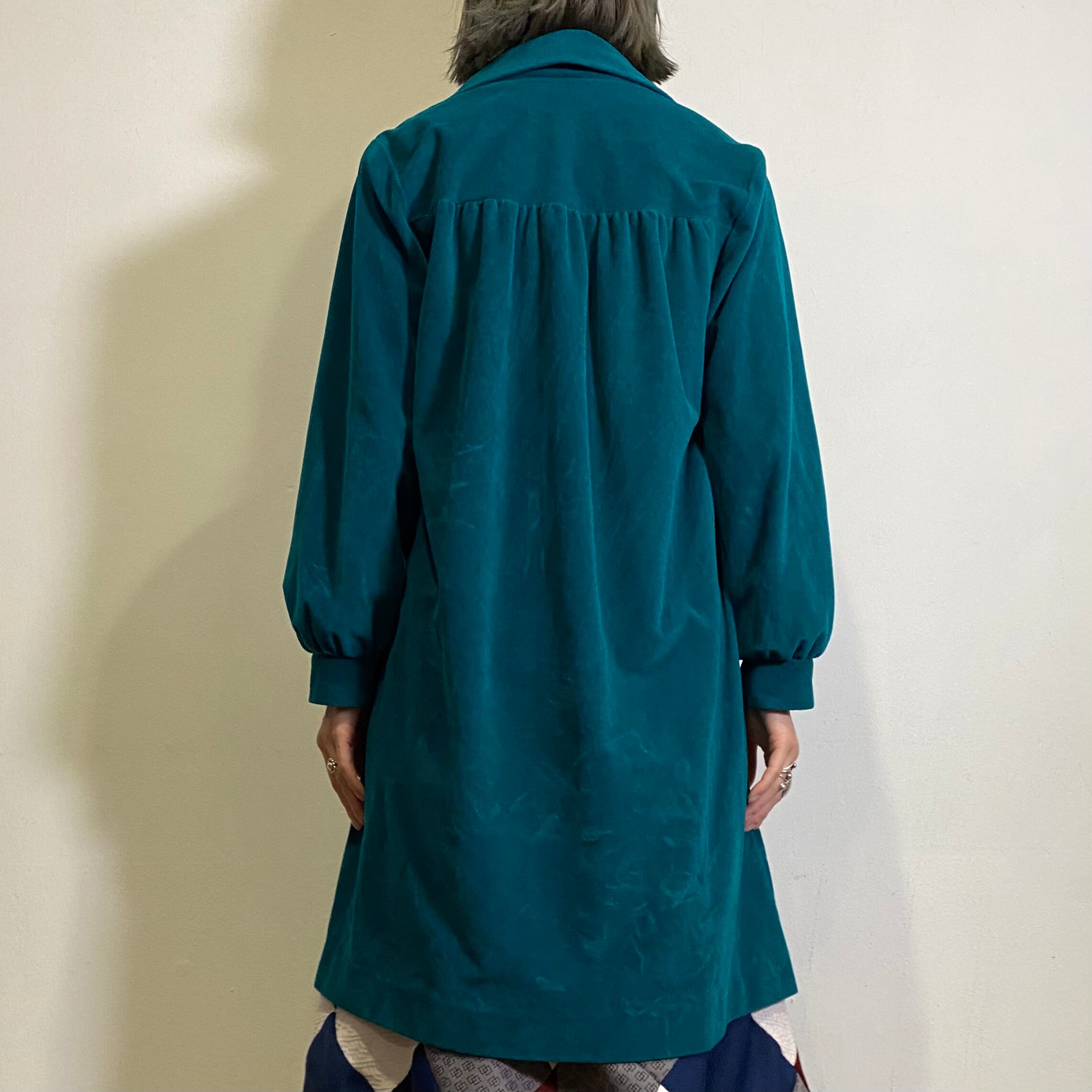 グリーンとブルーの中間のような絶妙な色合いが可愛い、ベロア素材のショートガウンです。