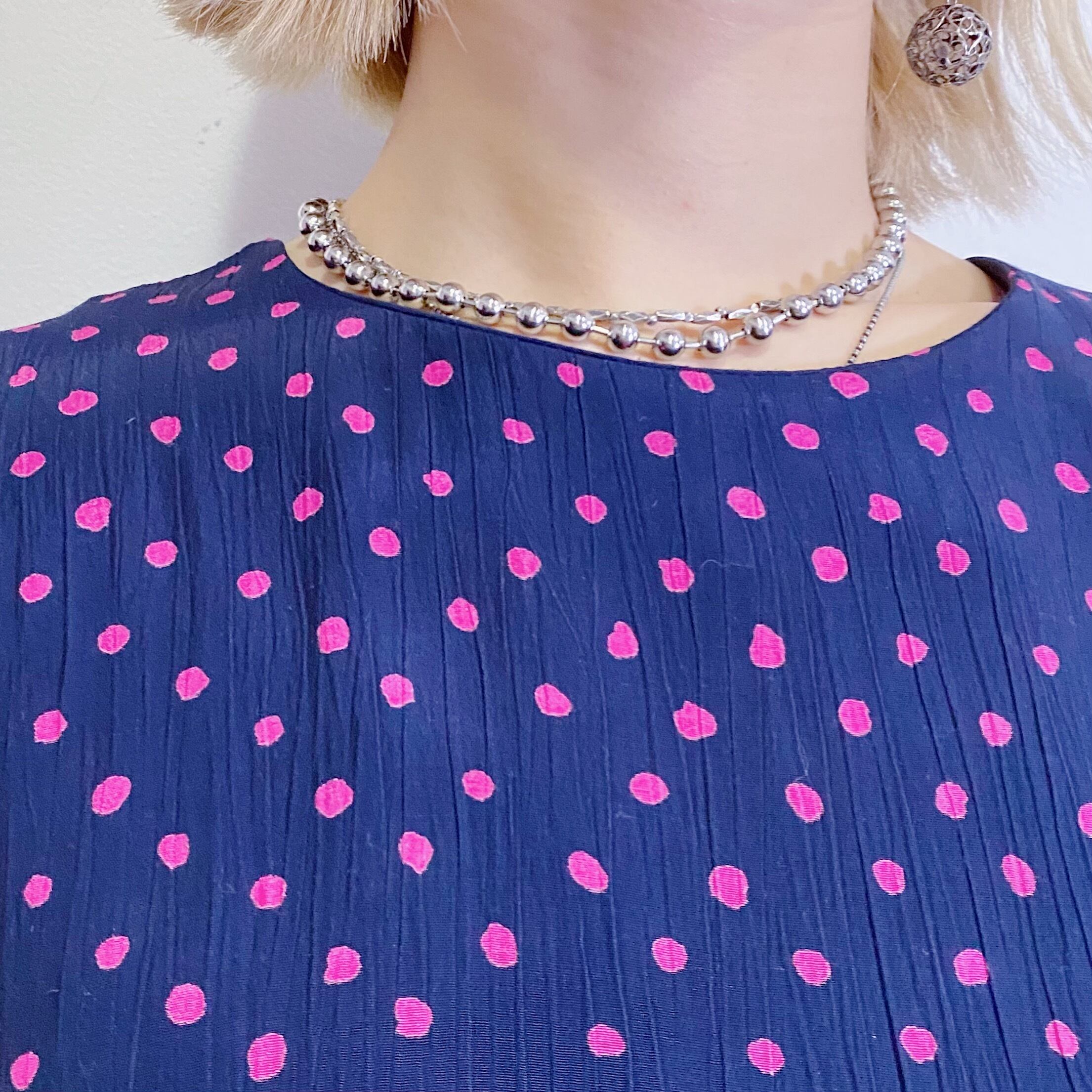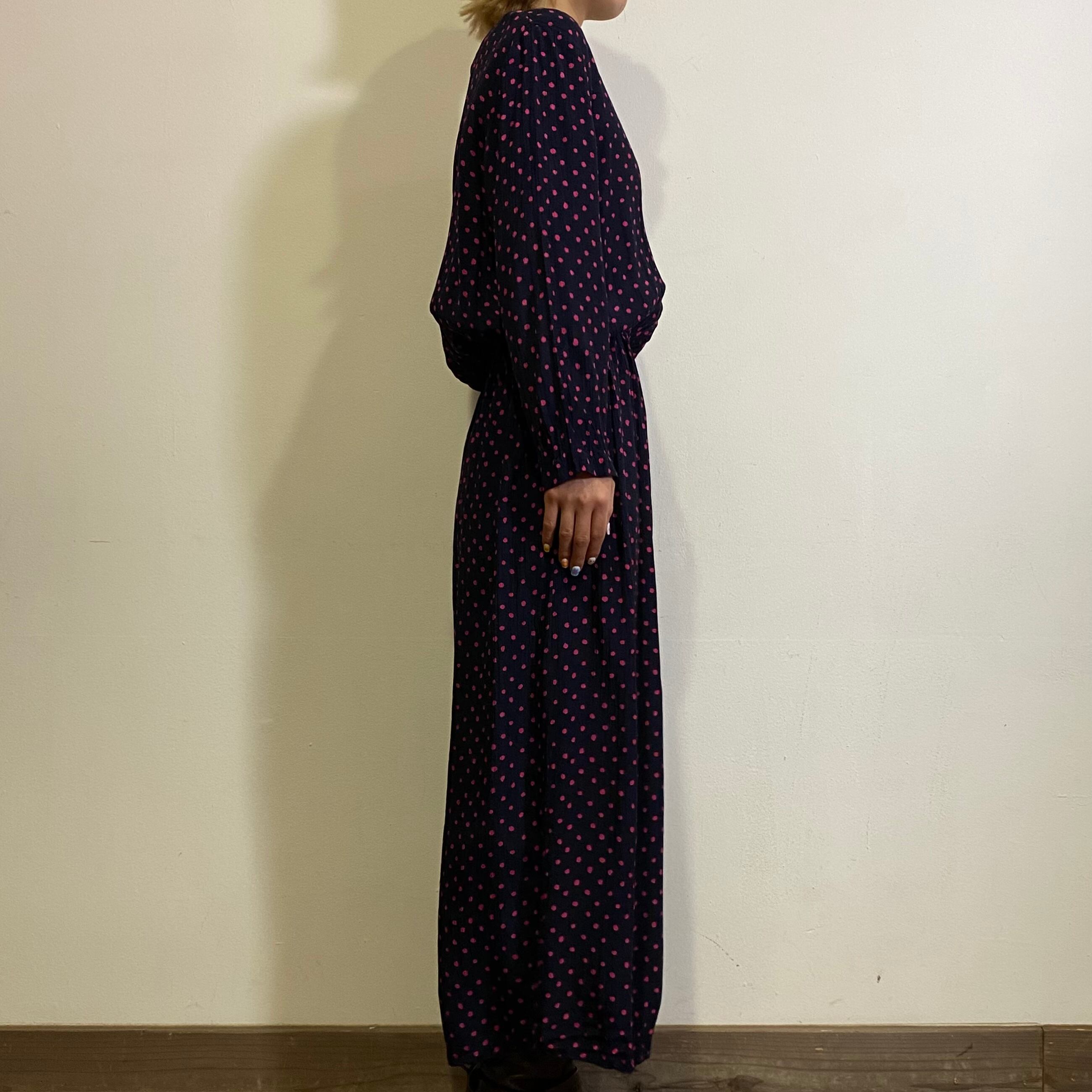 ネイビーカラーにピンクドットの色合いが可愛い、80年代のジャンプスーツです。