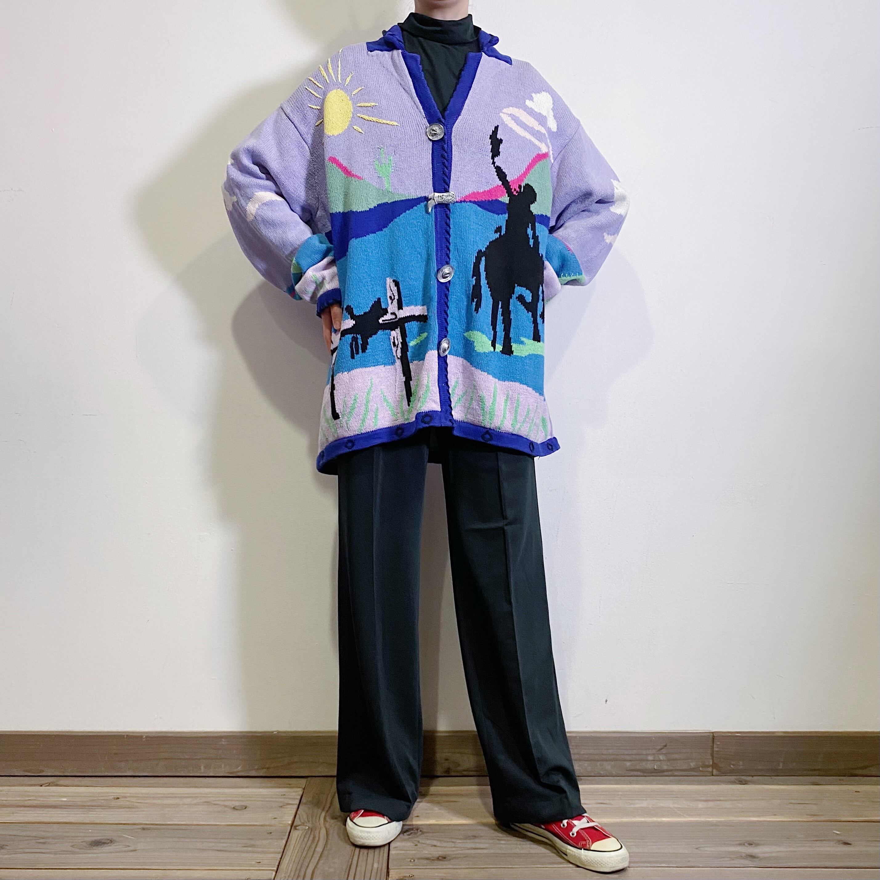 カウボーイやサボテン、太陽や雲など牧場の風景が編み込まれたデザインが可愛いニットカーディガンです。