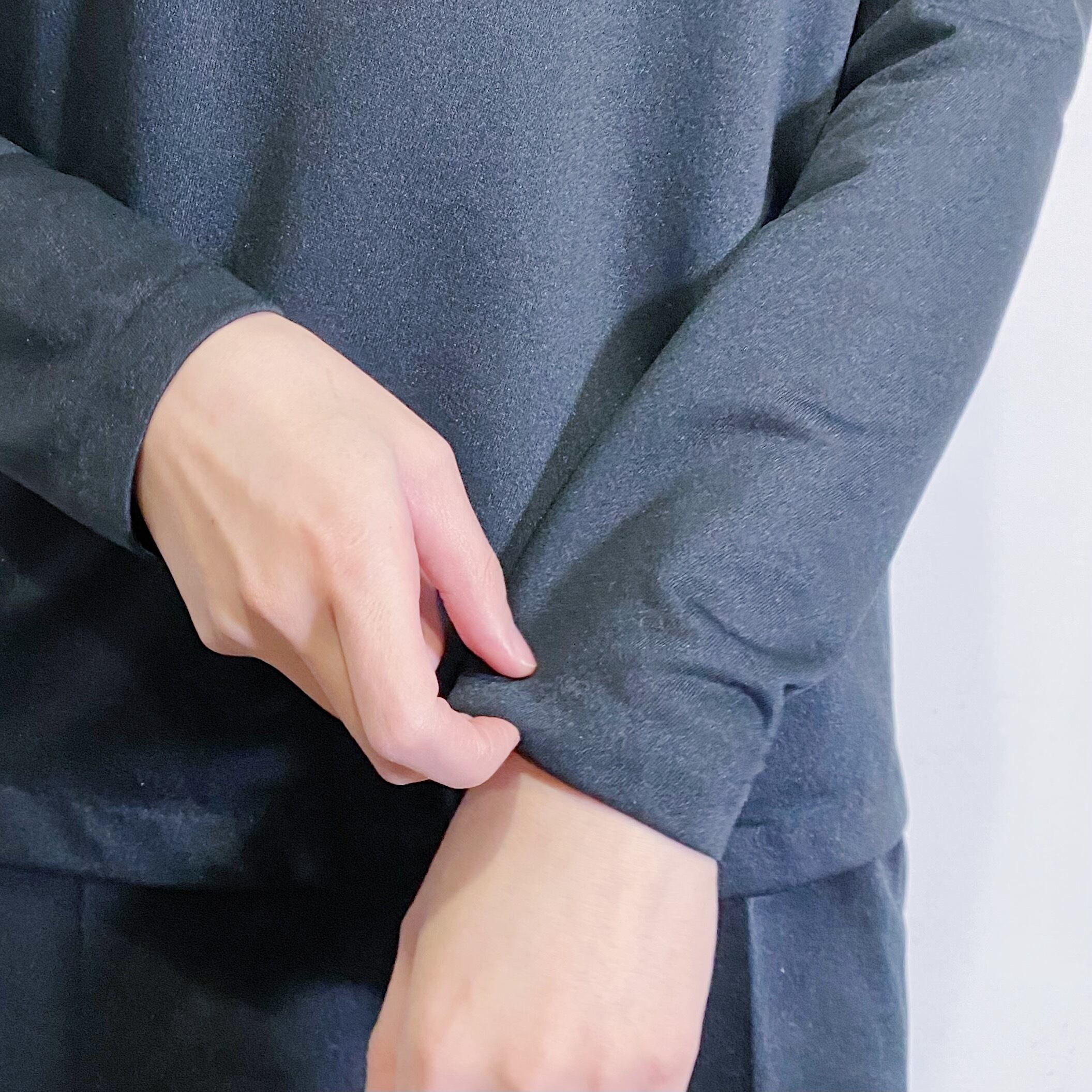 トップスはハイネックで、パンツはセンタープリーツが入っていて綺麗なシルエットが魅力的。