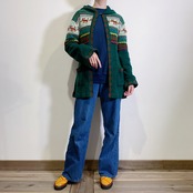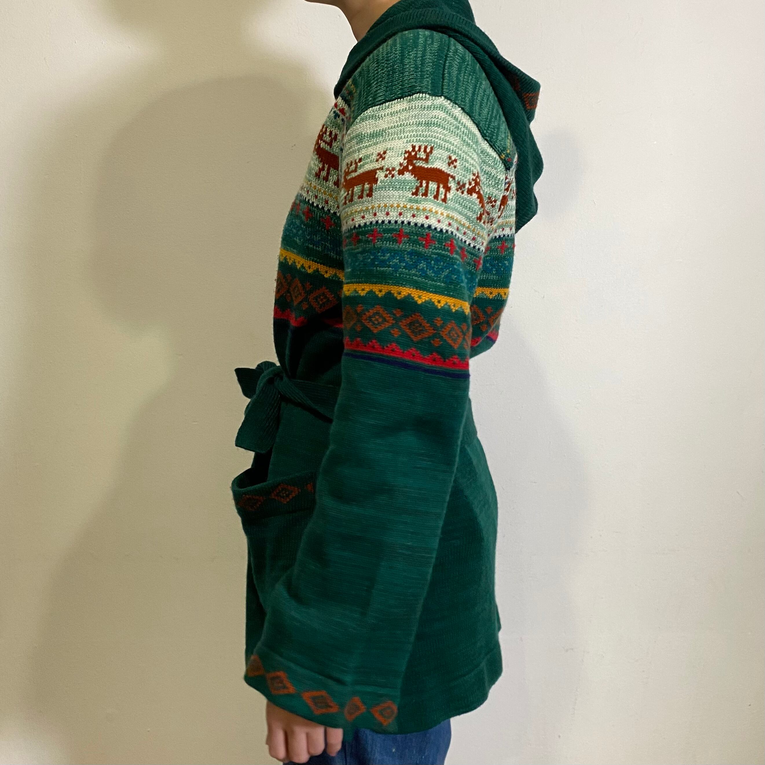 グリーンの色合いにトナカイやノルディック柄がかわいい、70年代頃のニットガウンです。
