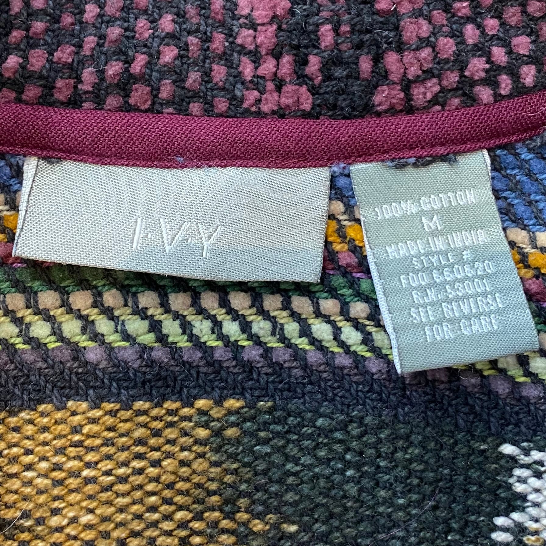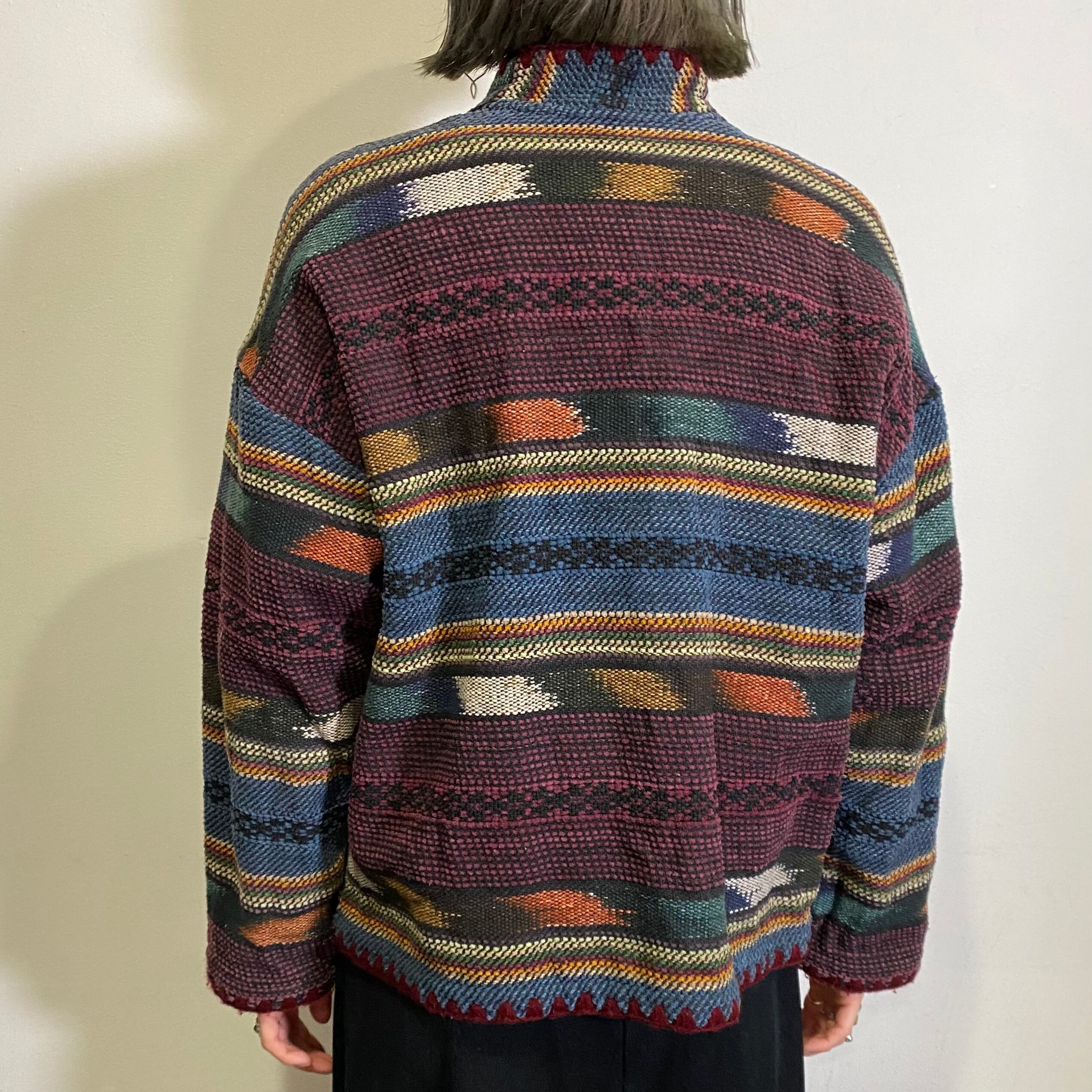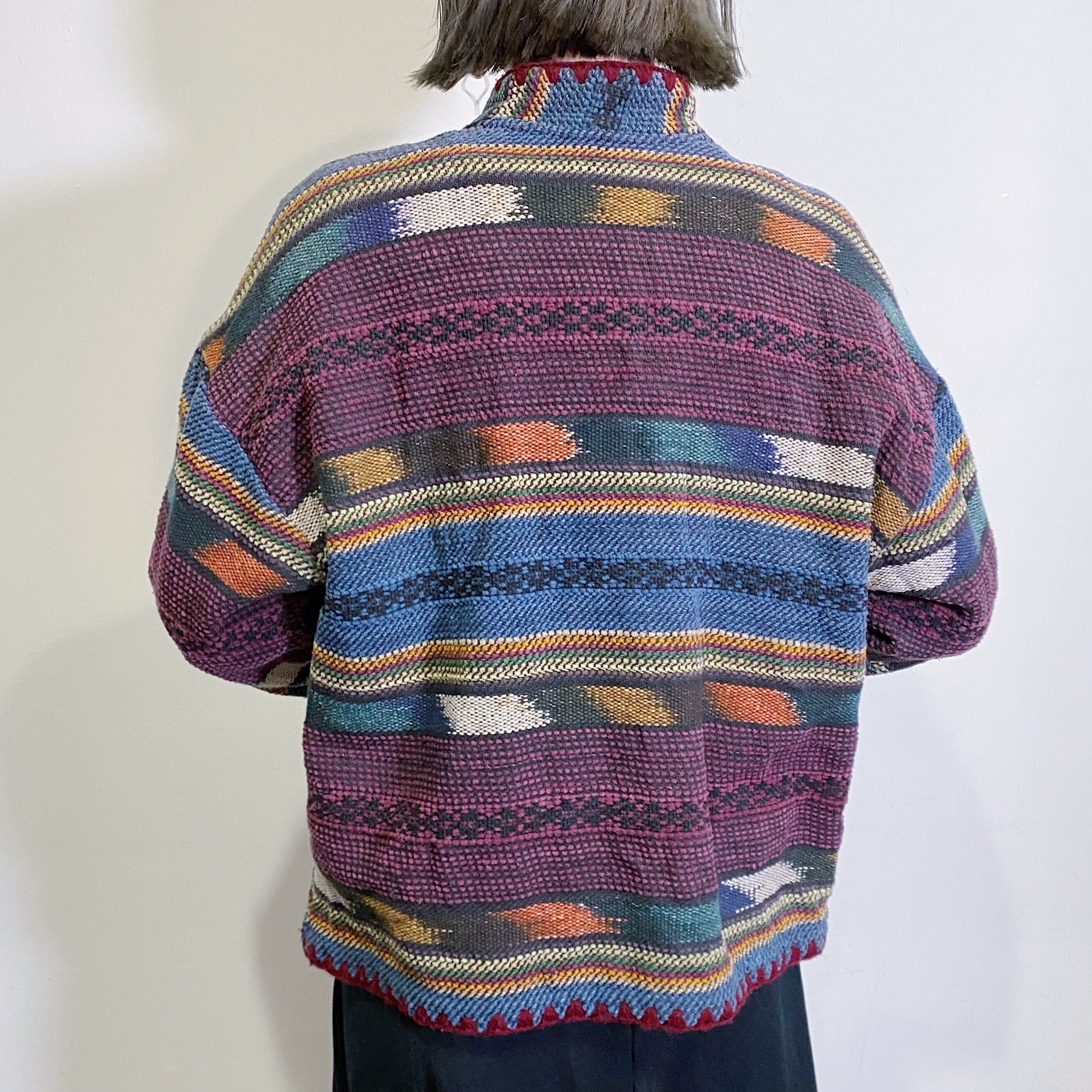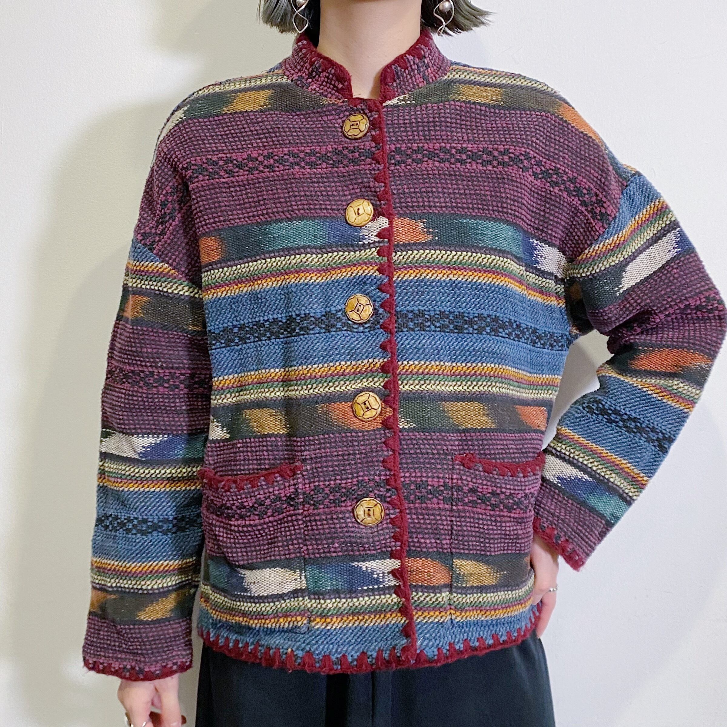 エスニックな雰囲気やお花模様のウッドボタン、フチの編みなどこだわりが詰まった一枚です。