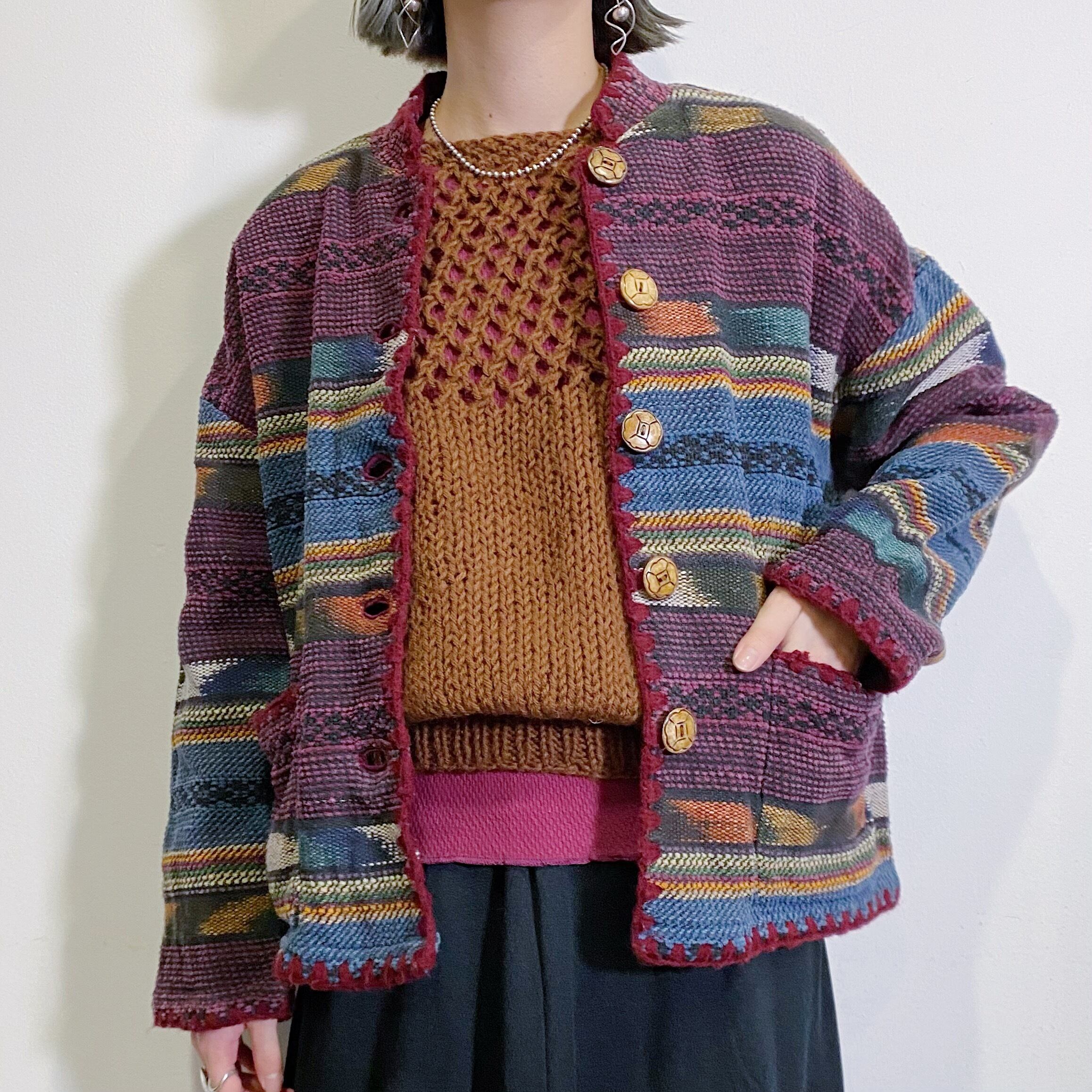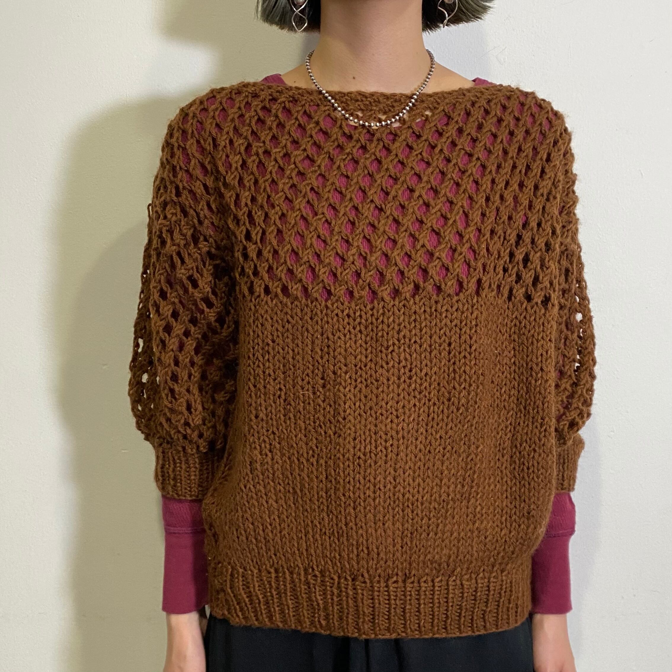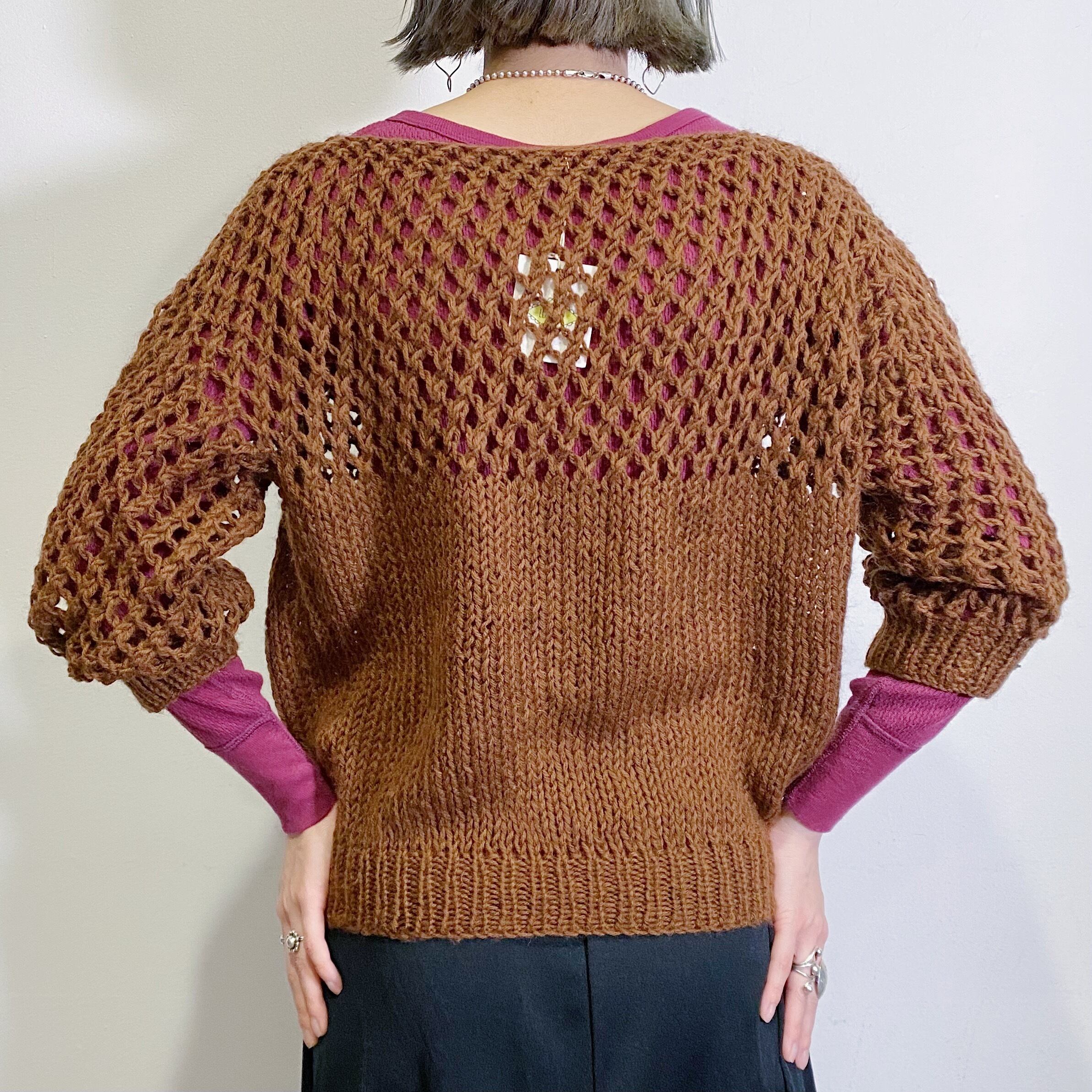 ブラウンカラーに透かし編みがかわいい、70年代のハンドニットセーターです。