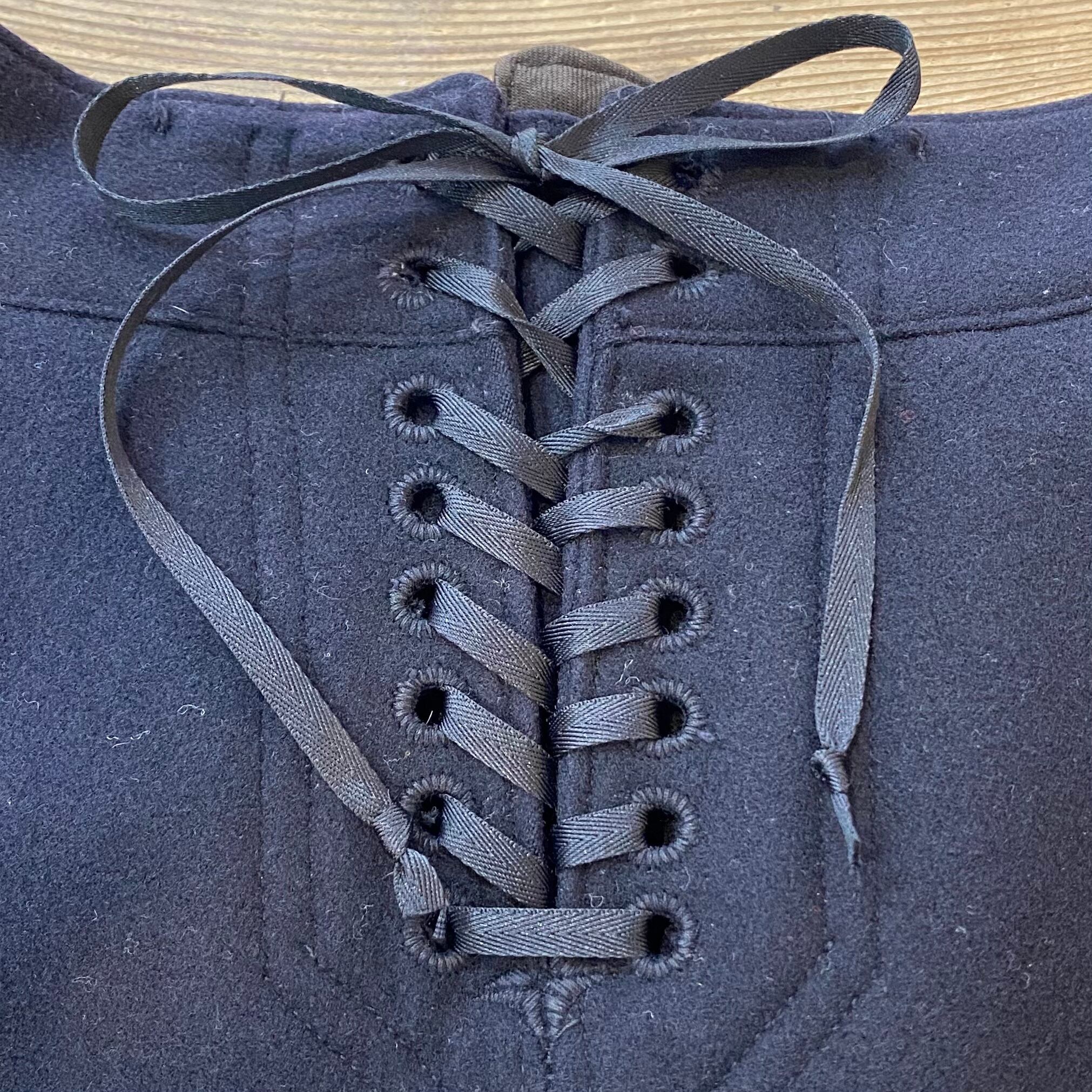 フロントのボタンやバックの編み上げデザインがポイントの一枚。