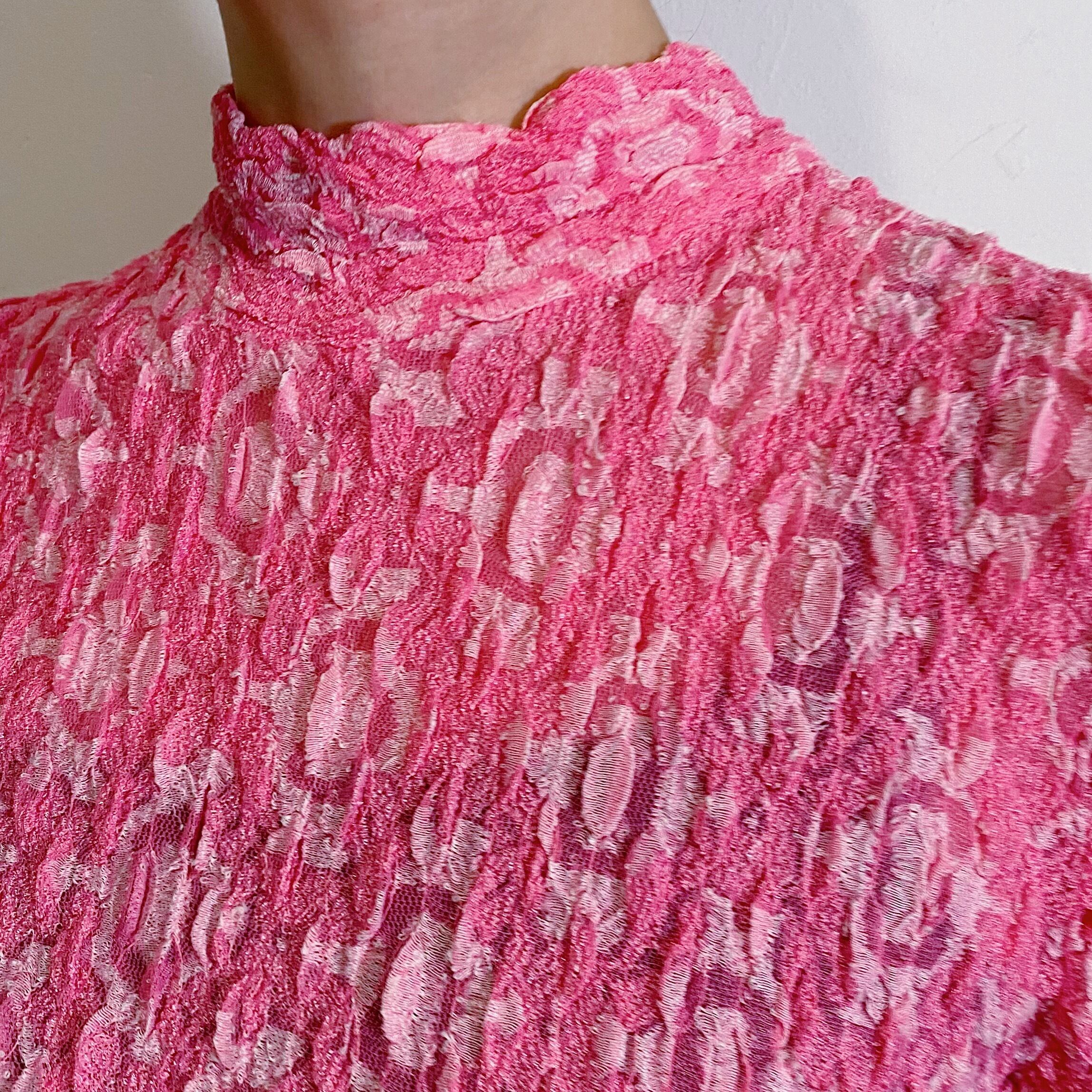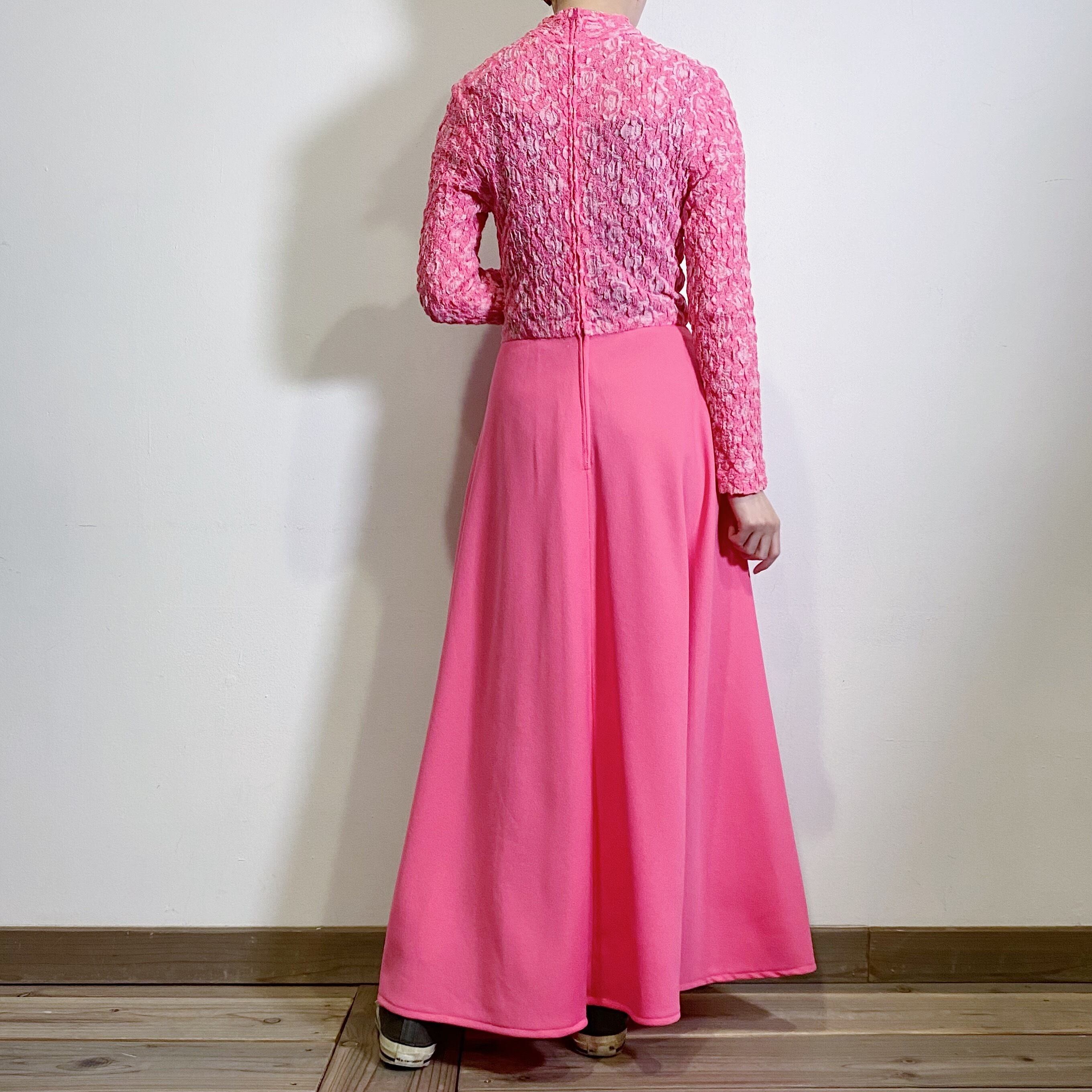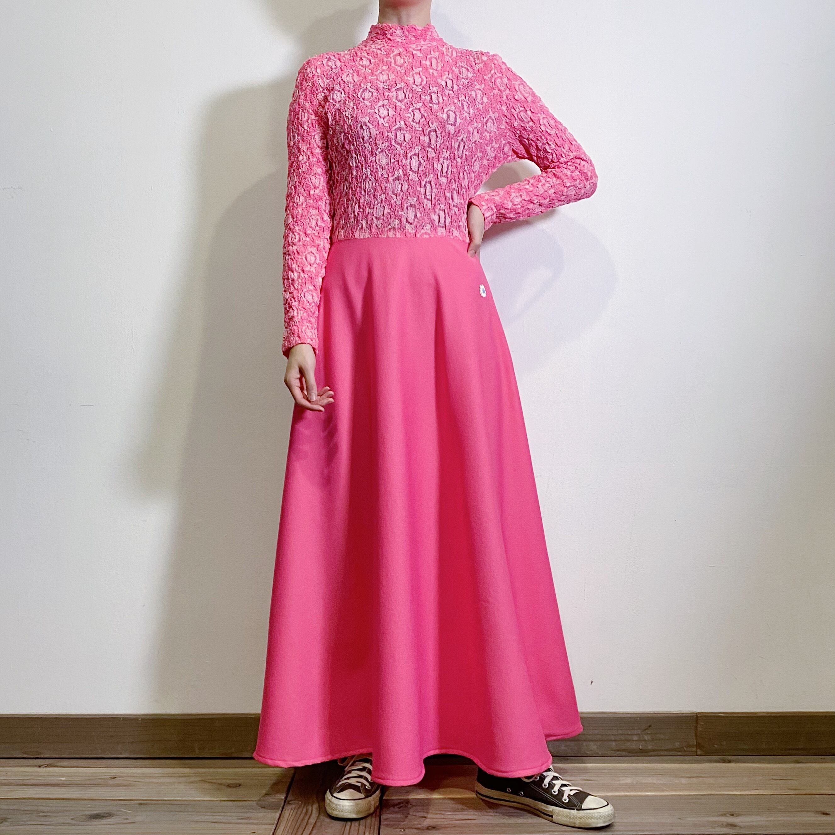 鮮やかなピンクにクシュっとした不思議な生地感がかわいい、70年代のロングワンピースです。
