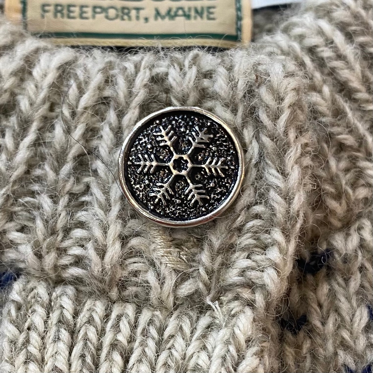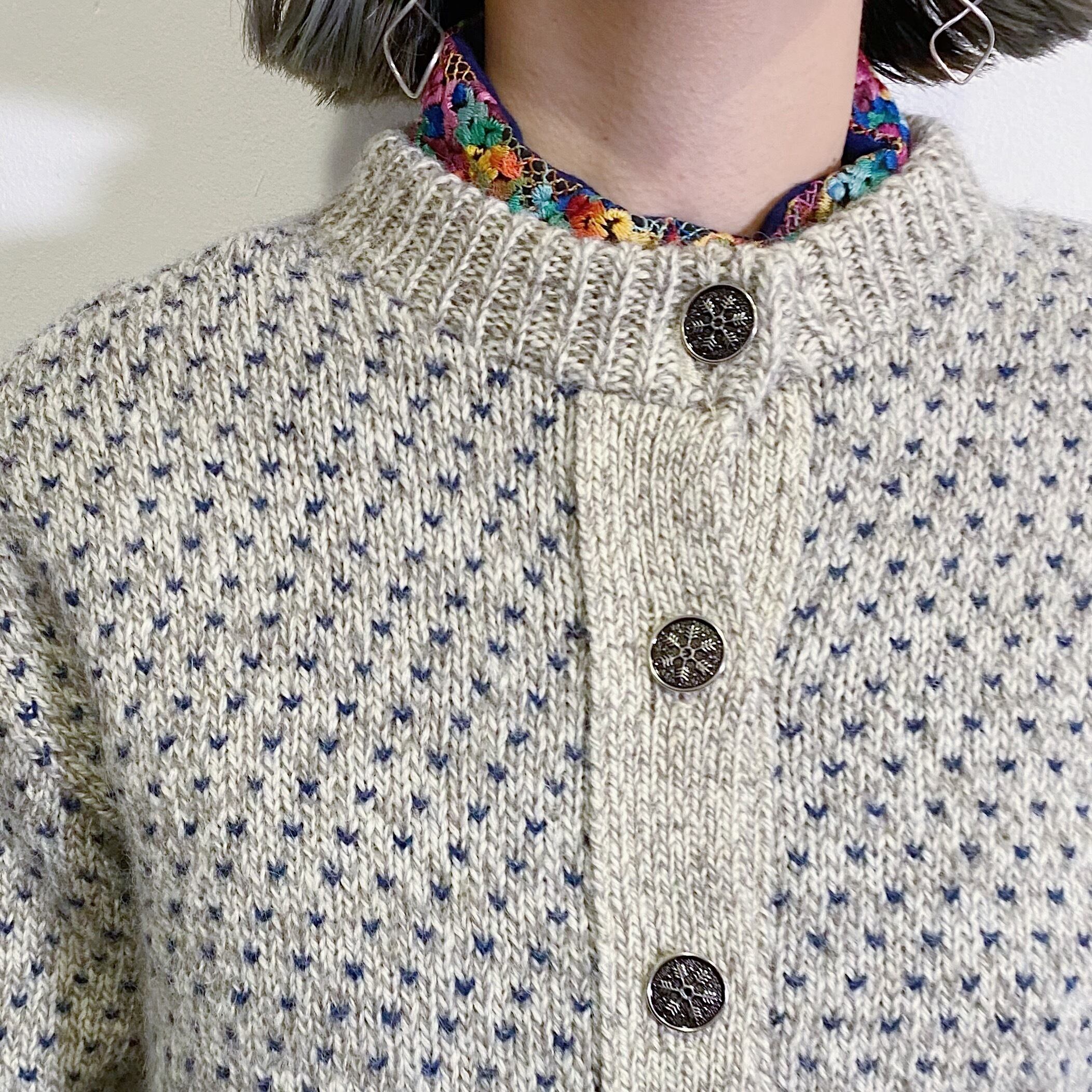 ネイビーの編み目はハートのようにも見え、ボタンは雪の結晶になっているのがポイントの一枚。
