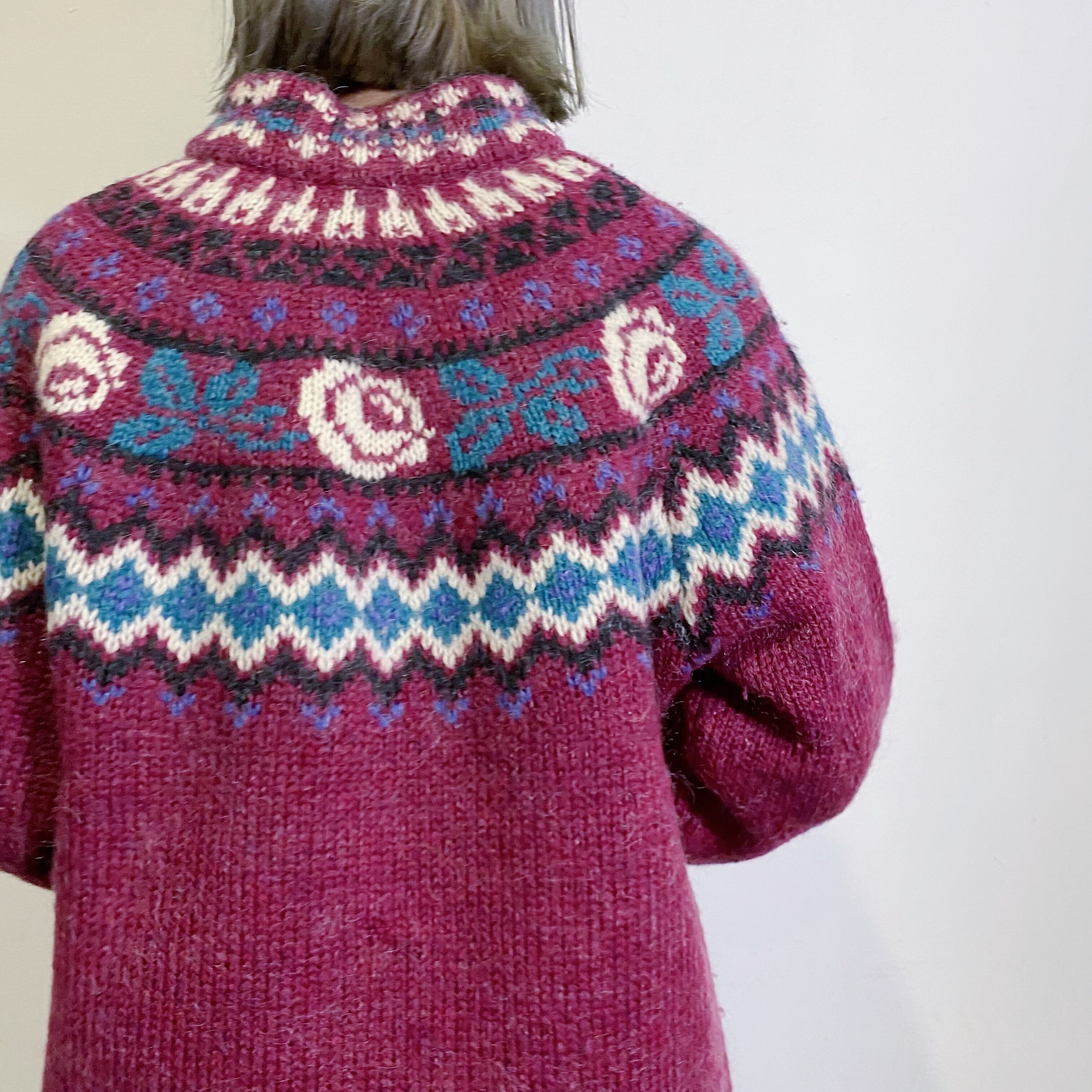 パープルのようなワインレッドのような絶妙な色合いが可愛い、ウールリッチのカーディガンです。
