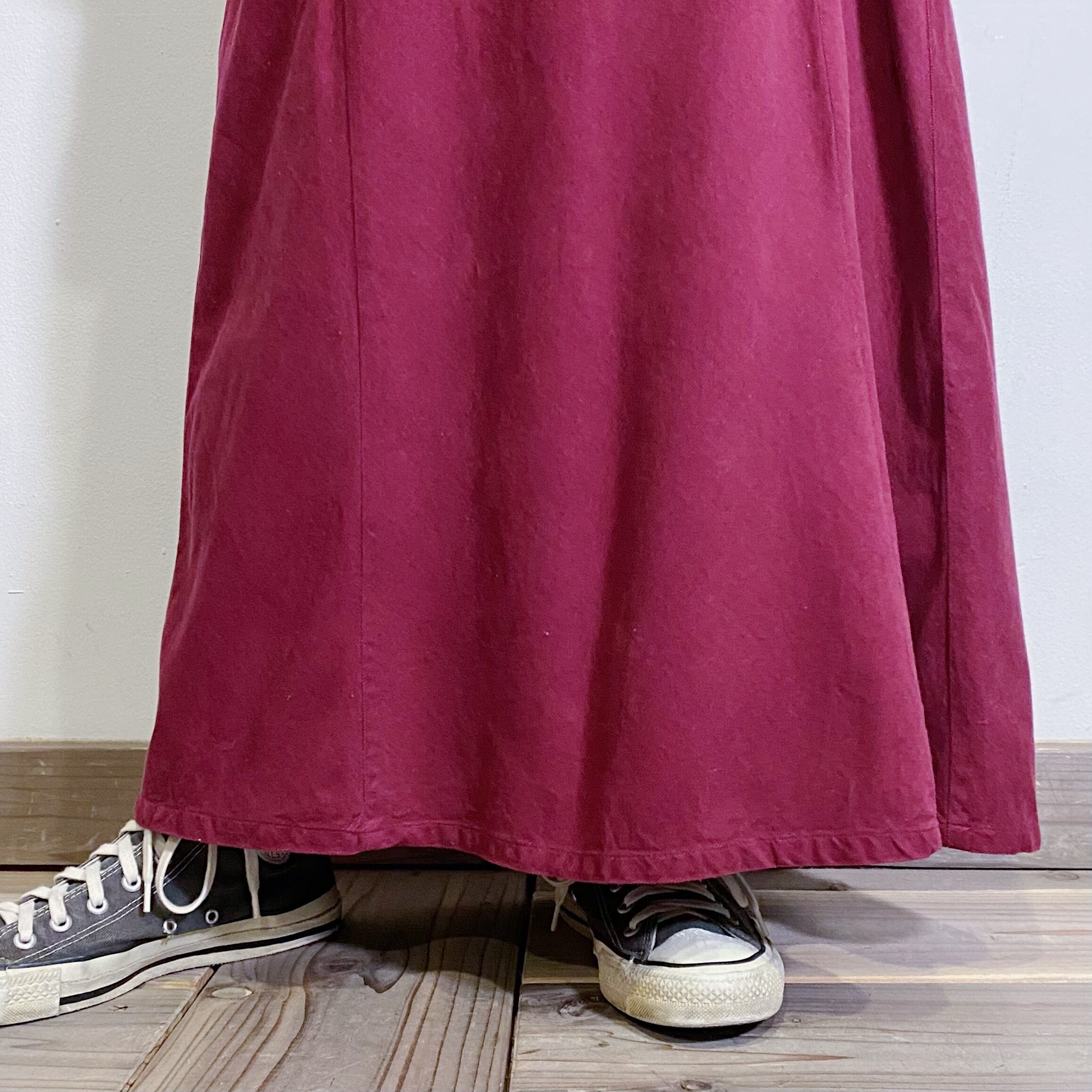 バーガンディカラーで落ち着いた印象の、コーデュロイスカートです。