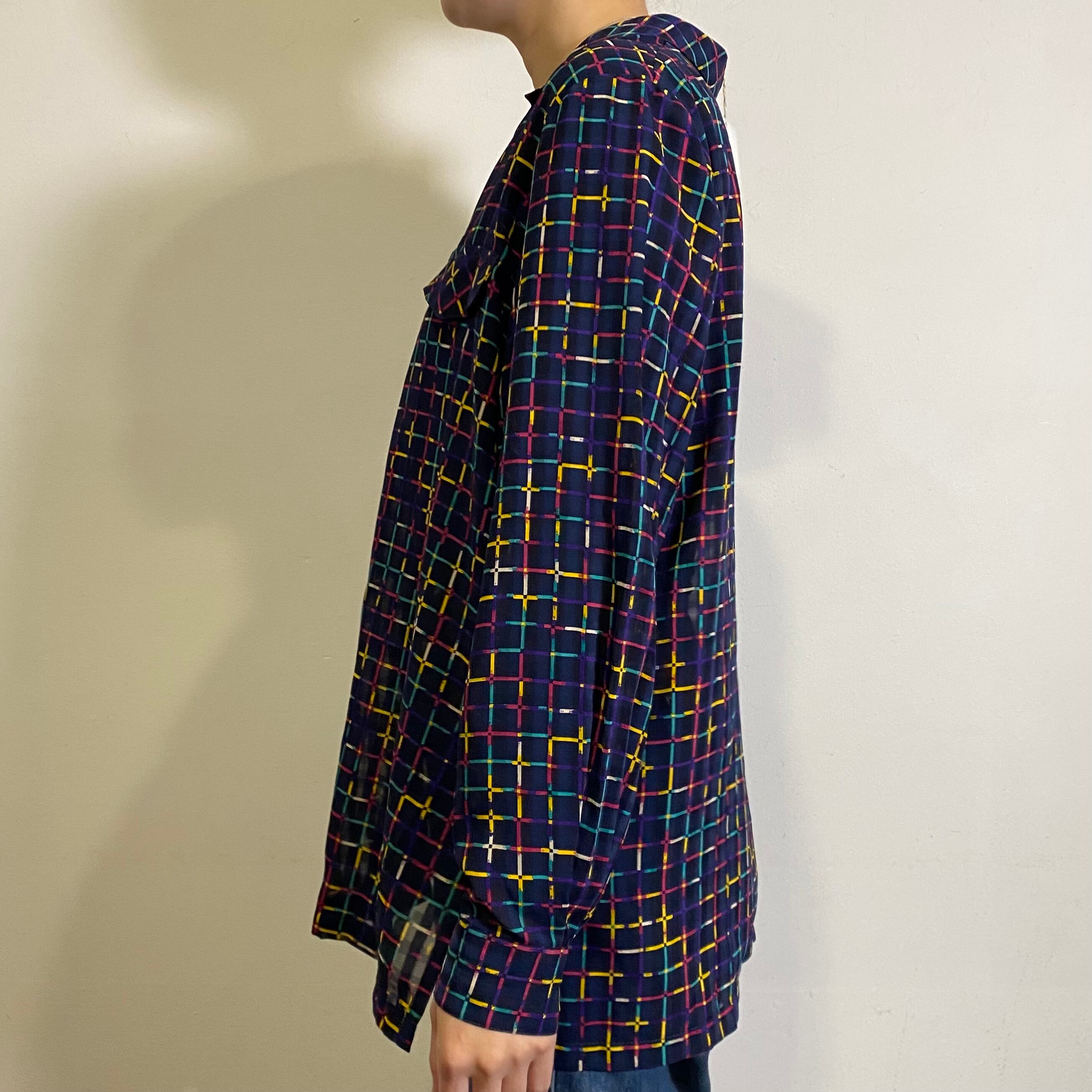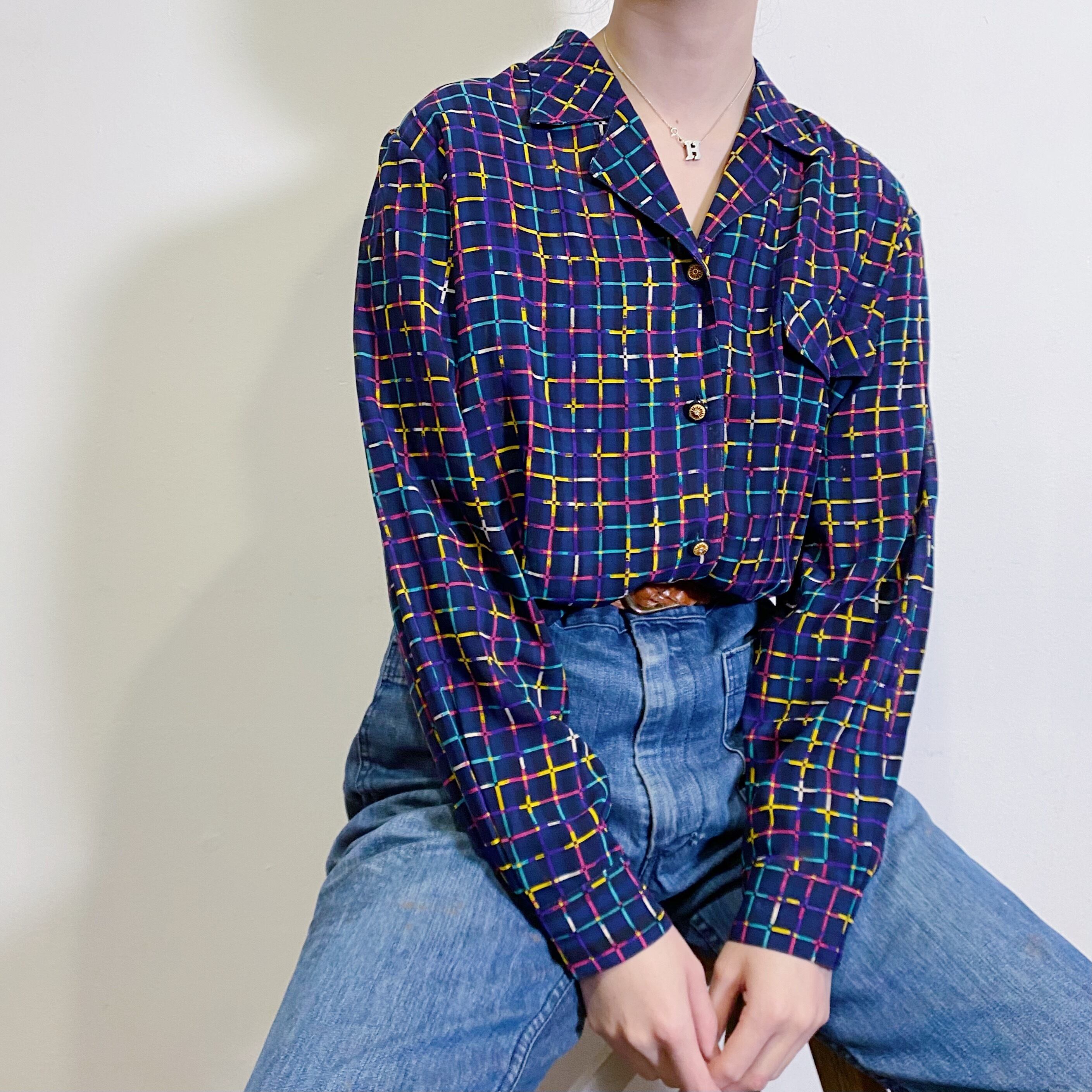 紺地にレインボーカラーのチェックが可愛い、とろんとした質感の80年代シャツです。