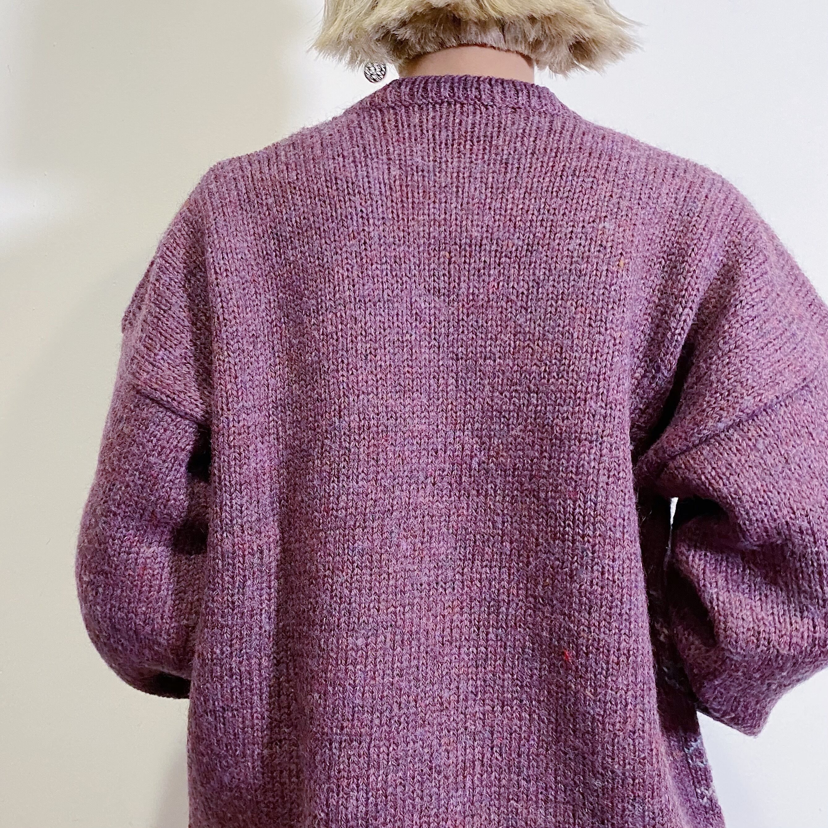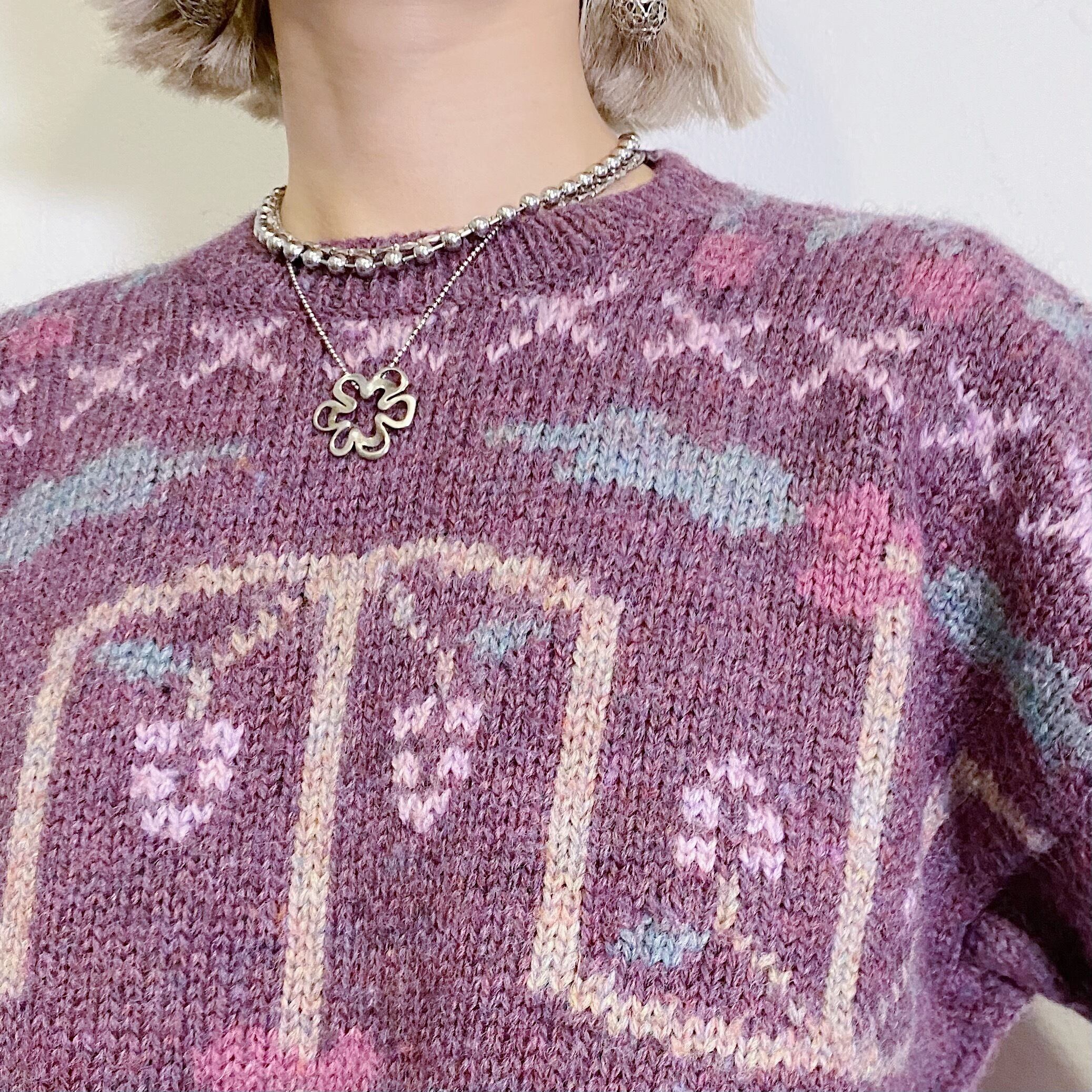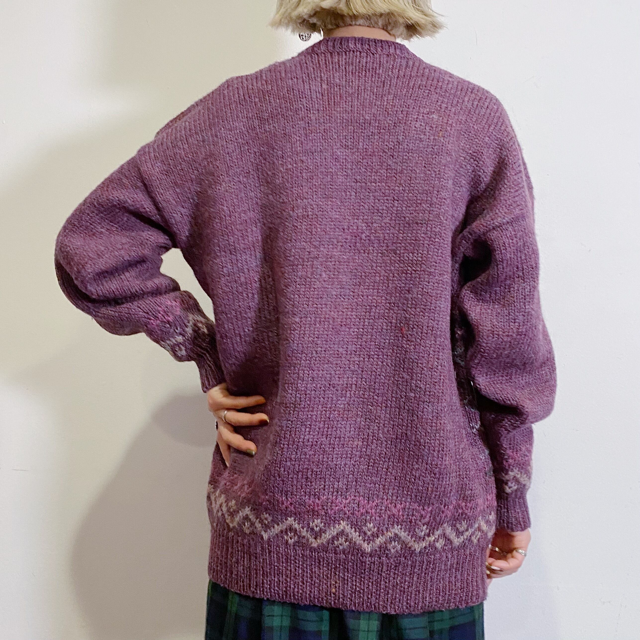 Purple grape and flower motif wool knit sweater