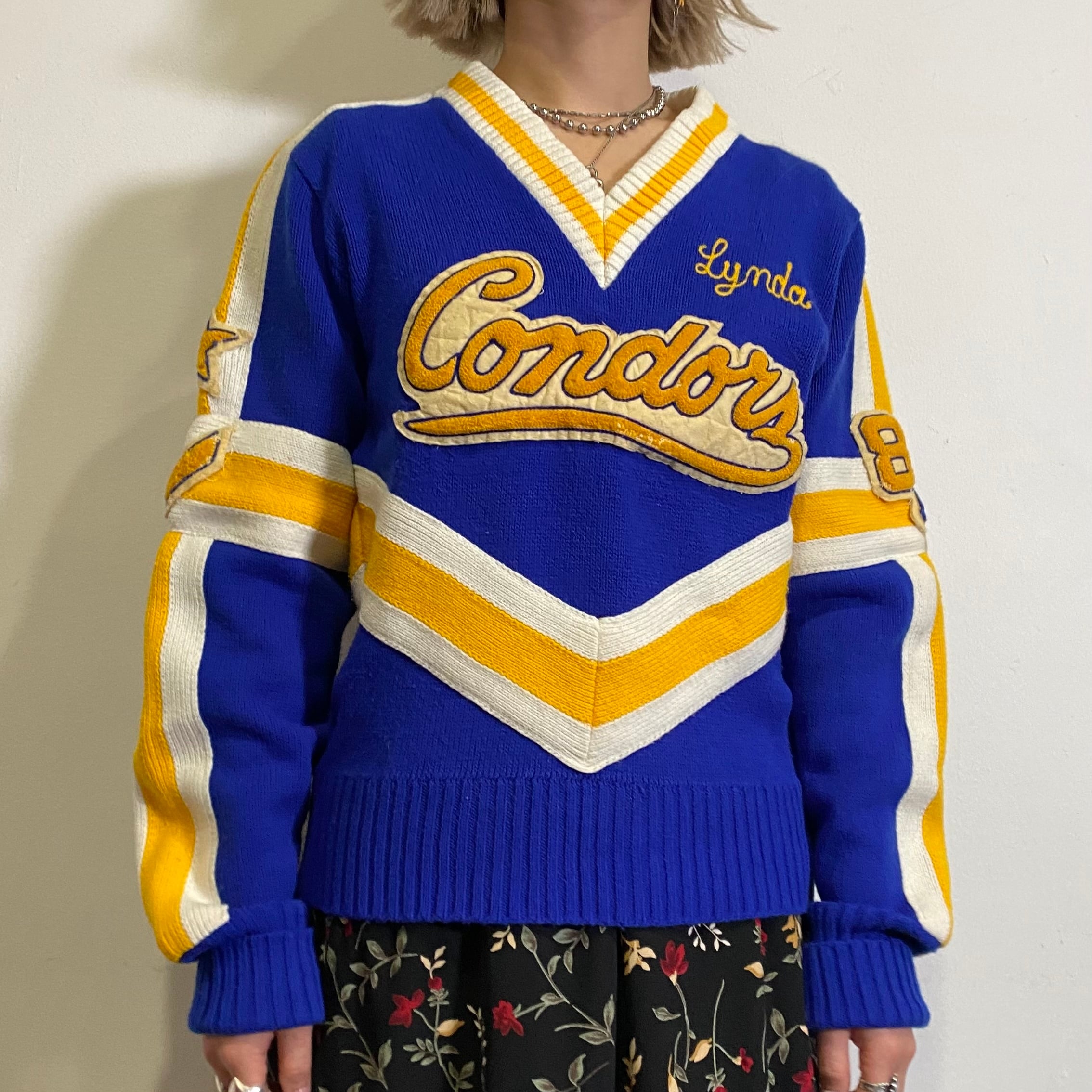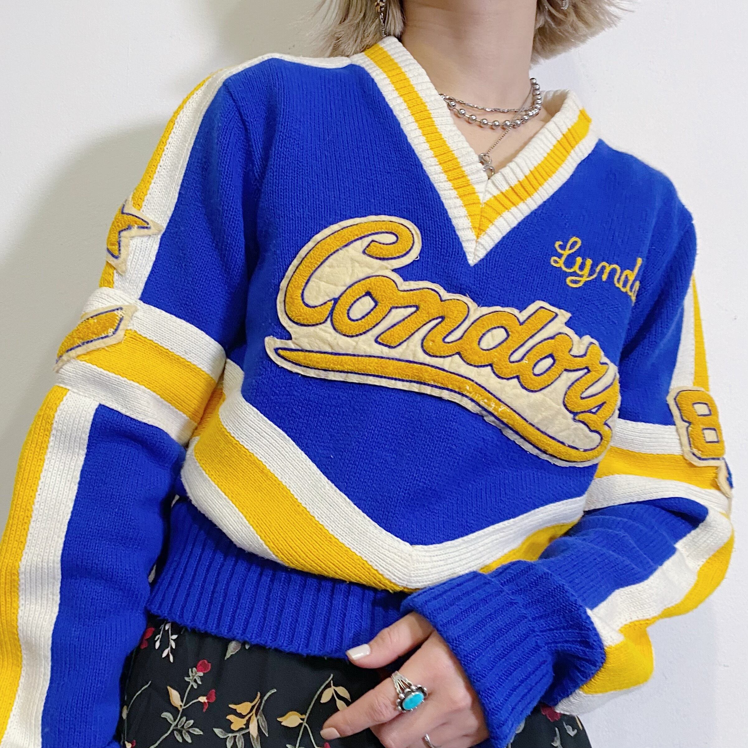 青と黄色の組み合わせが可愛い、チアリーダーニットです。