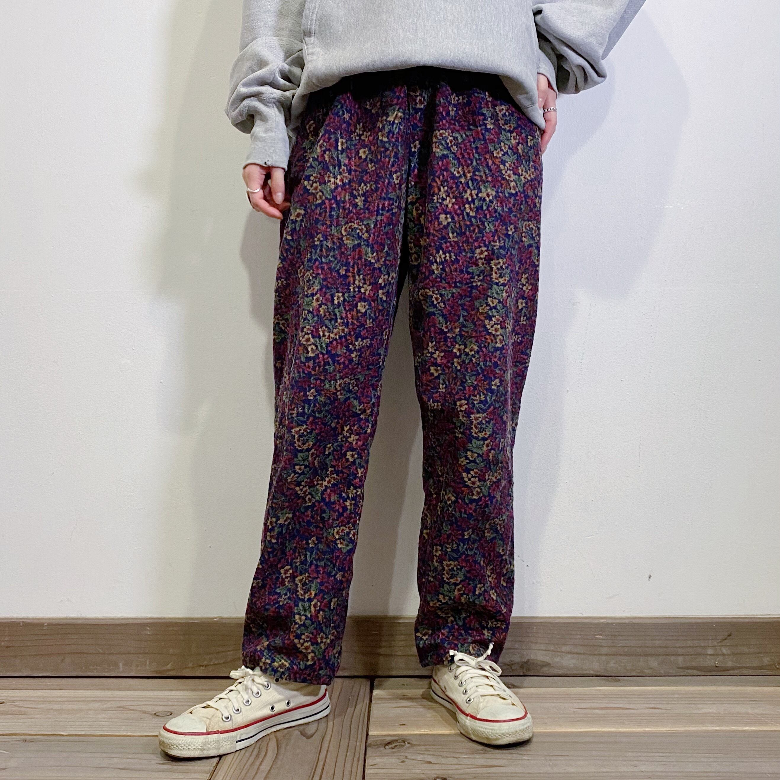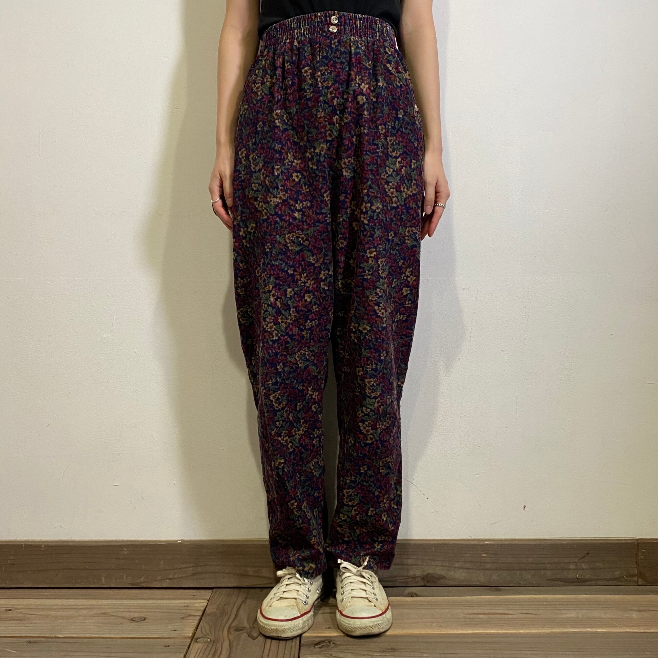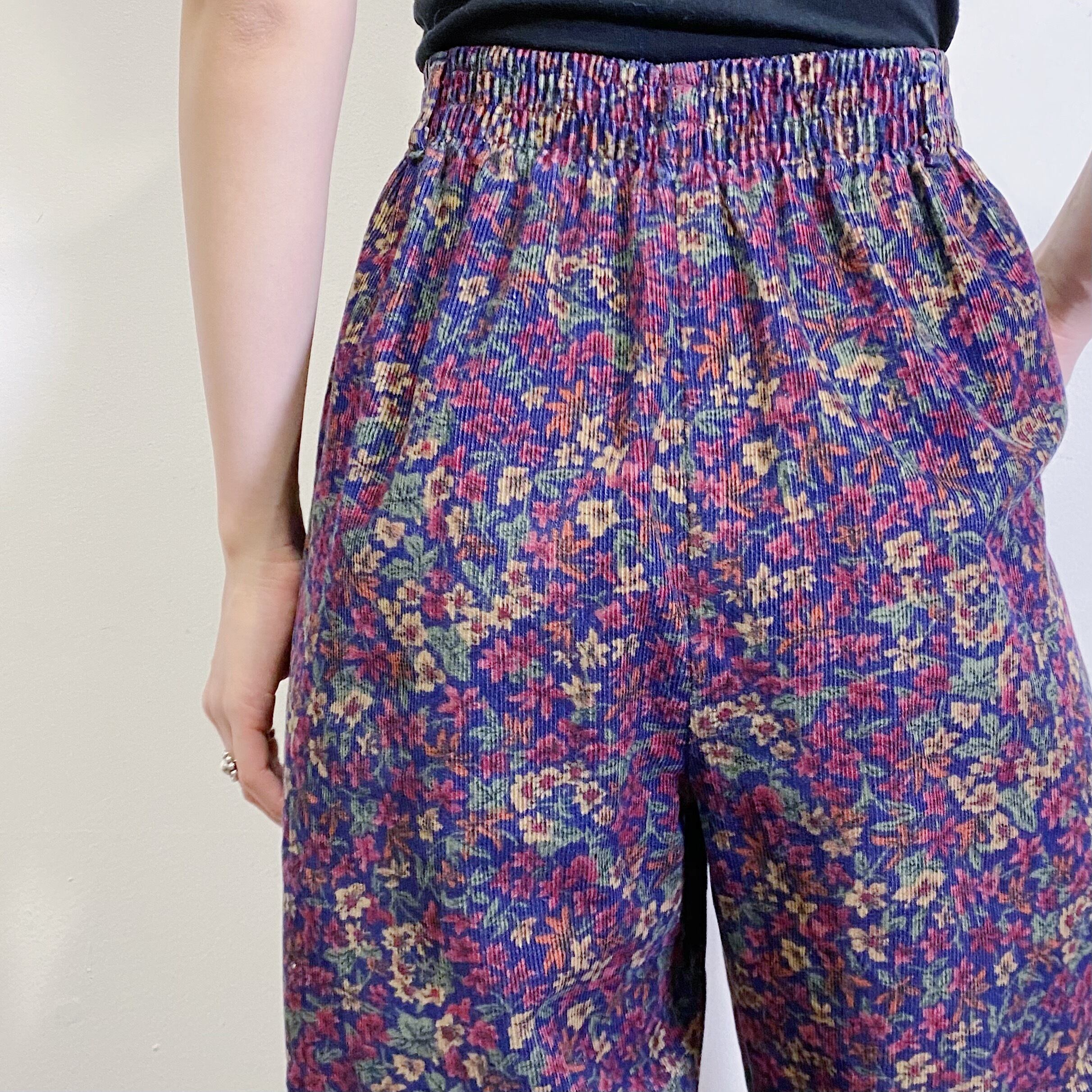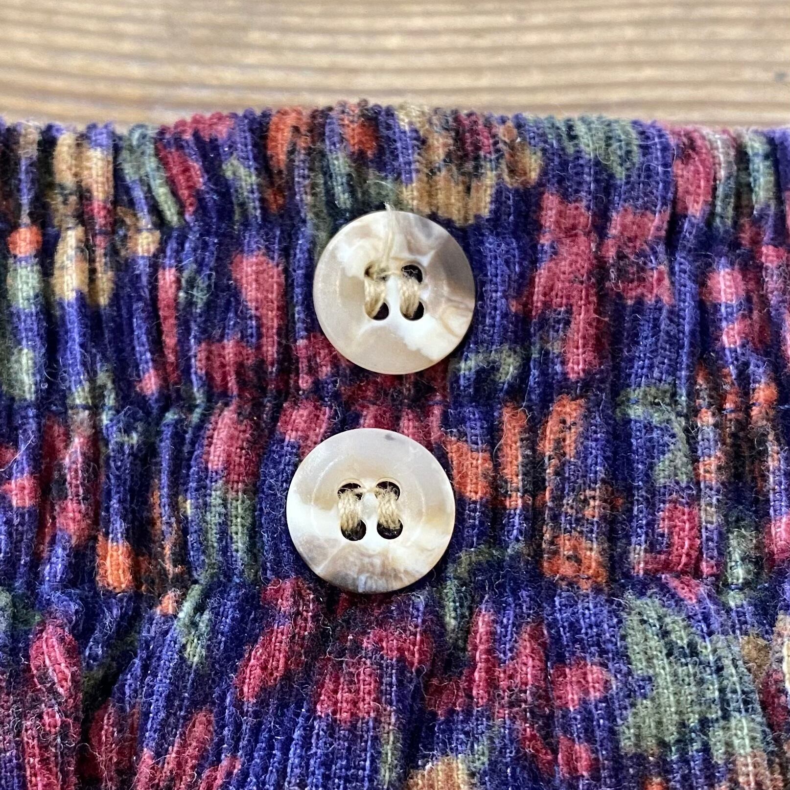 ネイビーベースに小花柄のテキスタイルが可愛い、コーデュロイ素材のイージーパンツです。