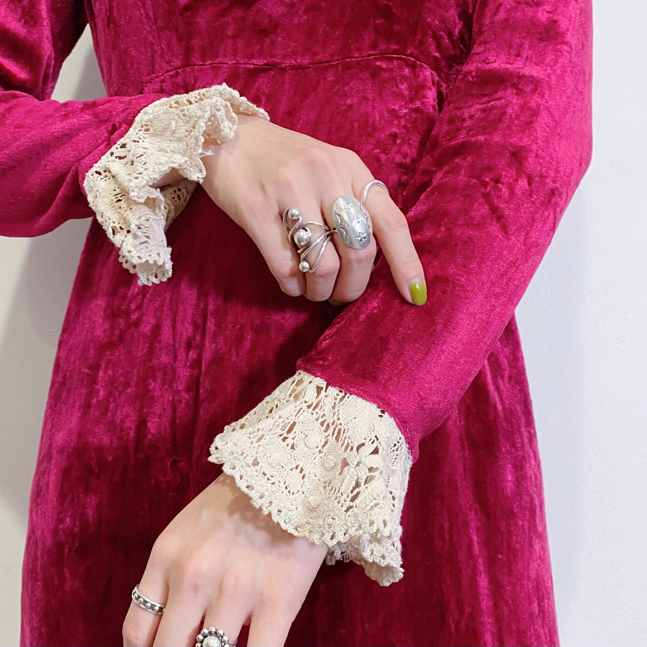 深い赤に白のレースが可愛い、70年代のベロアワンピースです。