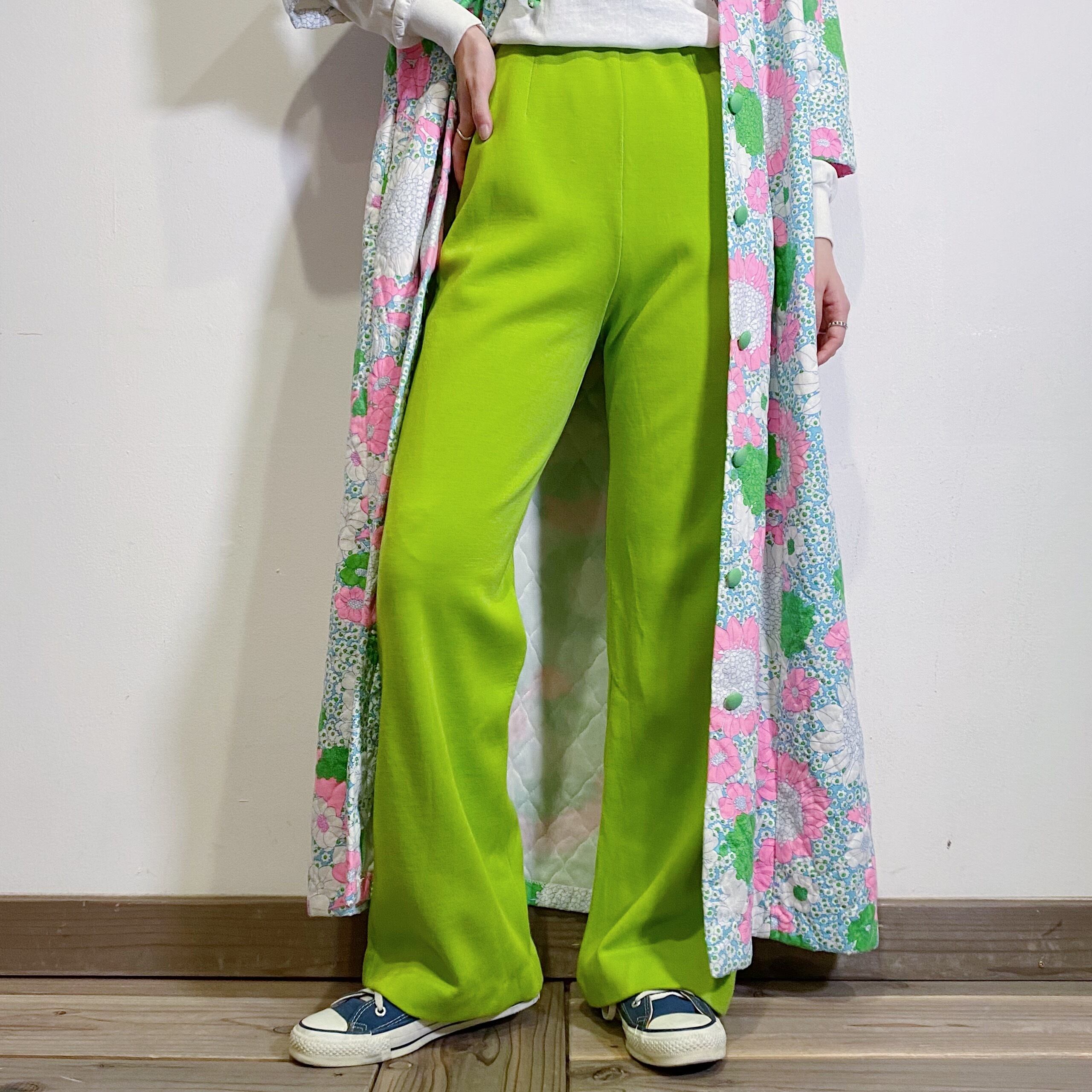 鮮やかなライムグリーンが目を惹く、70年代のフレアパンツです。