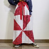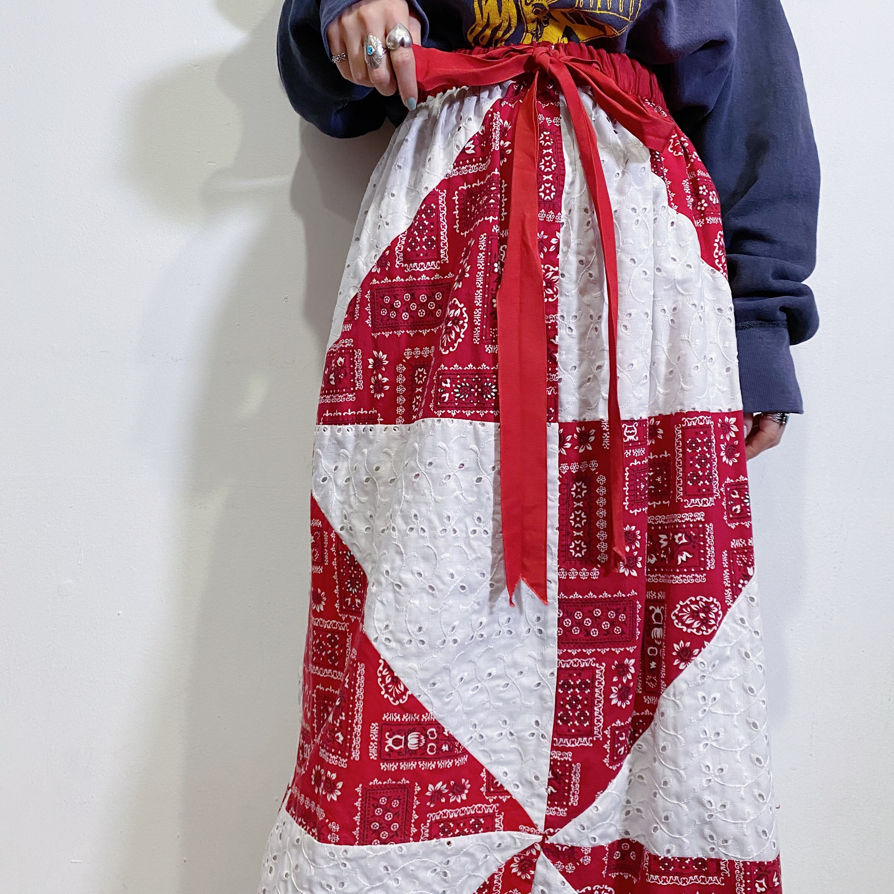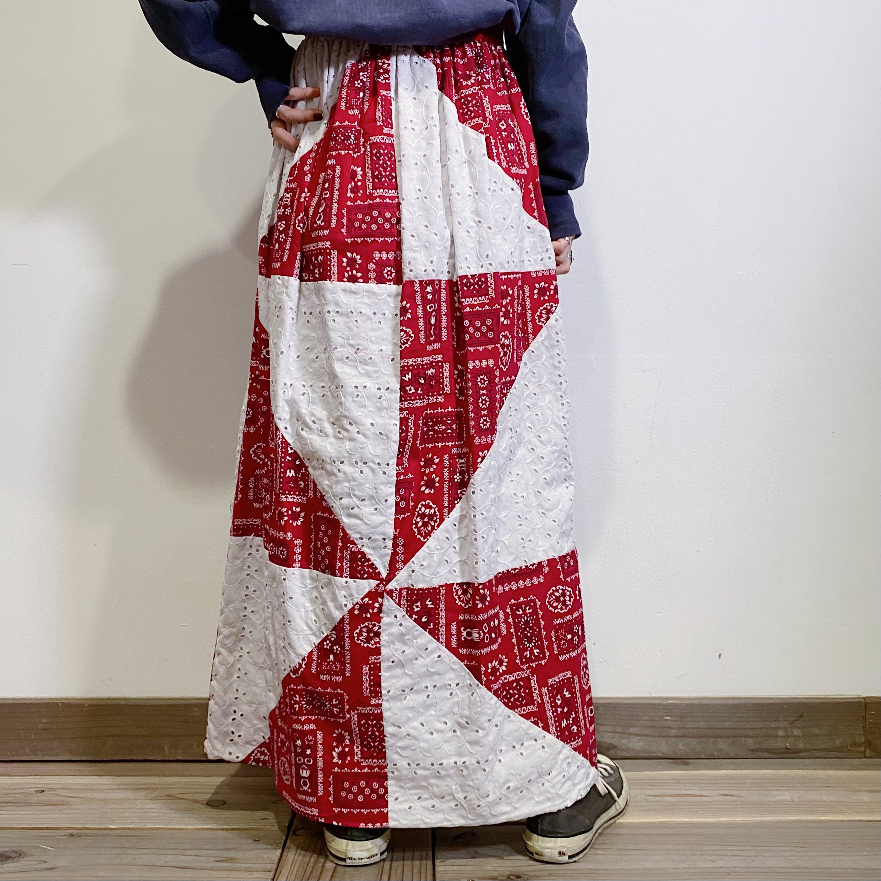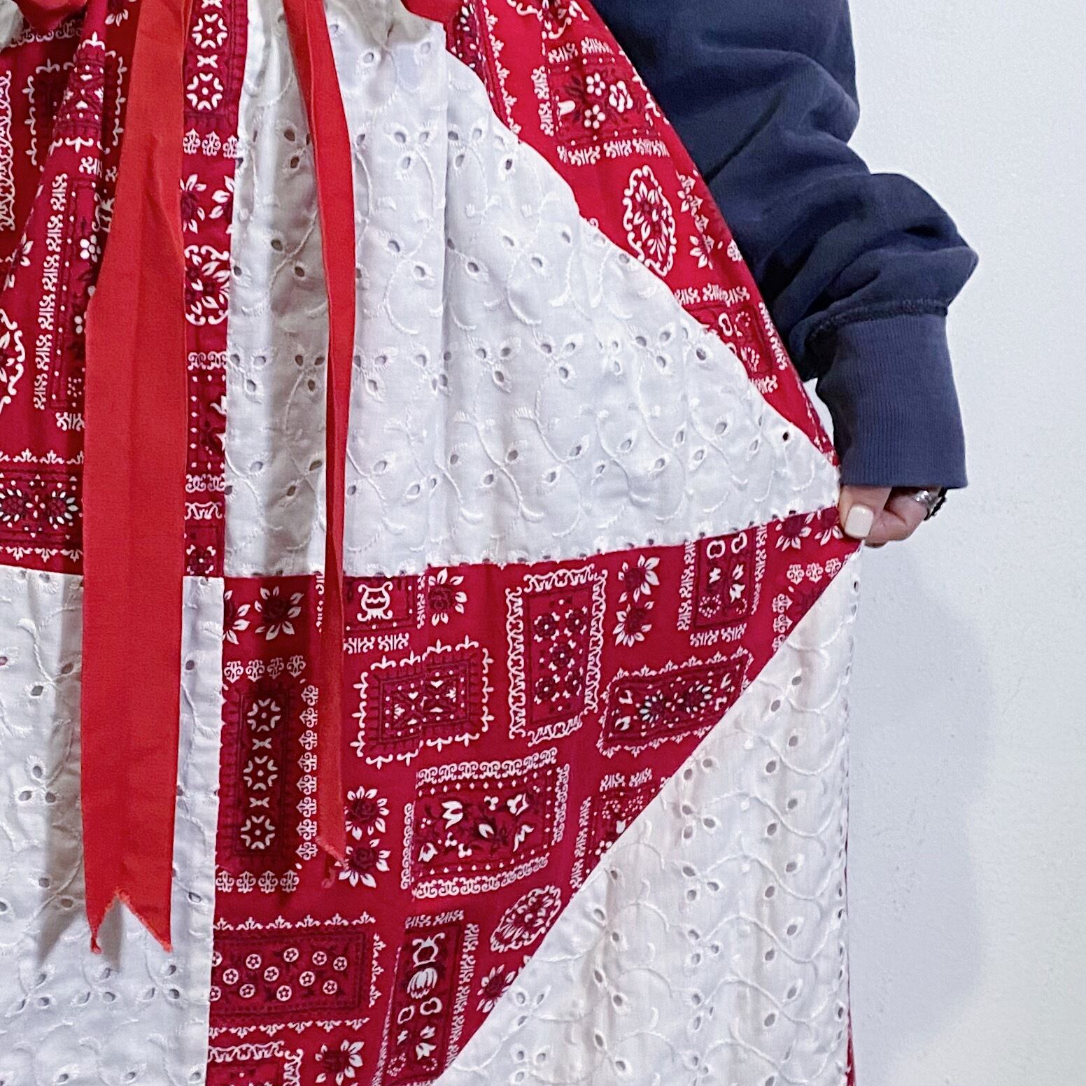 赤のバンダナ柄とレース生地のパッチワークがとってもかわいい、70年代のロングスカートです。