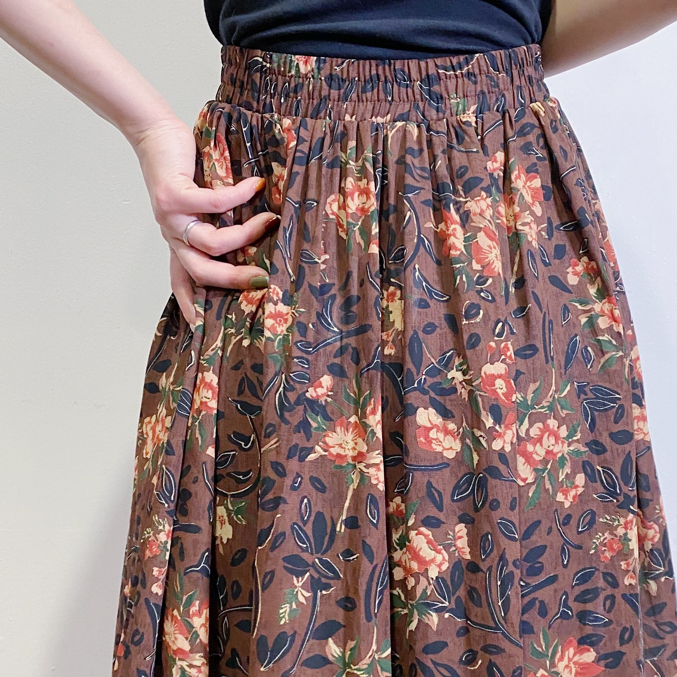 ブラウンベースにオレンジのボタニカルな花柄が可愛い、90年代のフレアスカートです。