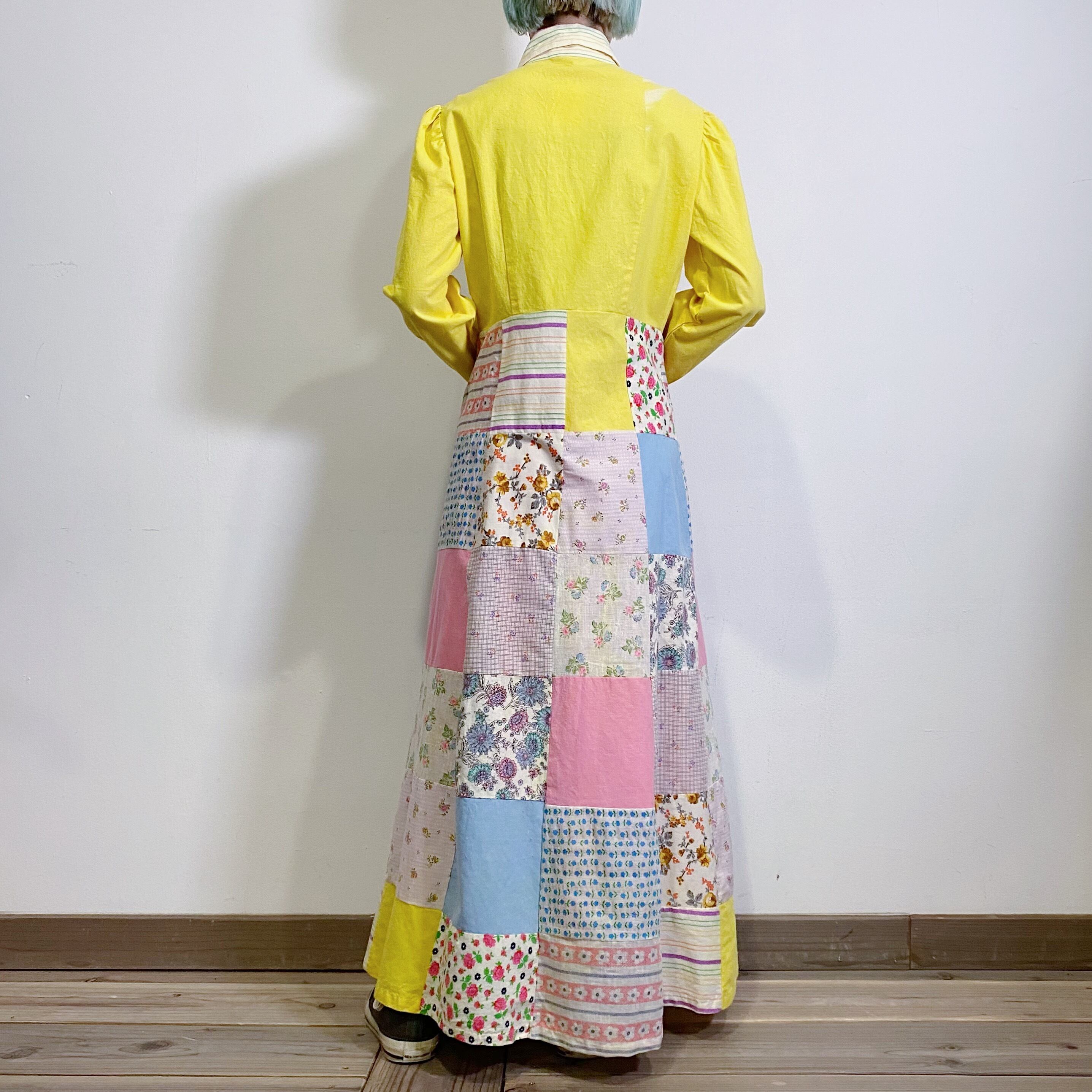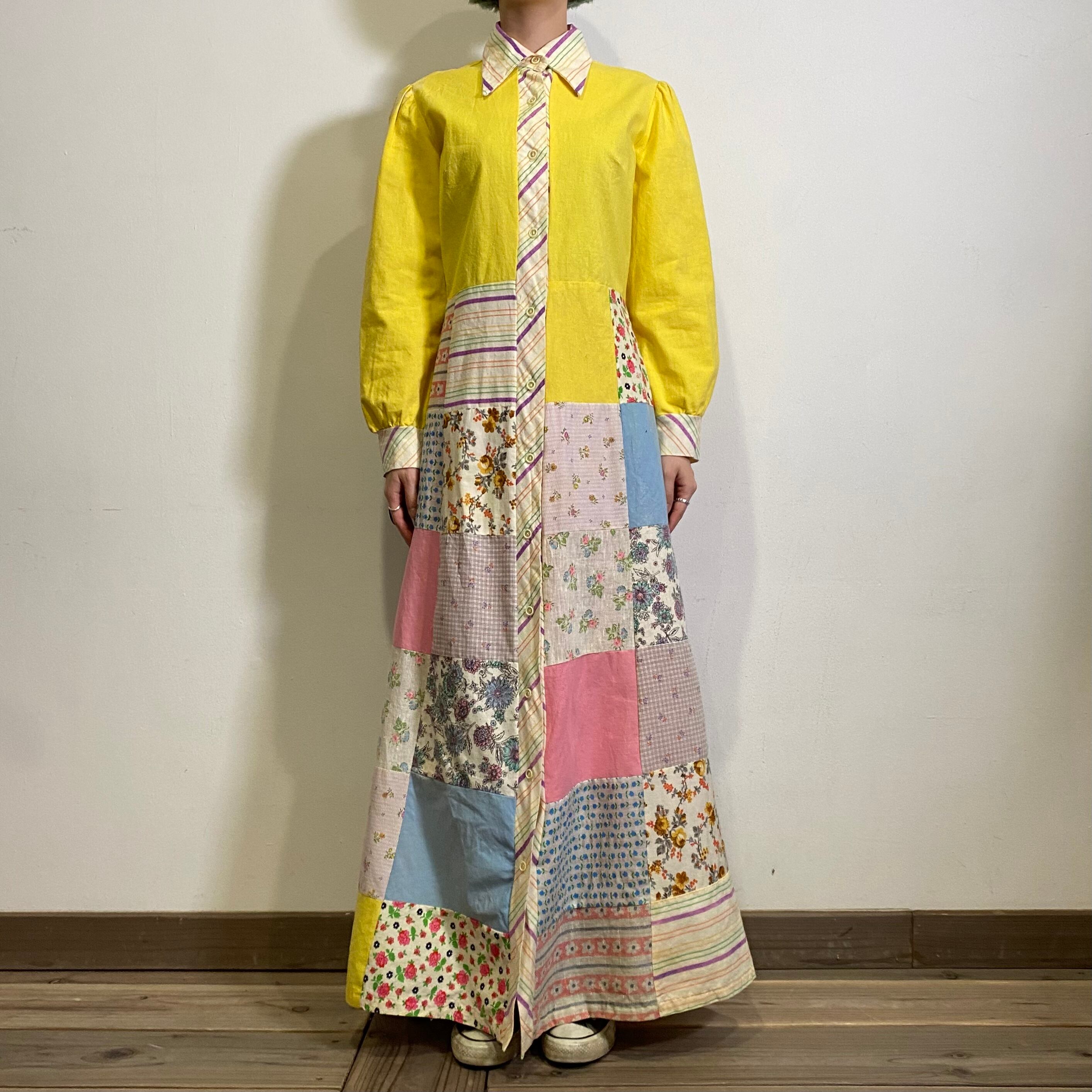 花柄やストライプのパッチワークが可愛い、70年代のスペシャルなシャツワンピースです。