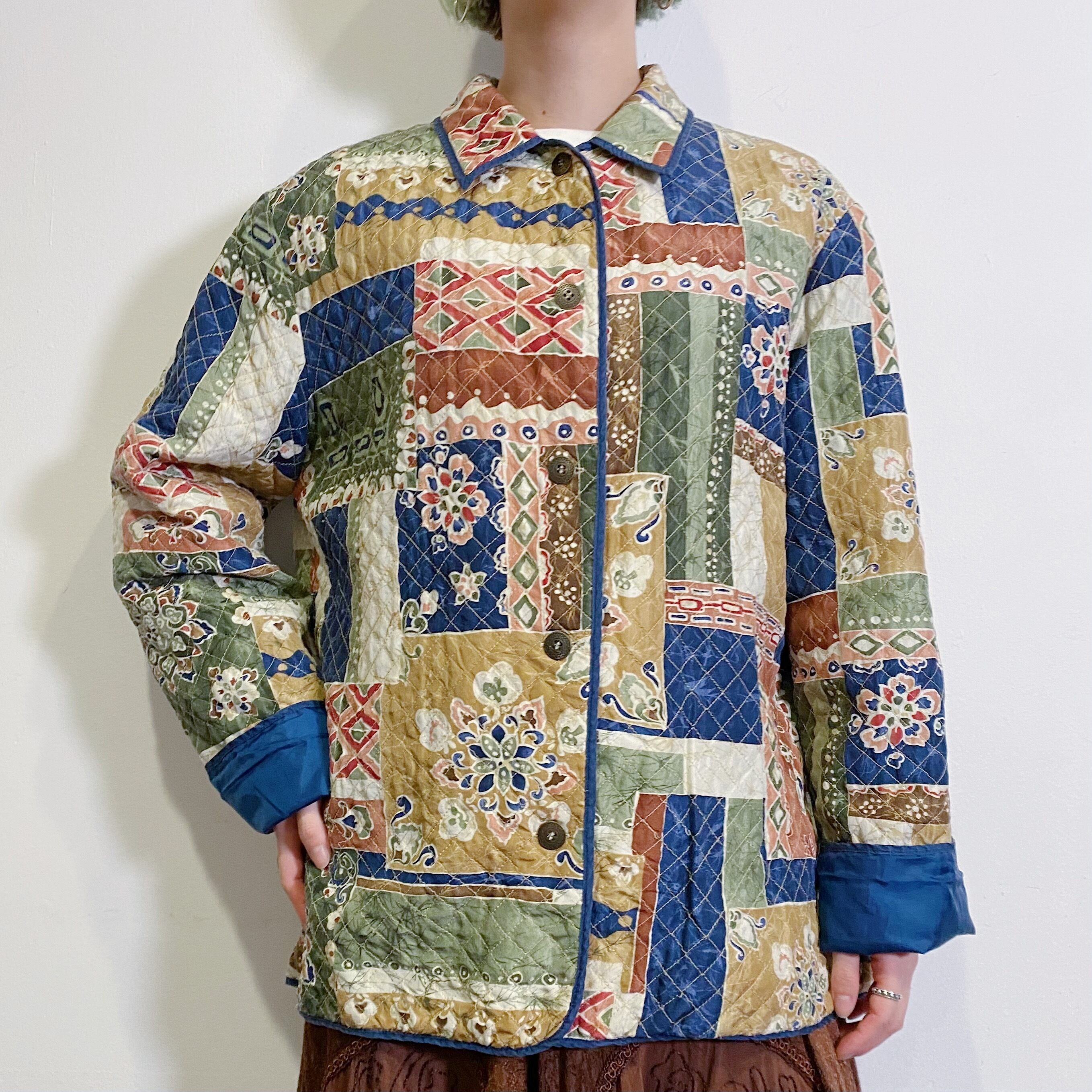 丸や四角が並ぶ不思議なタイルのような柄のパッチワークプリントが可愛いです。