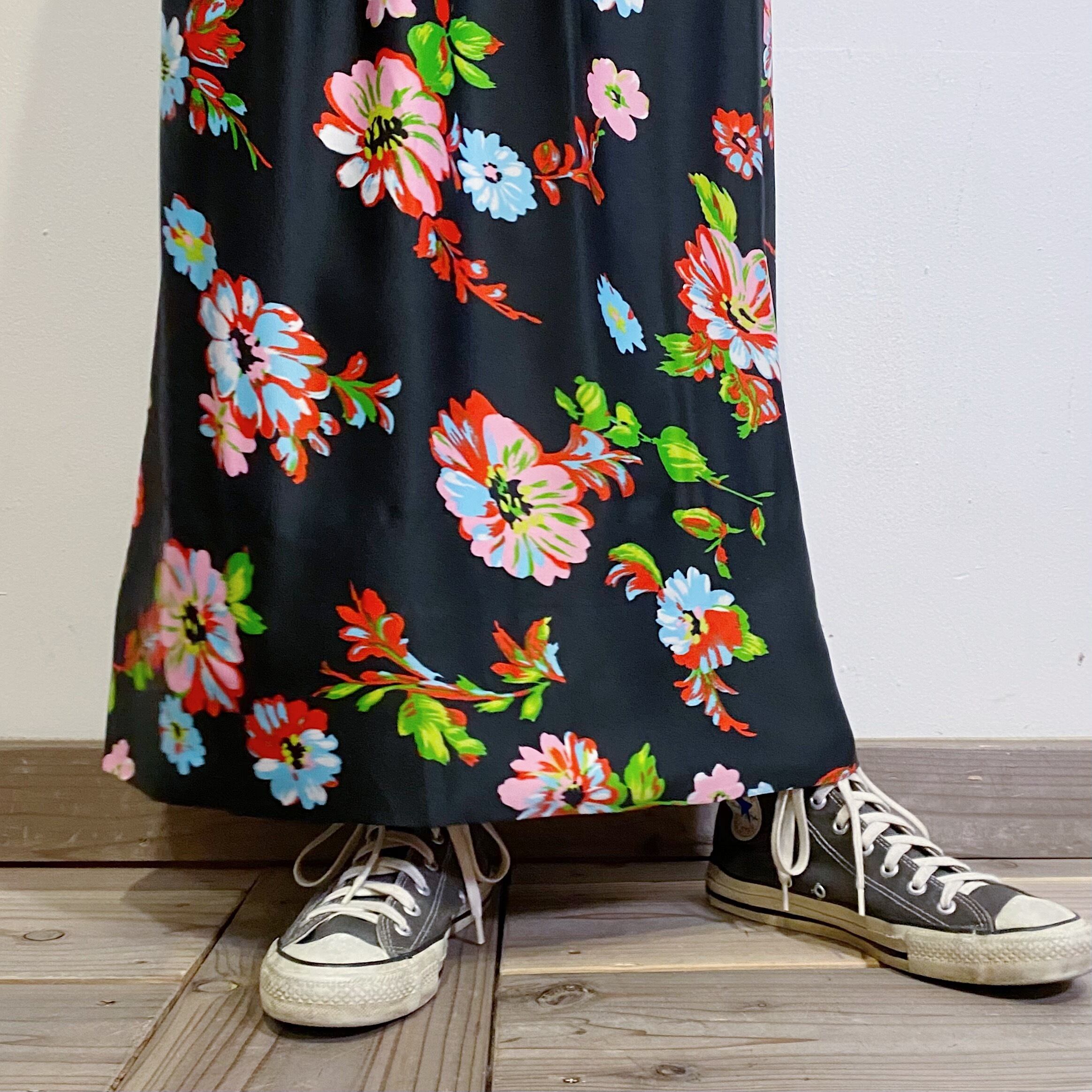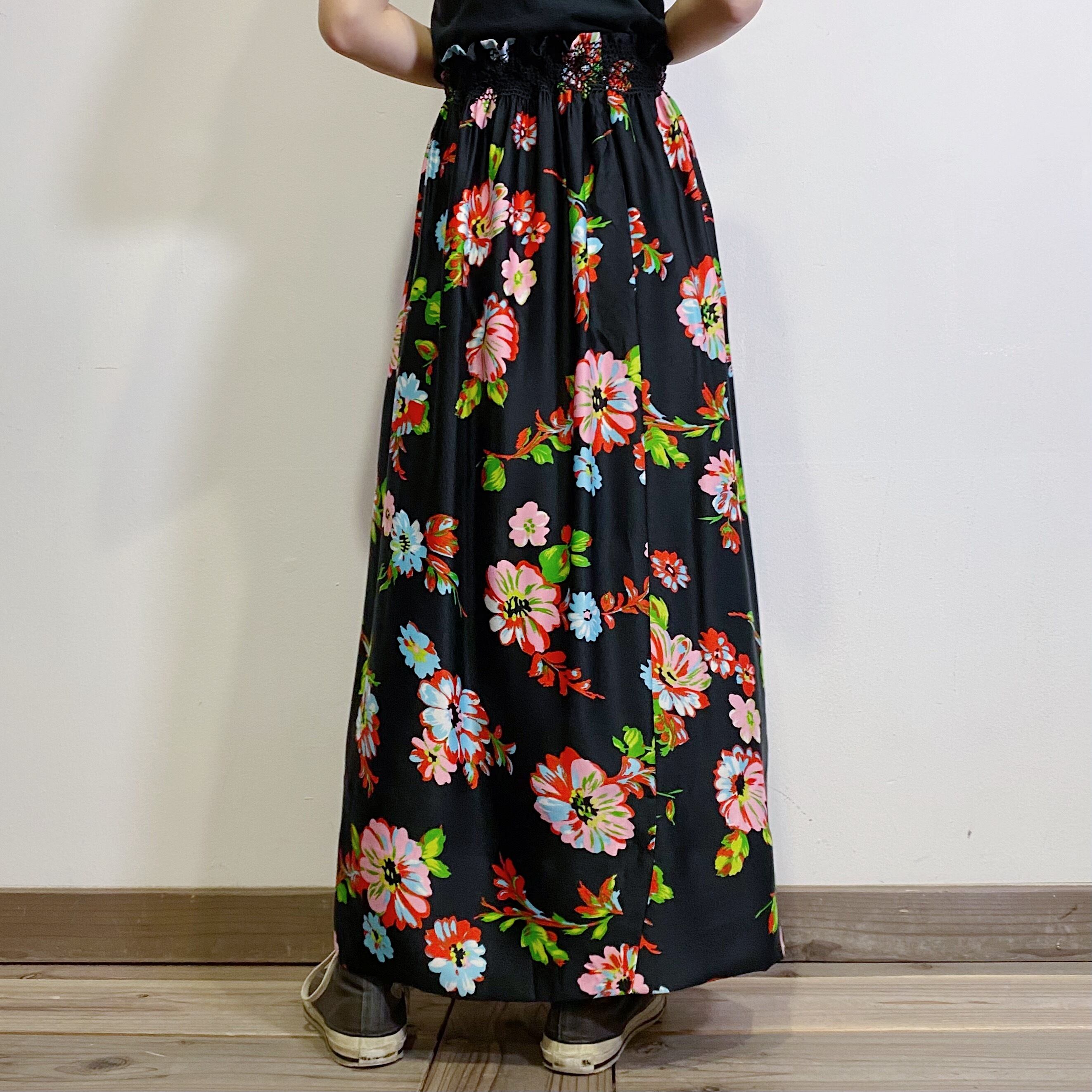ブラックベースにピンクや水色の花柄が可愛い、70年代のスカートです。