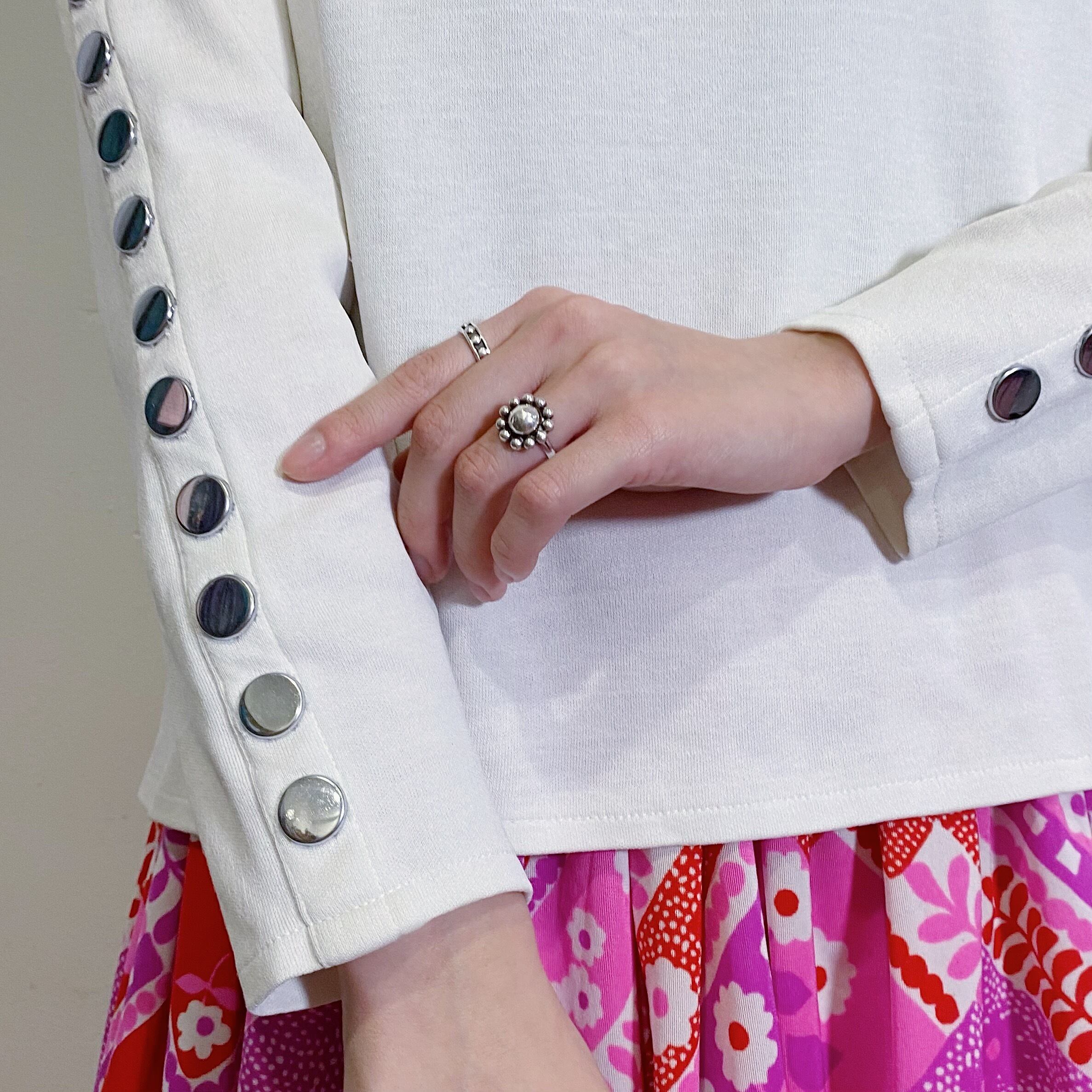 ホワイトカラーのカットソー素材で肌触りもよく、着こなしやすい一枚。