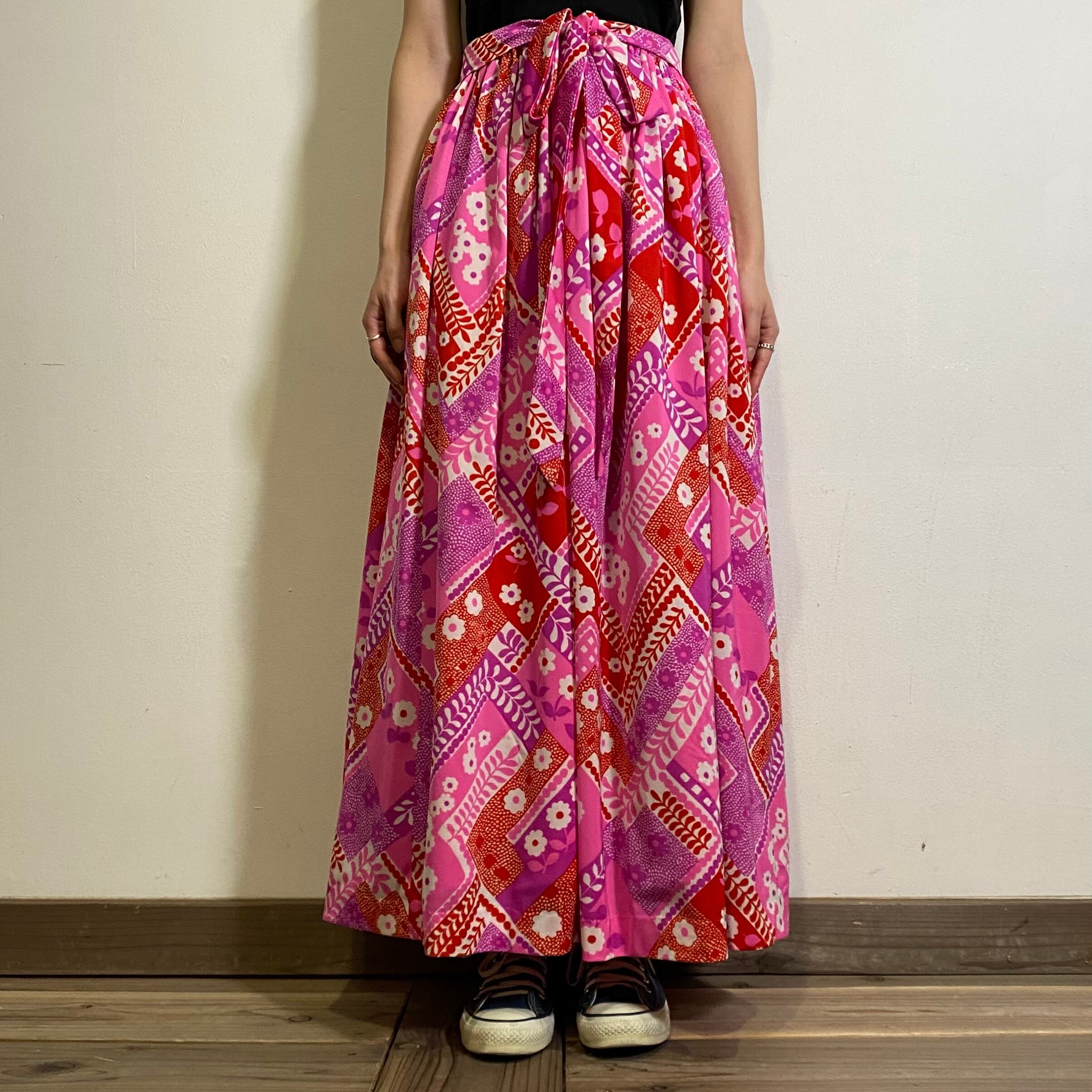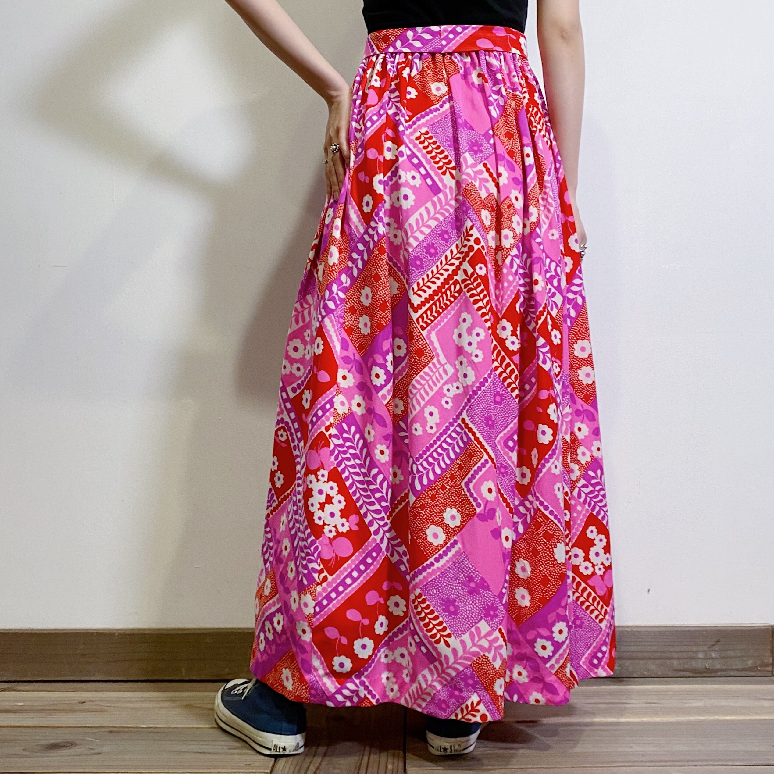 サイケデリックなお花や葉っぱ柄がとってもかわいい、70年代のロングスカートです。