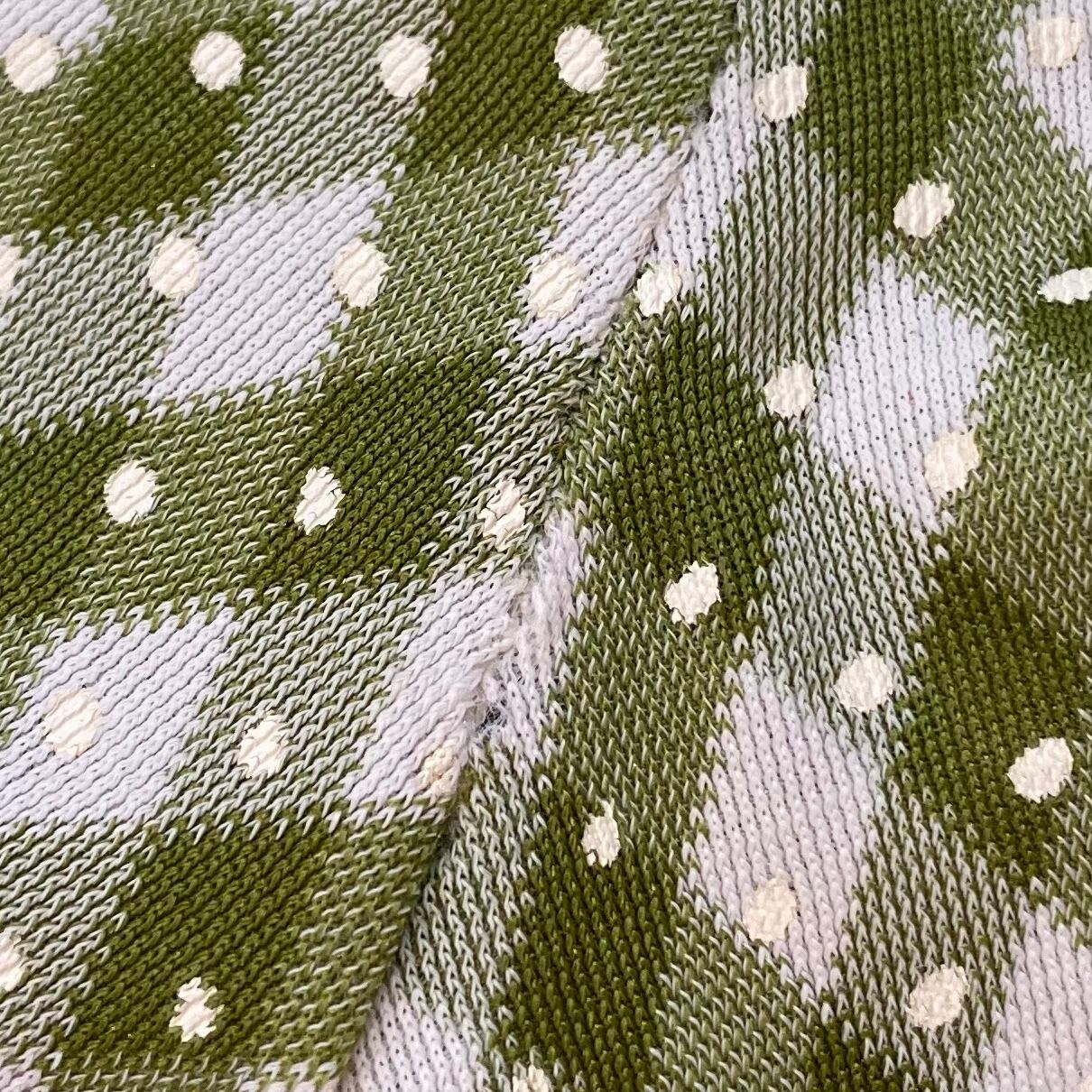 緑と白のチェック地にピンドットがプリントされたキュートな一枚。