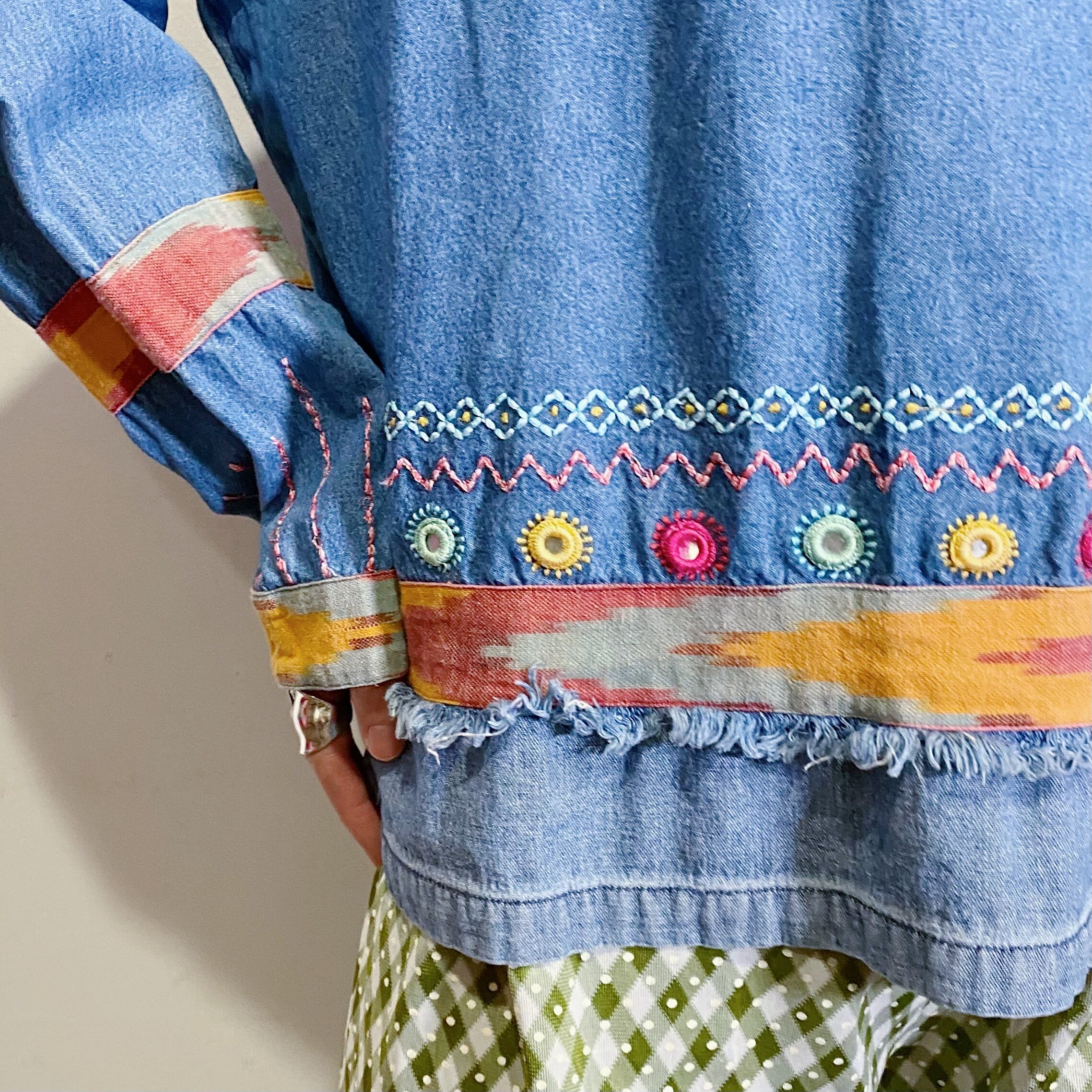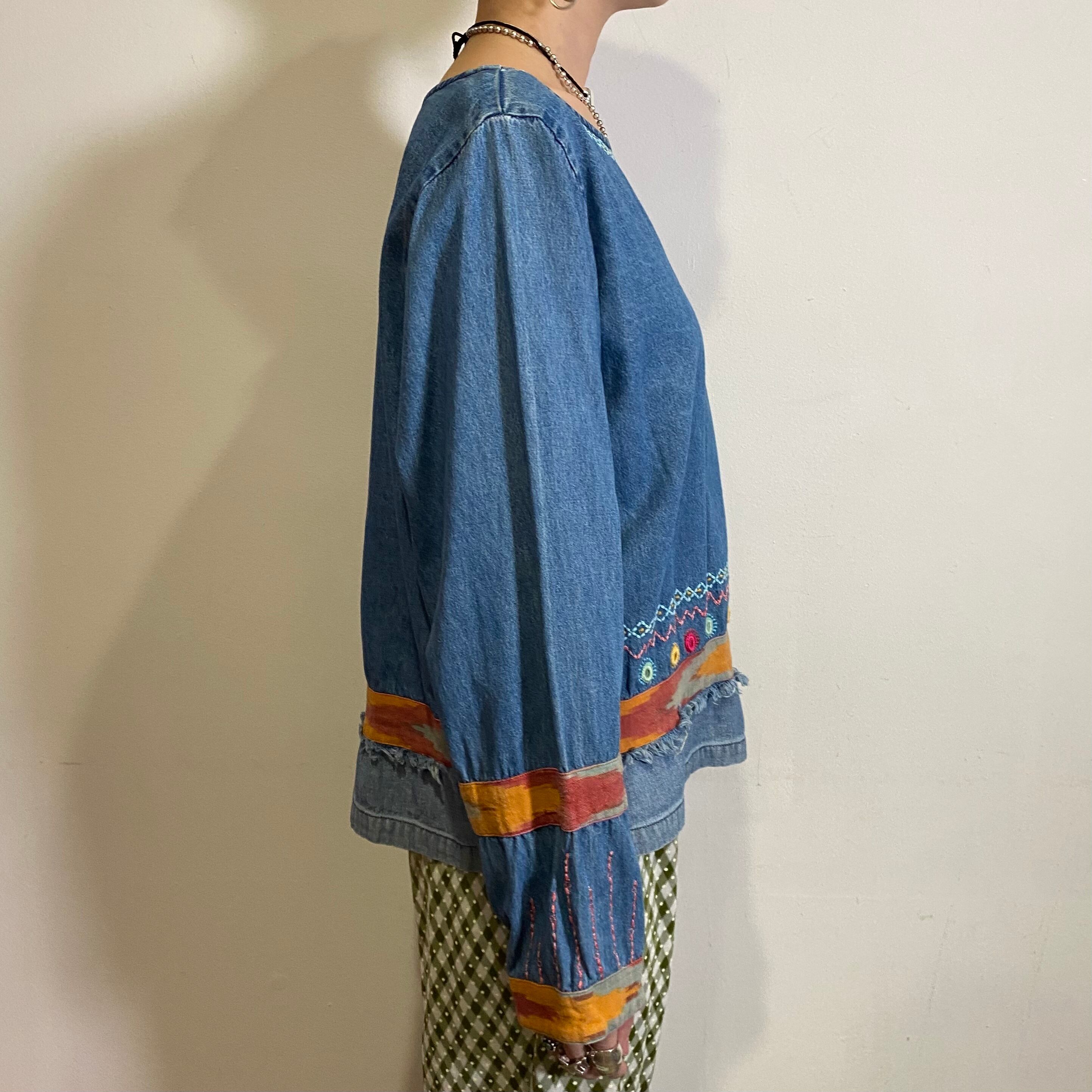 デニム地にカラフルな刺繍やミラーワークが施された長袖トップスです。