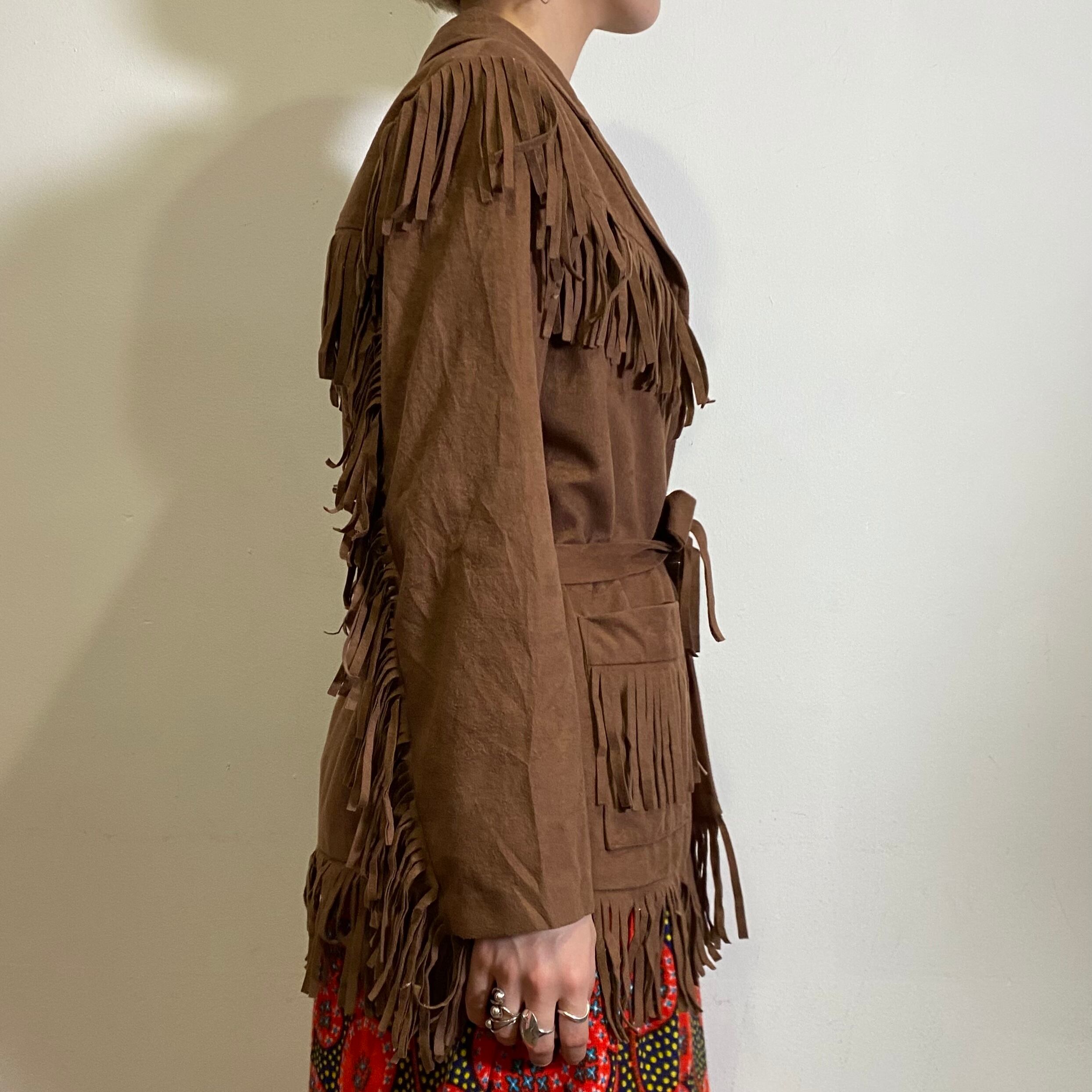 使い勝手の良いブラウンカラーに、たっぷりと付いたフリンジが可愛いジャケットです。