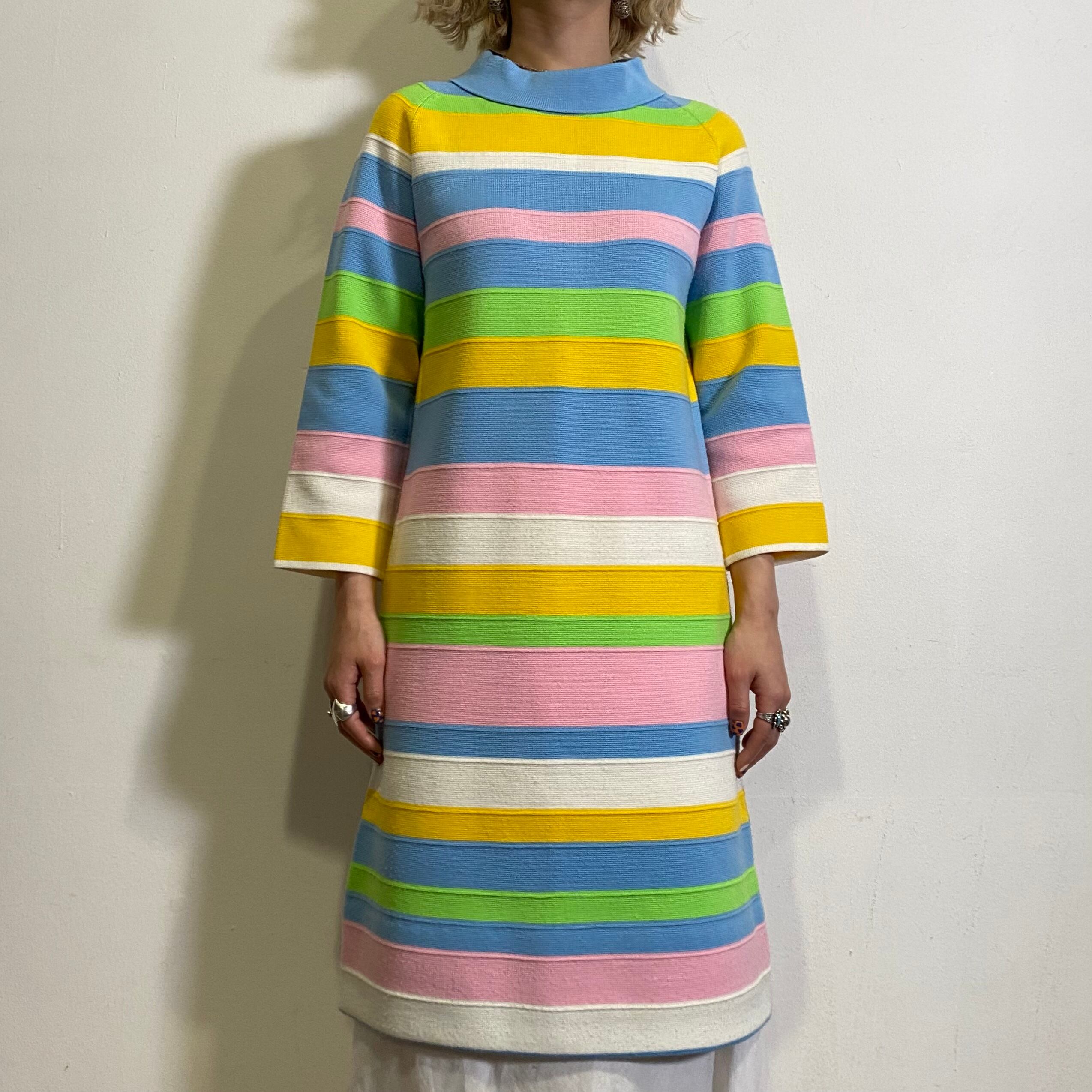 ハッピーなマルチパステルカラーのボーダーがかわいい、60年代のワンピースです。