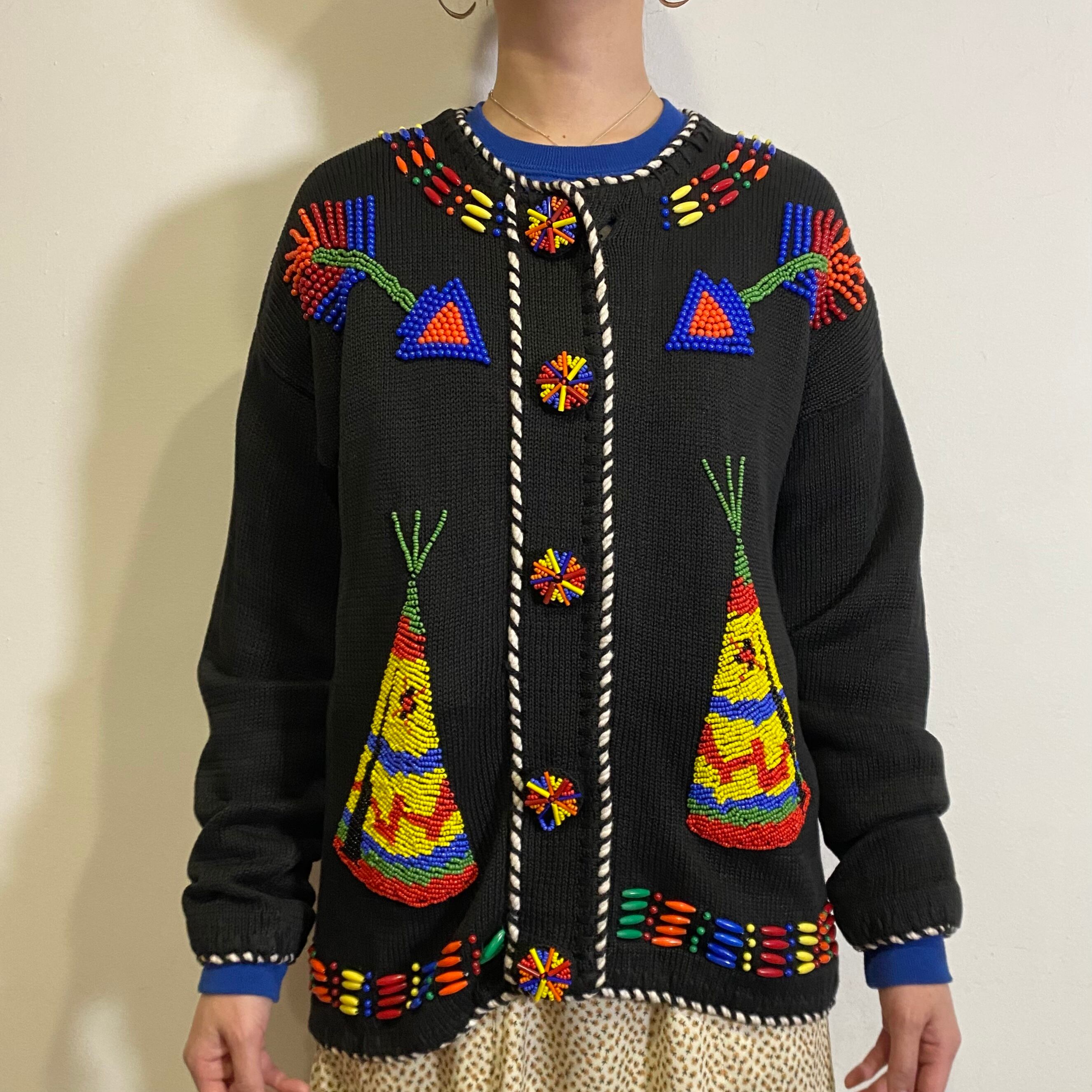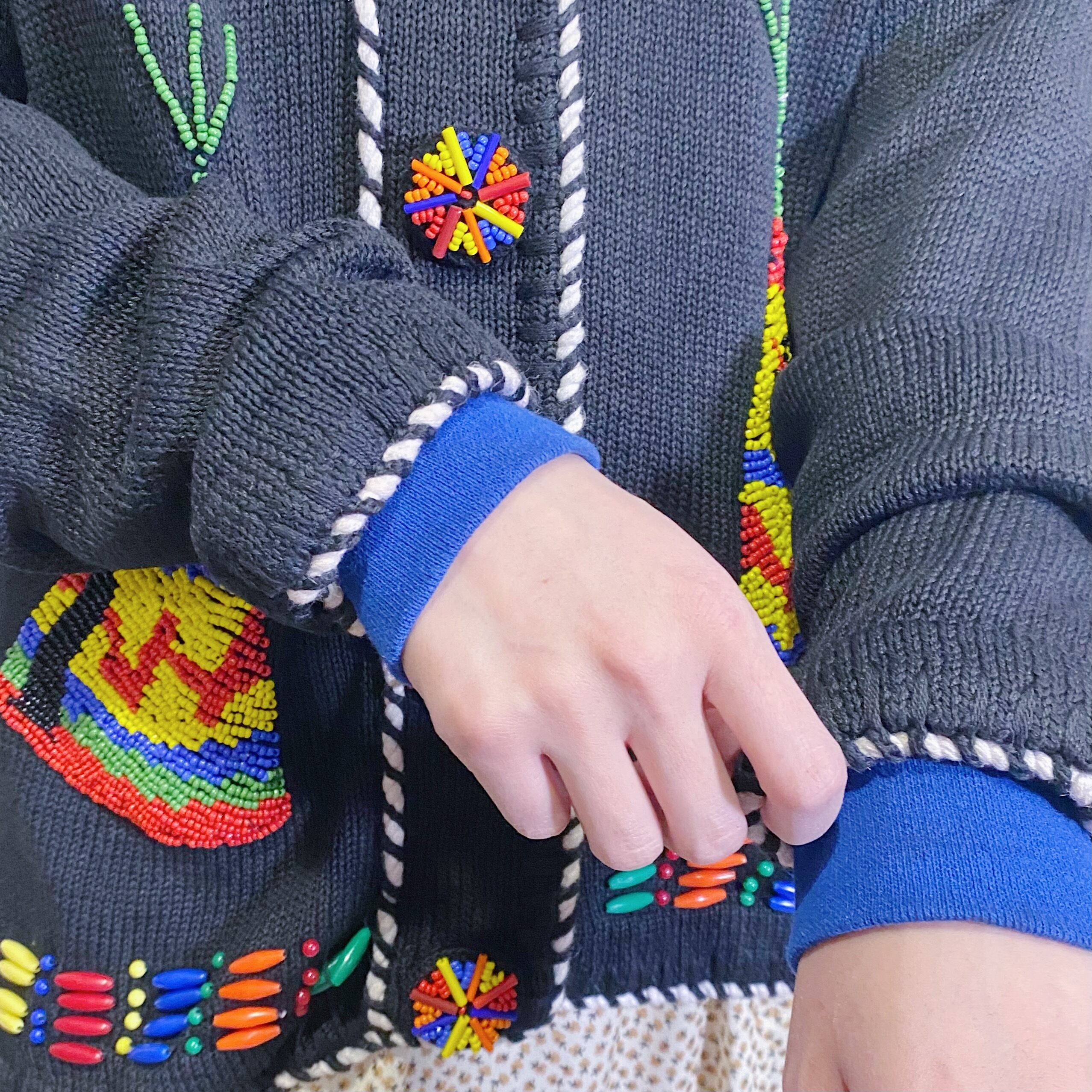 ブラックベースにカラフルなビーズがびっしりと施された豪華なコットンカーディガンです。