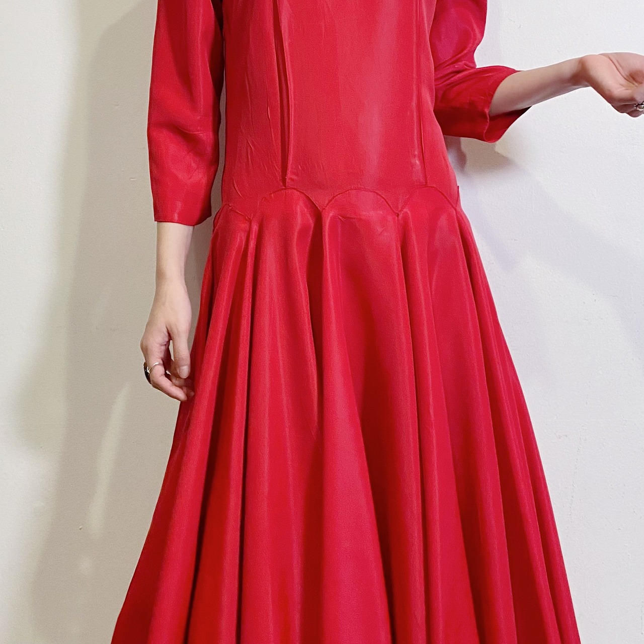 ぱっきりとしたレッドカラーとウエストのユニークな切り替えが可愛い、50年代のワンピースです。