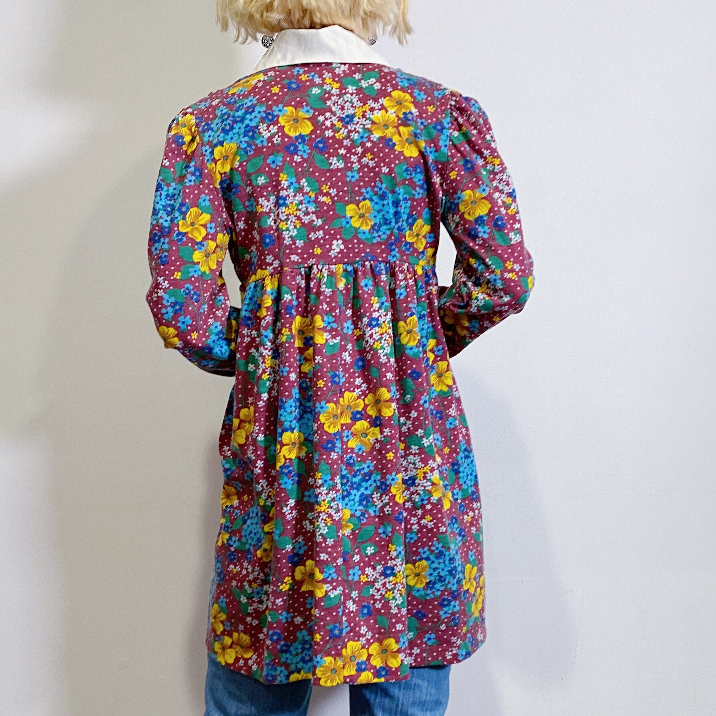 ボルドーベースに花柄やピンドットが可愛い、70年代のミニワンピースです。