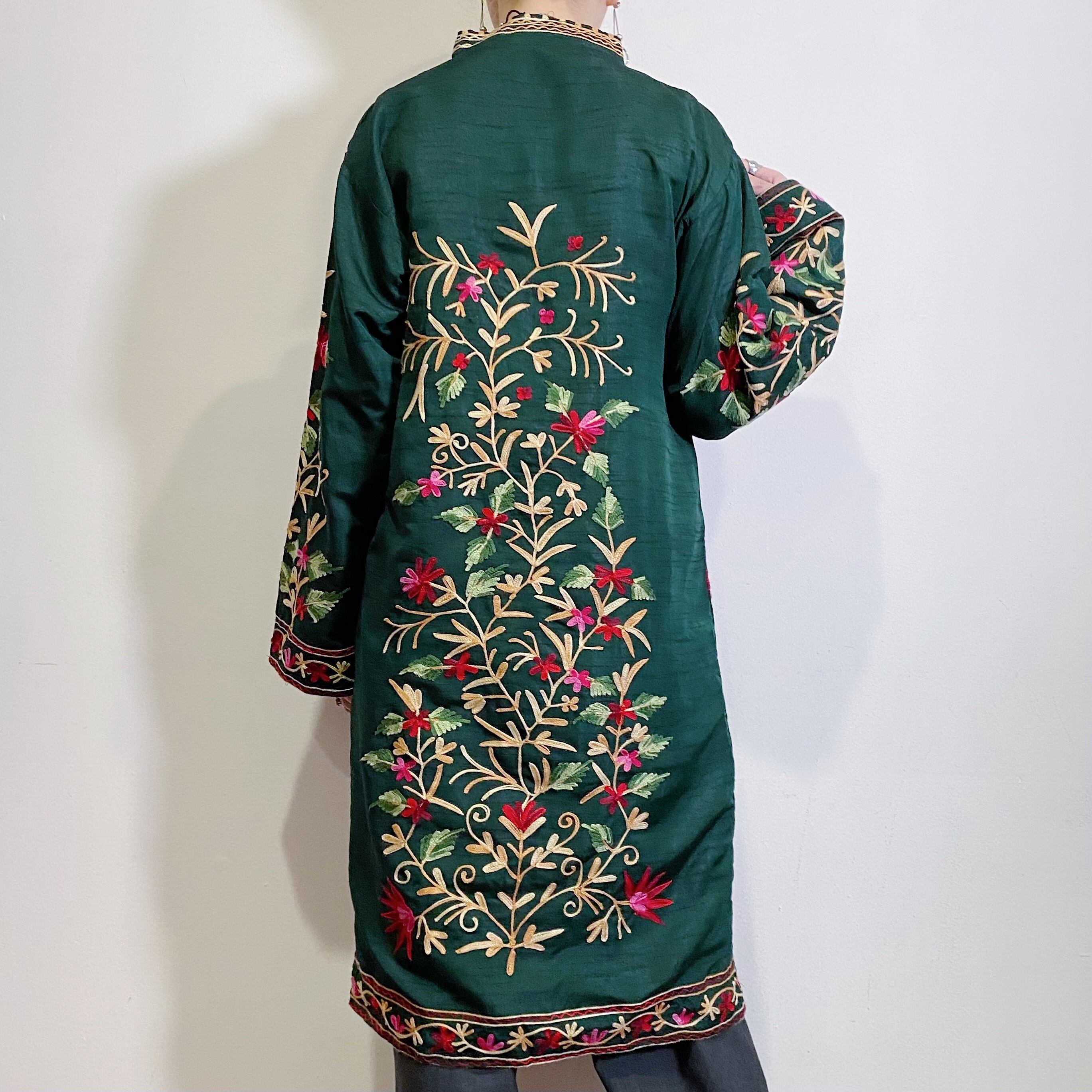 深めのグリーンベースで着こなしやすく、エスニックなムード漂う大人可愛い一枚。