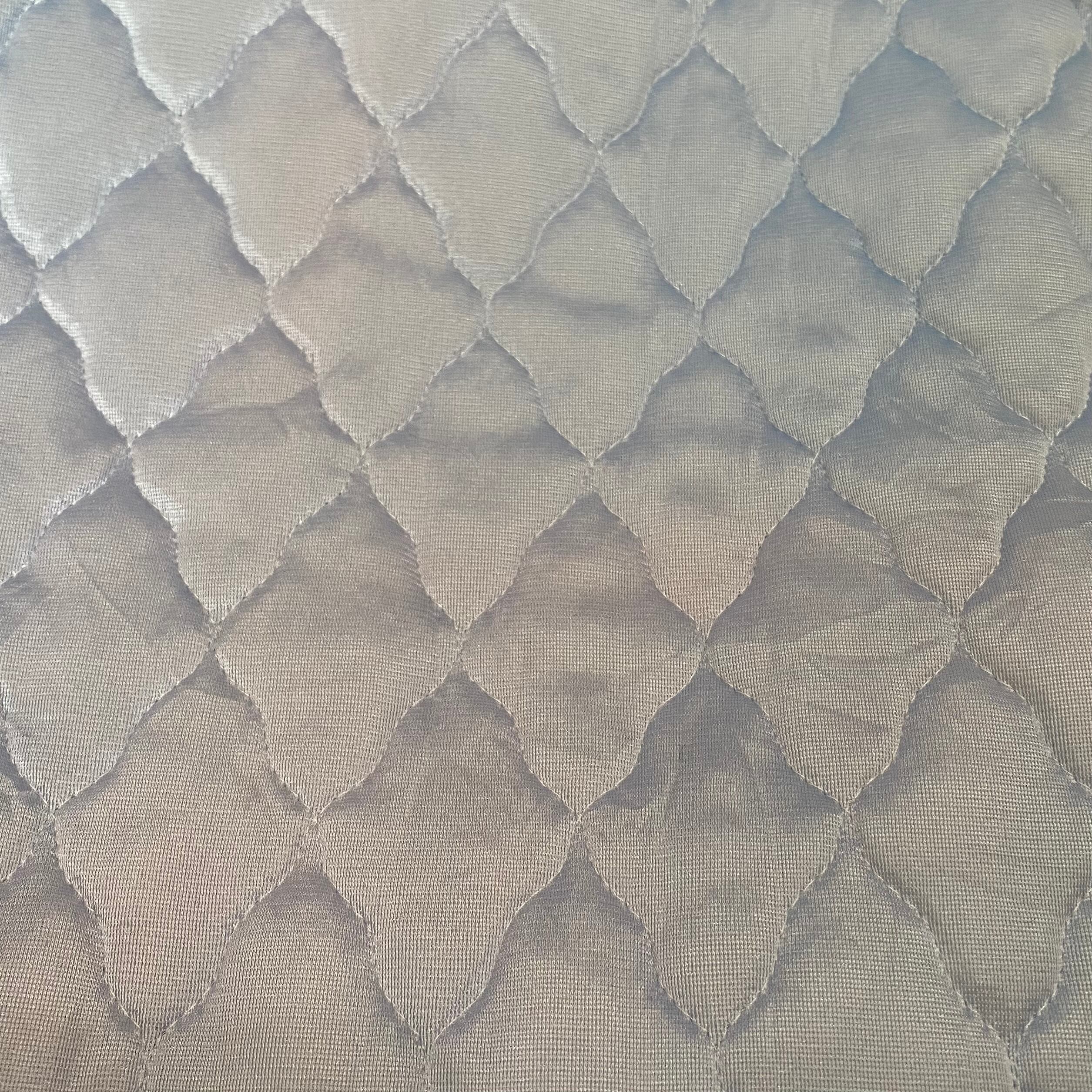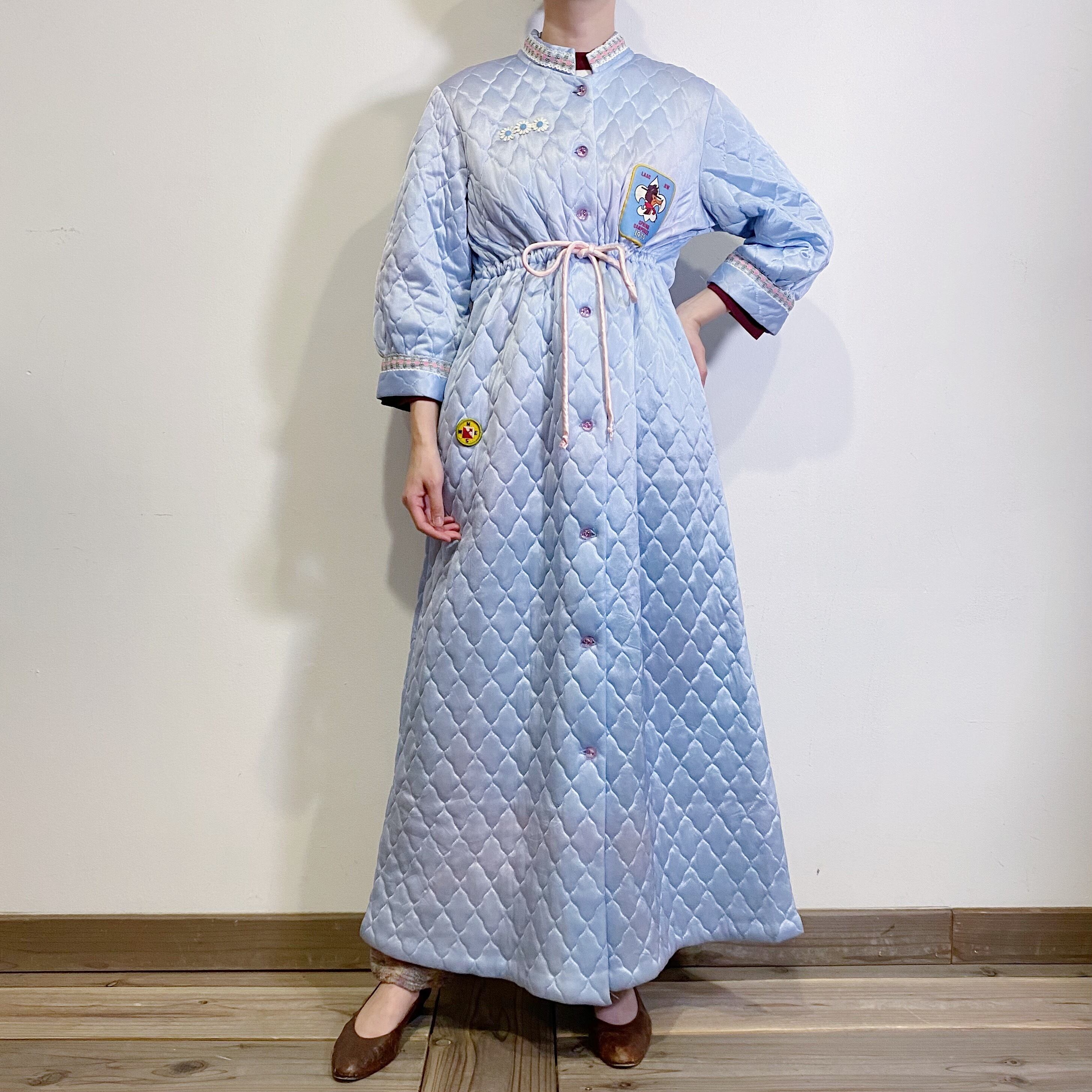 サテン素材の淡いサックスブルーカラーが素敵な、60~70年代のキルティングロングガウンです。