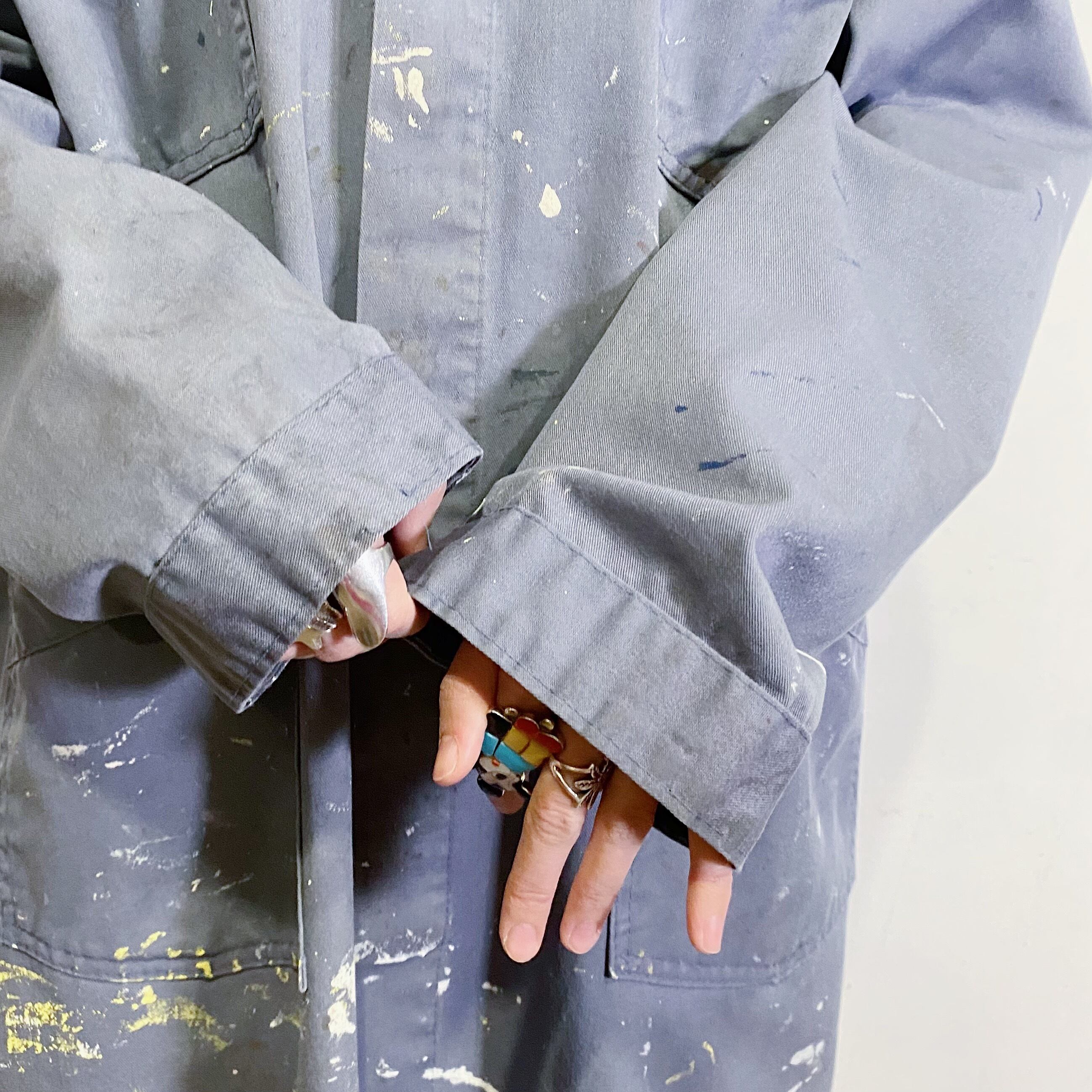 着こなしやすいグレーカラーに大きなポケット、そしてアジのあるペイントやヤレ感が魅力の一枚。