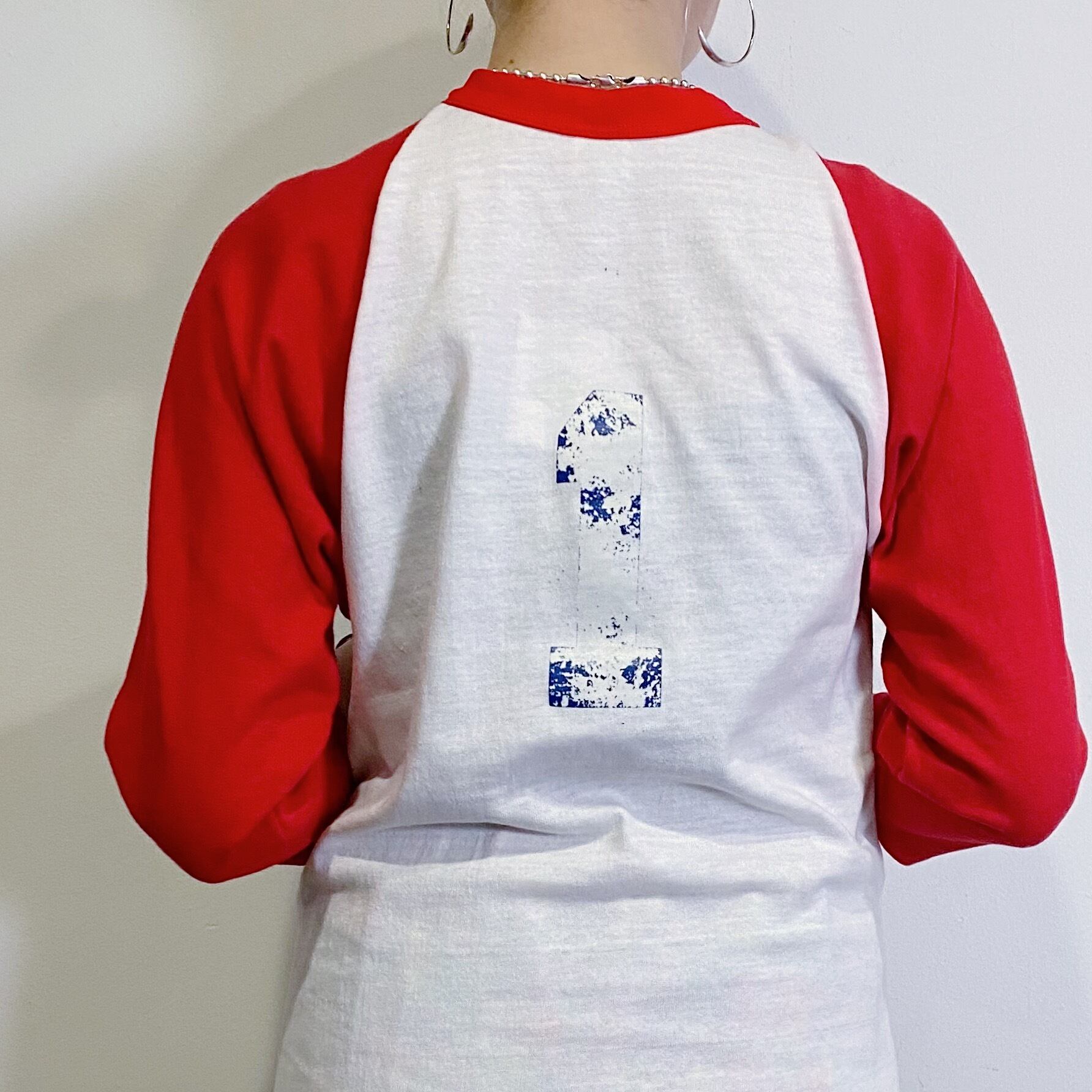 フロントのロゴとバックのナンバリングが可愛い、70年代のラグランTシャツです。