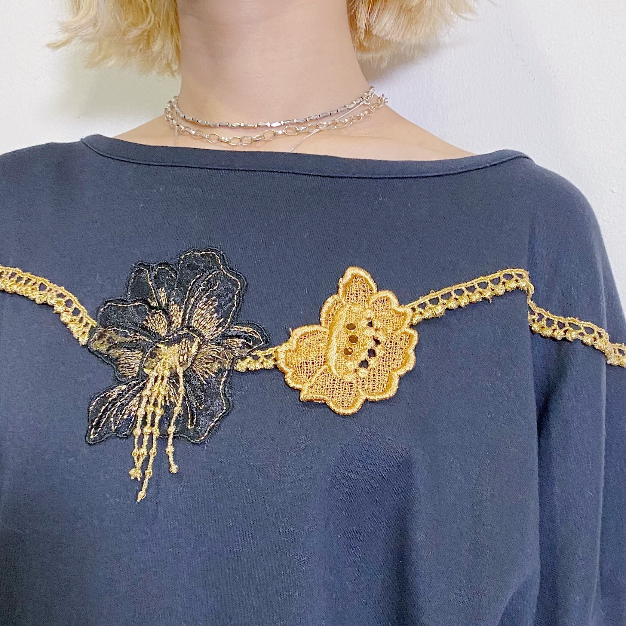 ブラックベースにゴールドのお花の装飾が映える、80年代のセットアップです。