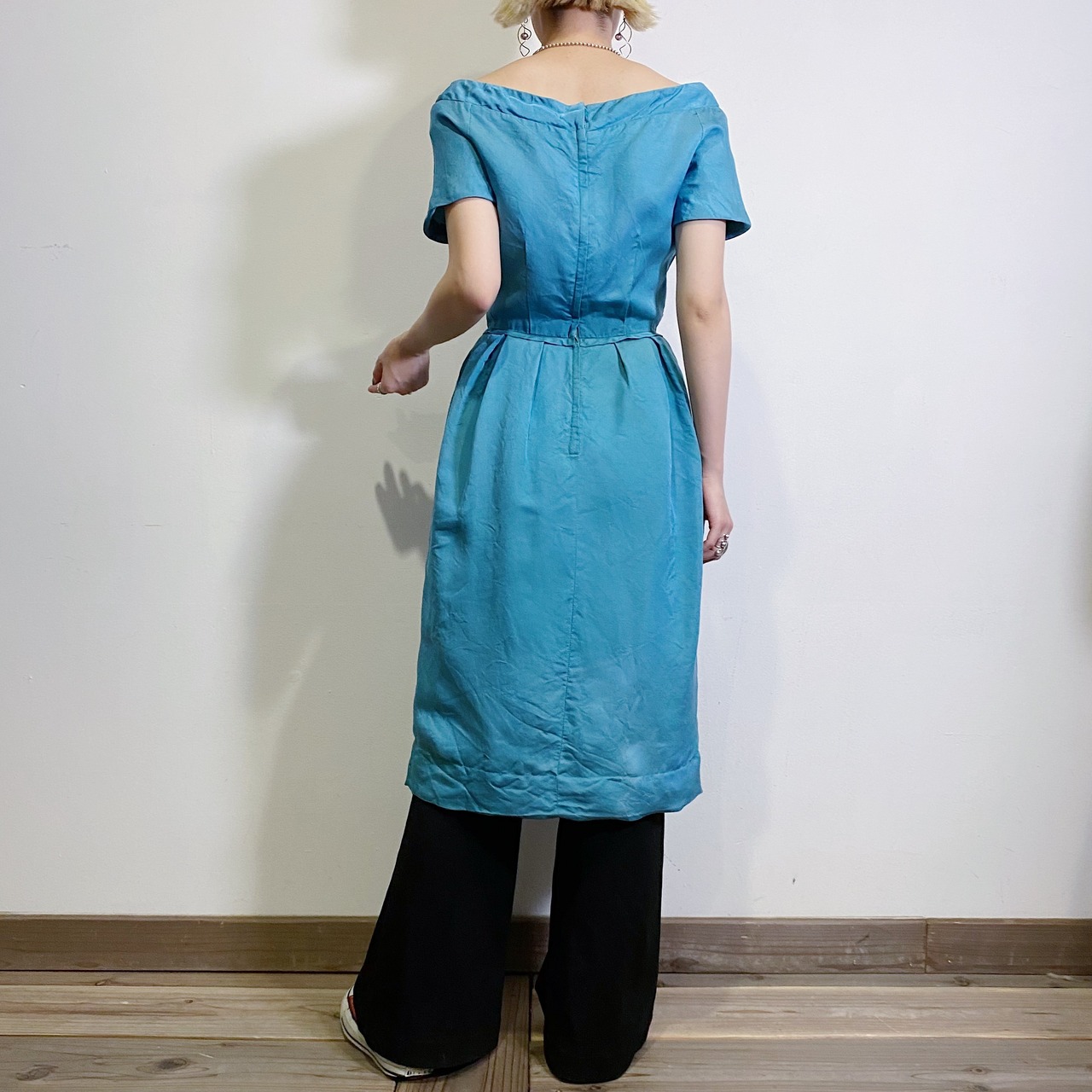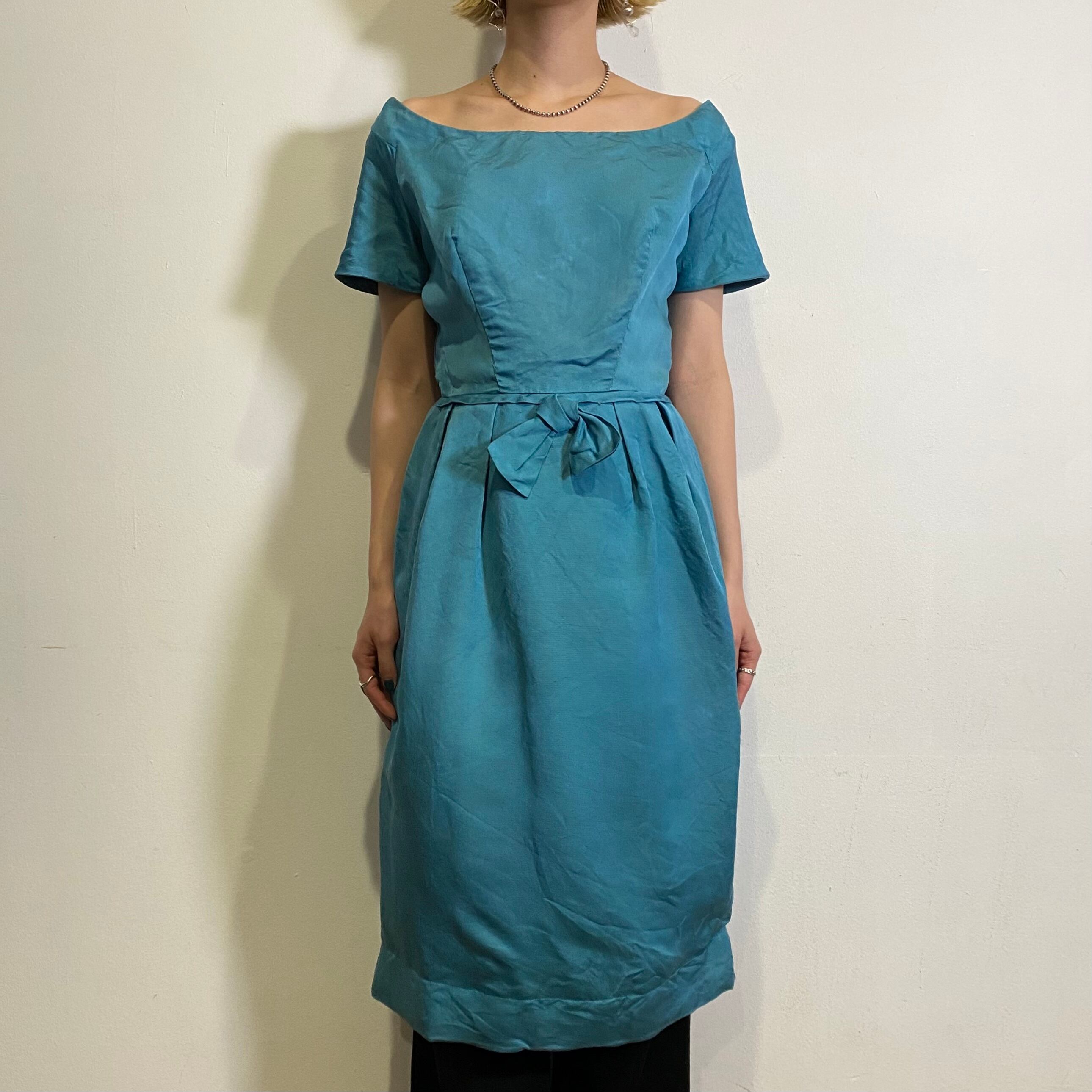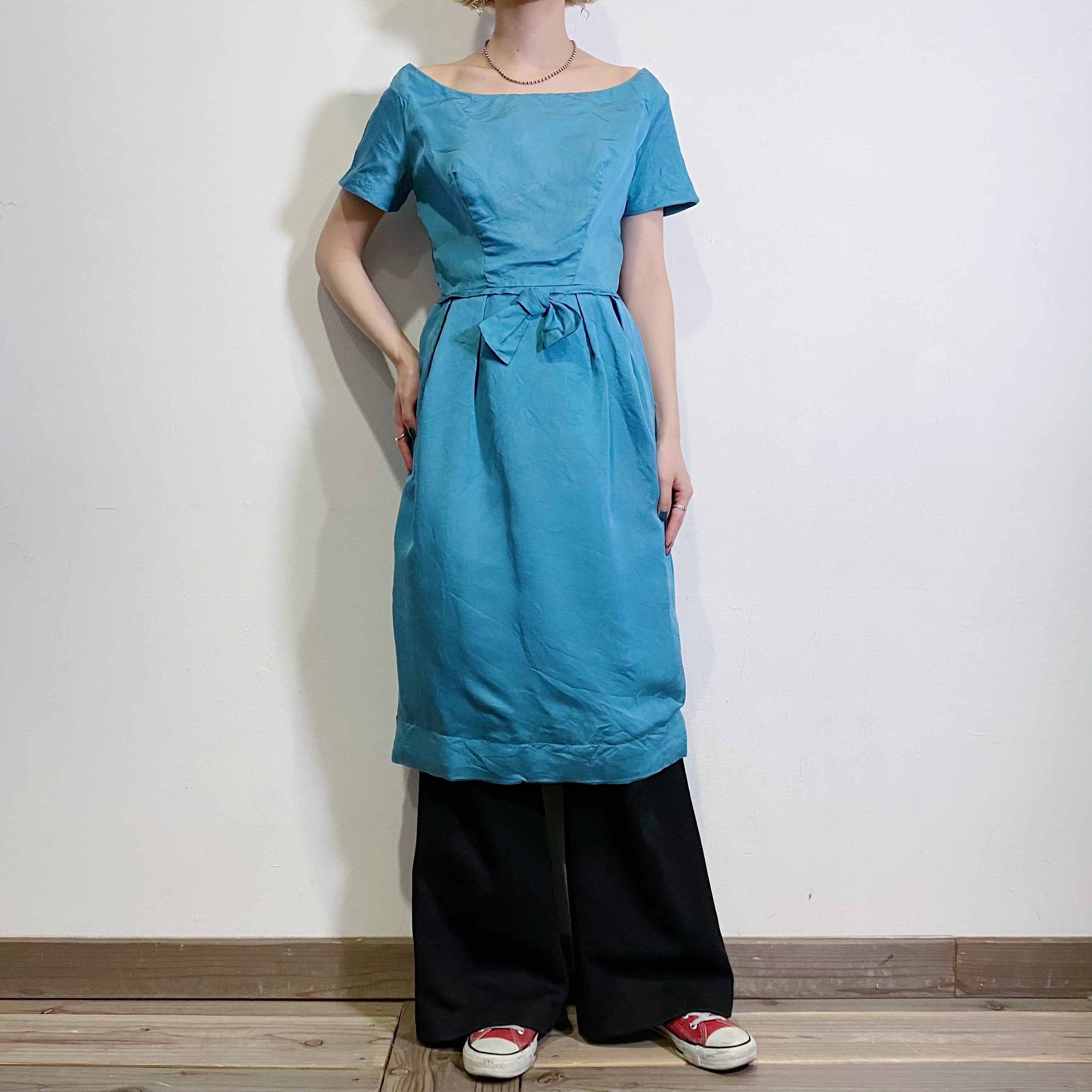 マリンブルーに腰のリボンが可愛い、50年代の半袖ワンピースです。