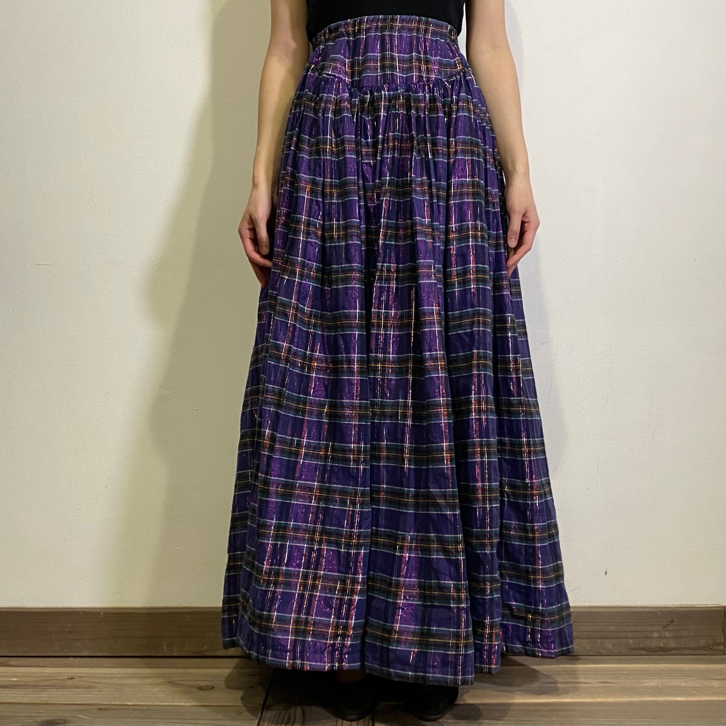 パープルベースにグリーンやゴールドの色合いが素敵な、70年代のロングスカートです。